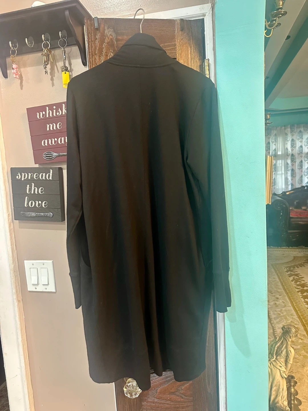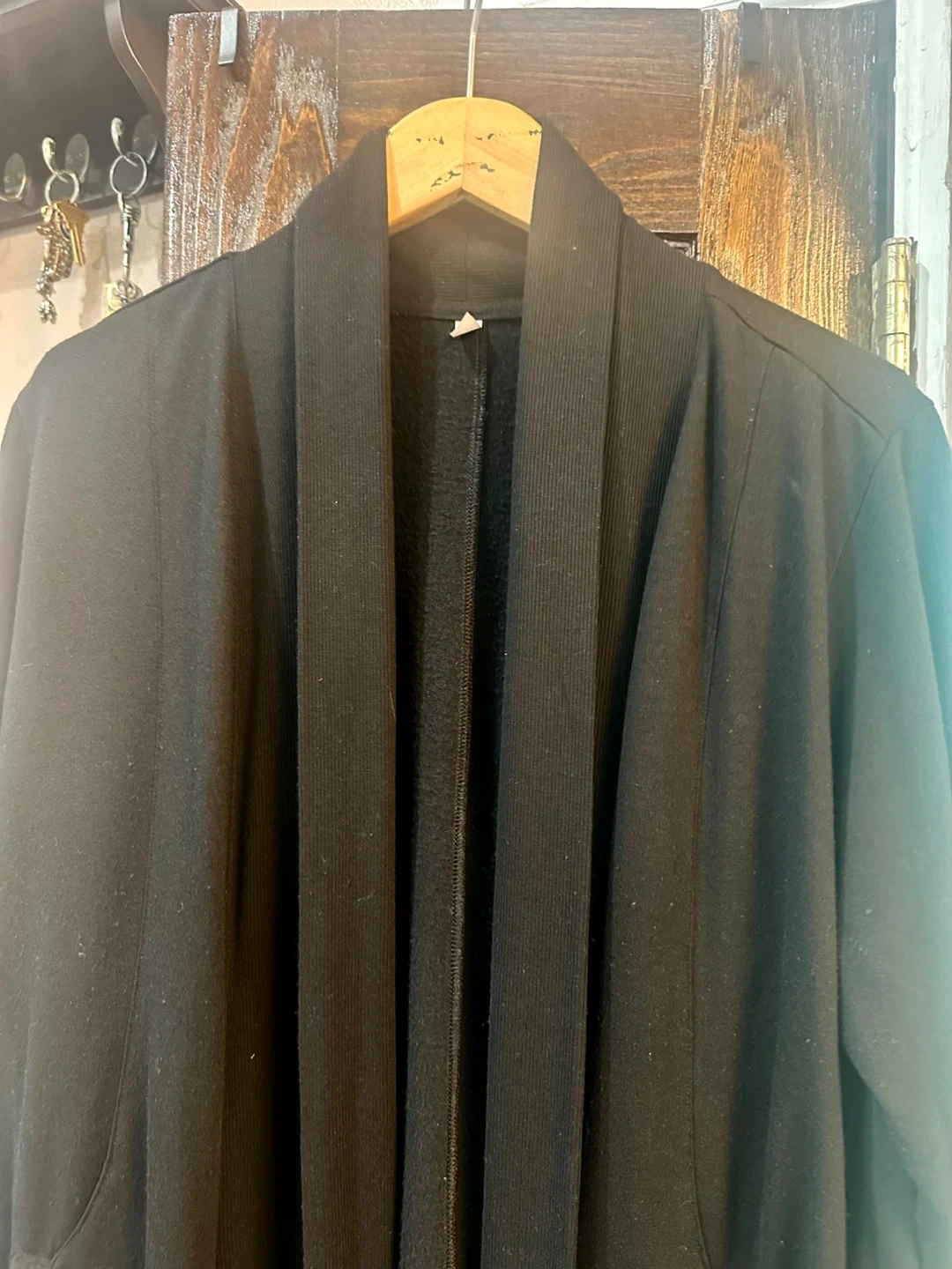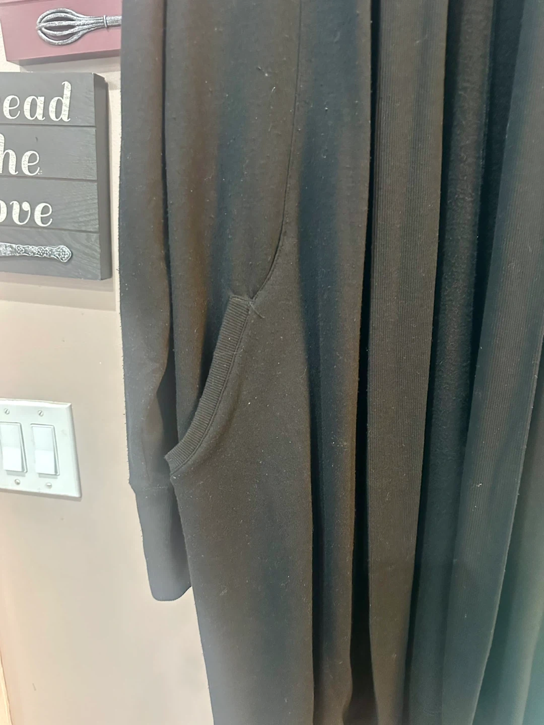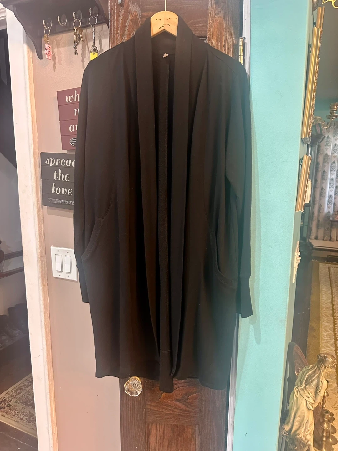 Selling a long, black cardigan with side pockets! It's in great condition and ready for a new home. Perfect for layering or just lounging around the house