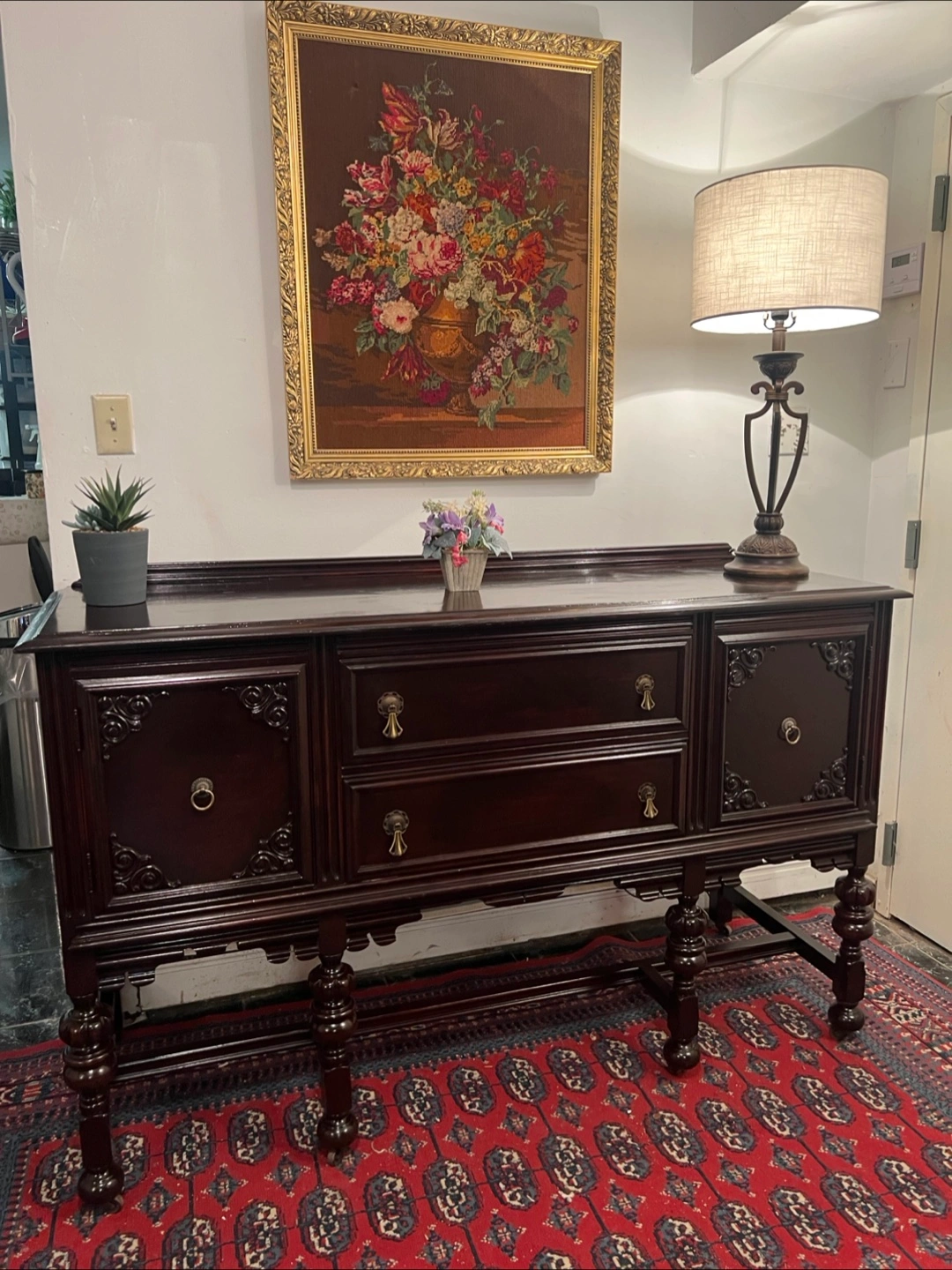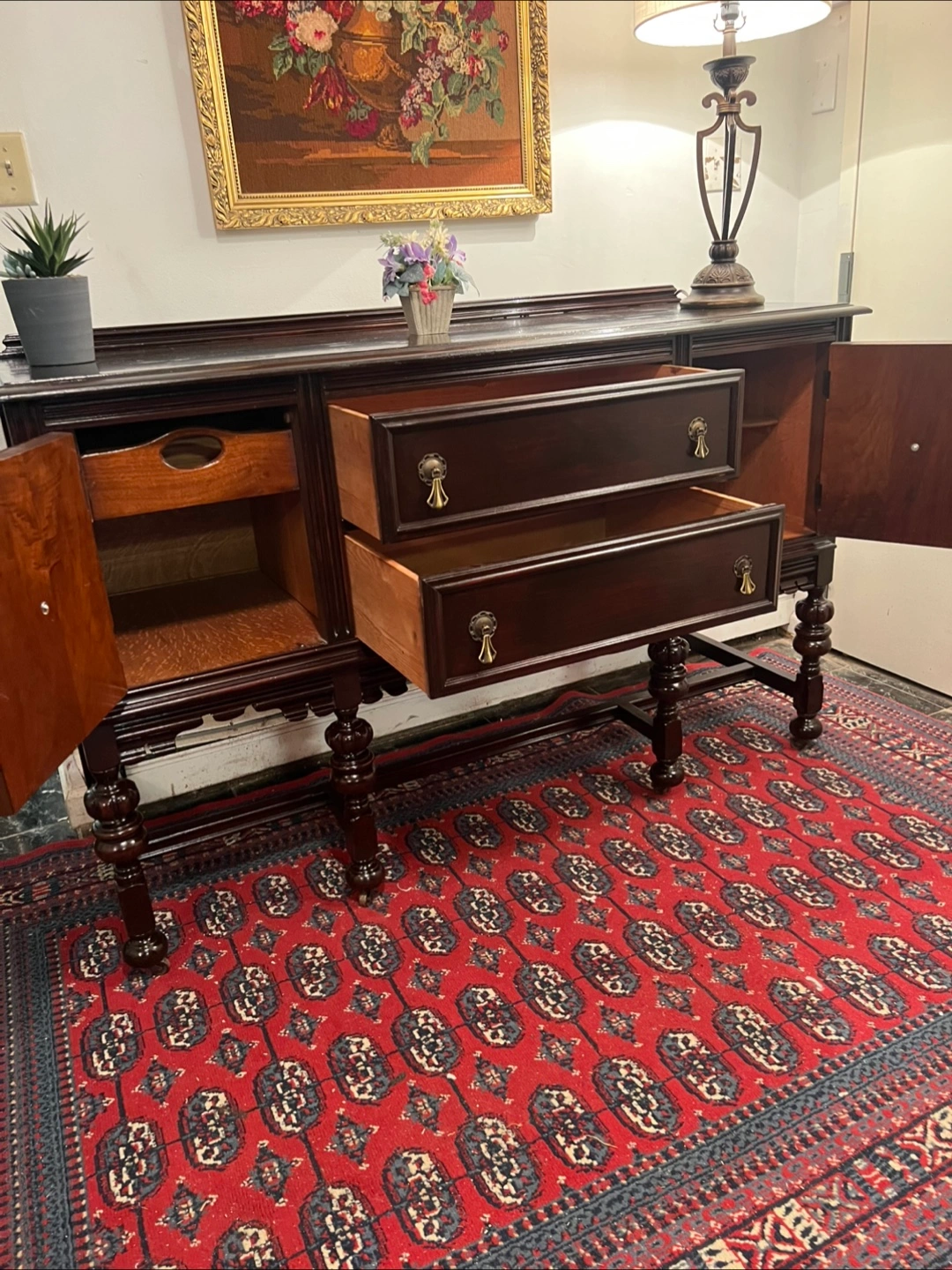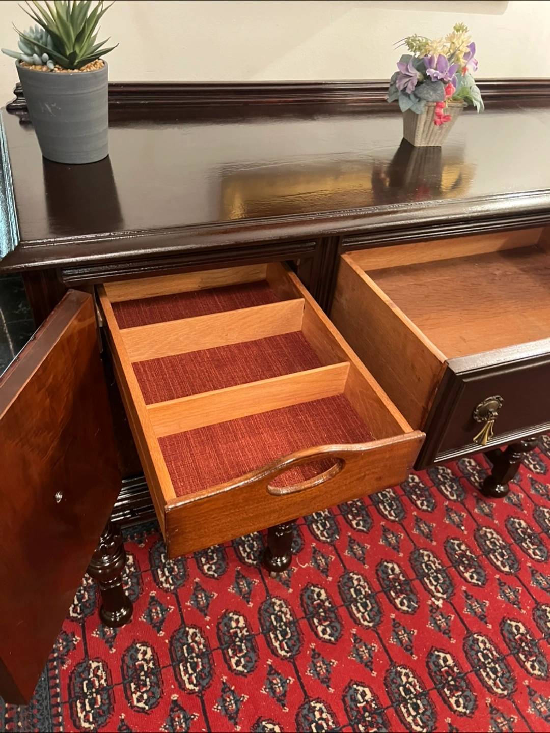 415I'm offering a beautiful vintage sideboard buffet, crafted lovingly from solid wood and finished in a warm black cherry stain. This charming piece is designed to bring a rich, inviting atmosphere to your home. It includes six small wheels for easy movement, making it simple to rearrange as needed. The sideboard features two spacious drawers and two thoughtfully designed cabinets with dividers, perfect for keeping your organized and cherished belongings in order. While it may showcase some minor cosmetic imperfections, it remains sturdy and intact, ready for a new home. Dimensions: 21” (D) x 60” (W) x 39” (H) For your convenience, I’m also able to offer delivery for an additional fee based on your location. I accept payments through cash, Venmo, Zelle, or CashApp, making the process as easy as possible for you. I truly hope you consider bringing this elegant vintage buffet into your space. It could add a lovely touch to your home!