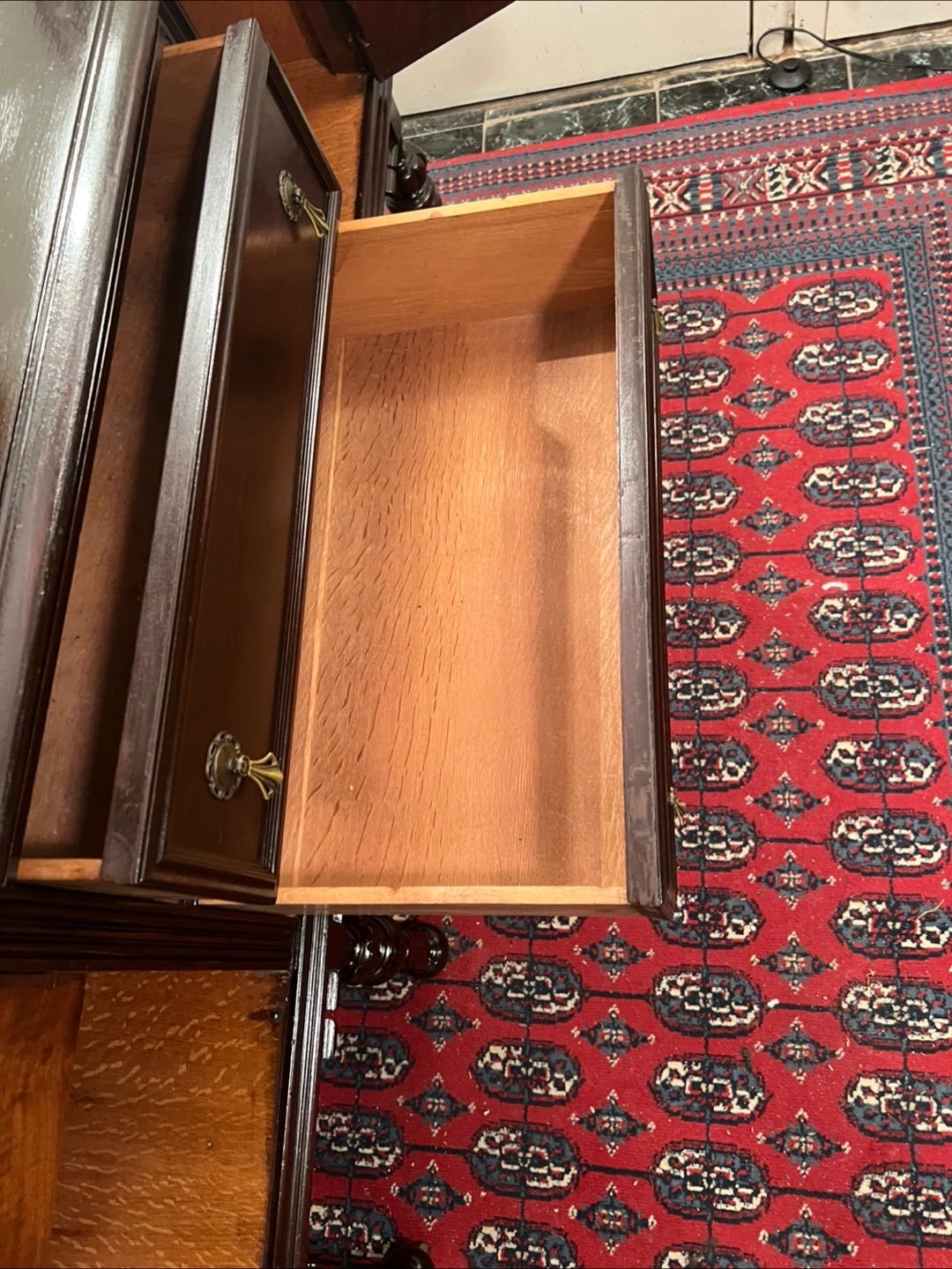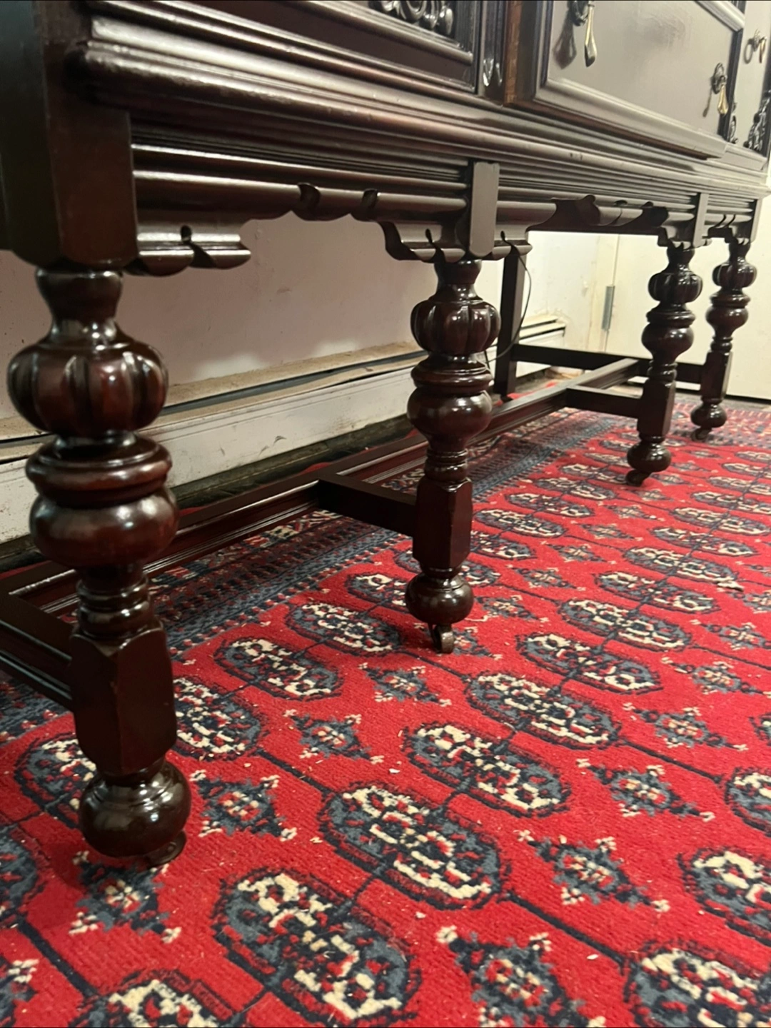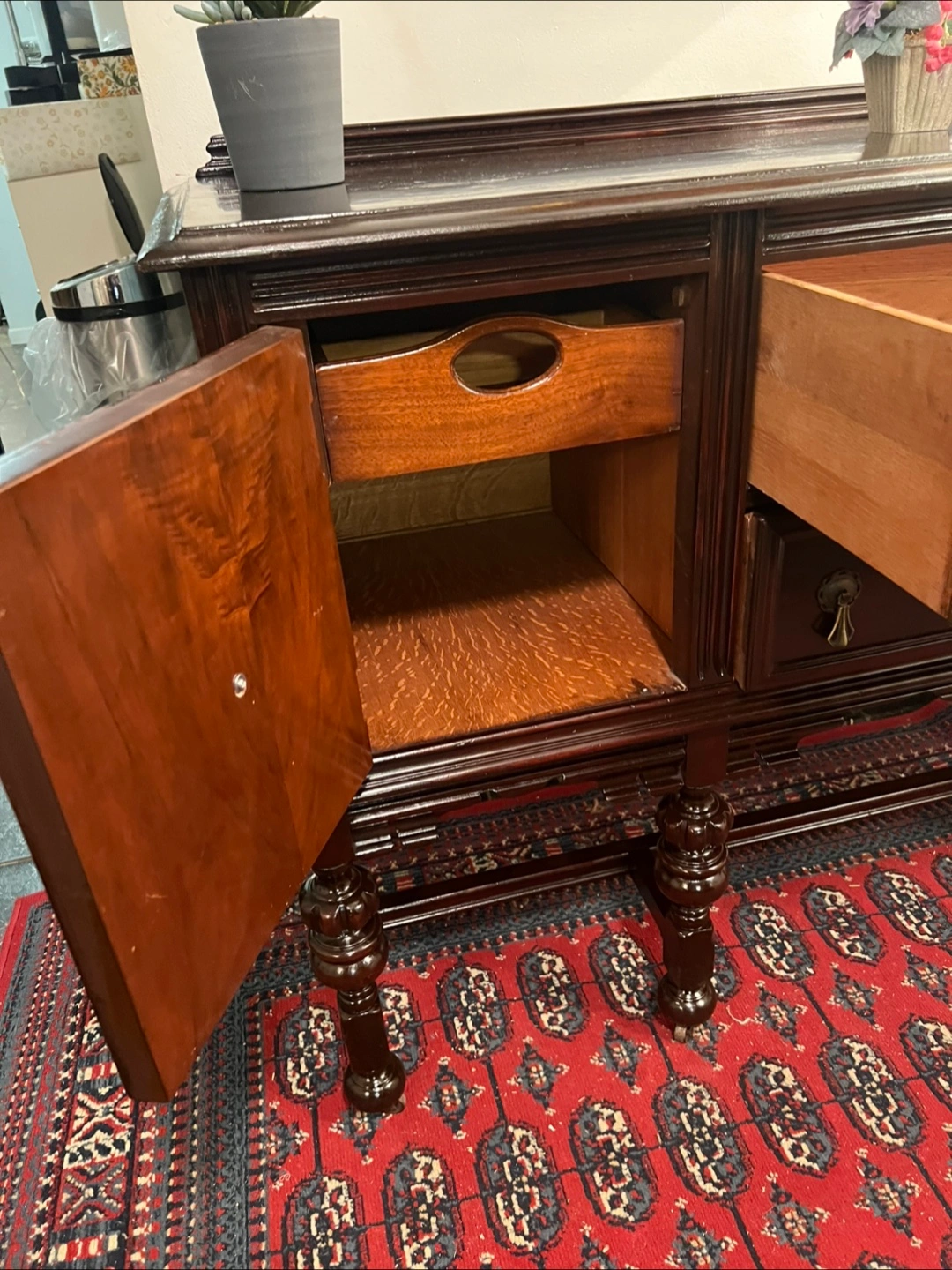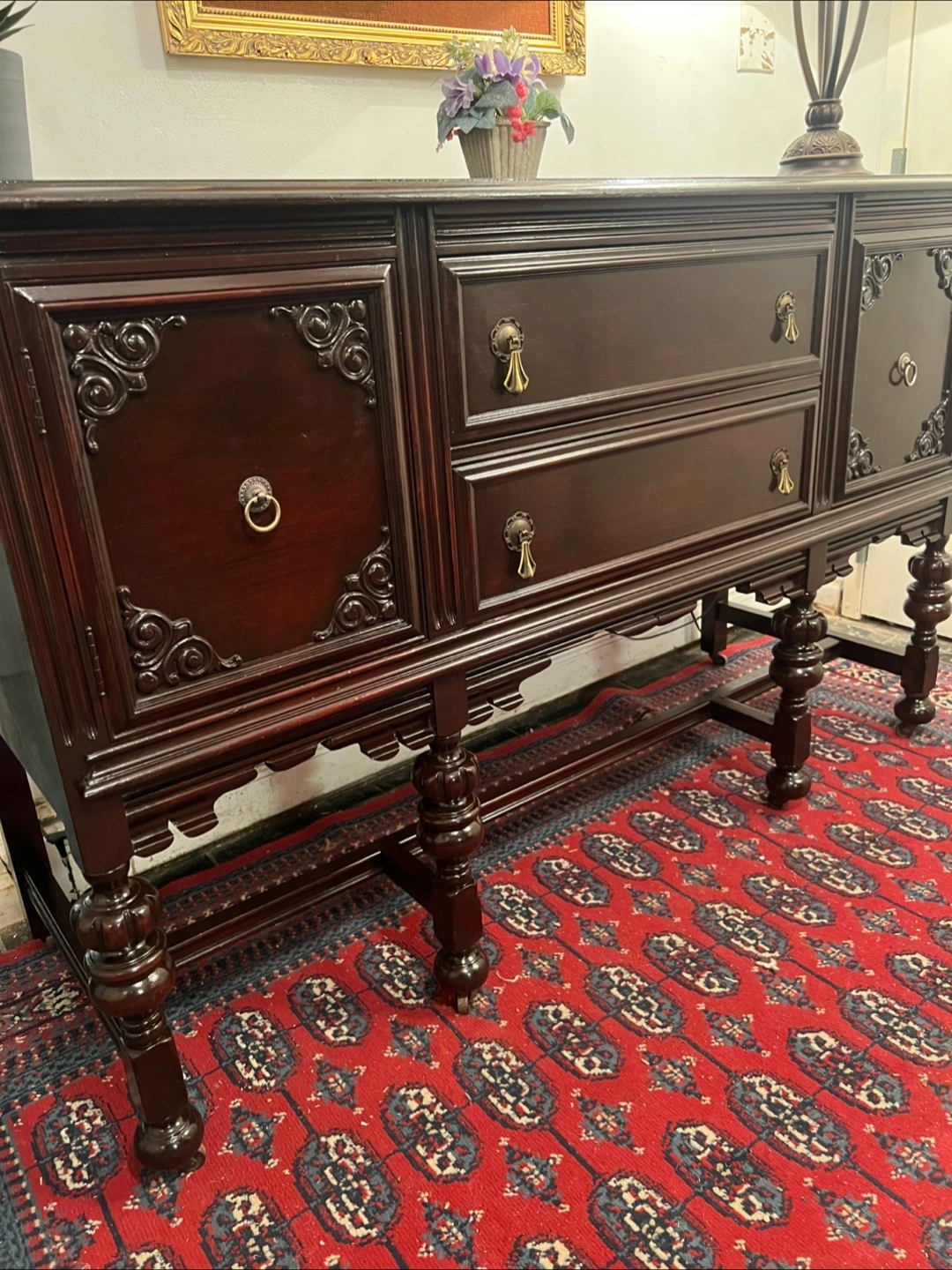 415I'm offering a beautiful vintage sideboard buffet, crafted lovingly from solid wood and finished in a warm black cherry stain. This charming piece is designed to bring a rich, inviting atmosphere to your home. It includes six small wheels for easy movement, making it simple to rearrange as needed. The sideboard features two spacious drawers and two thoughtfully designed cabinets with dividers, perfect for keeping your organized and cherished belongings in order. While it may showcase some minor cosmetic imperfections, it remains sturdy and intact, ready for a new home. Dimensions: 21” (D) x 60” (W) x 39” (H) For your convenience, I’m also able to offer delivery for an additional fee based on your location. I accept payments through cash, Venmo, Zelle, or CashApp, making the process as easy as possible for you. I truly hope you consider bringing this elegant vintage buffet into your space. It could add a lovely touch to your home!