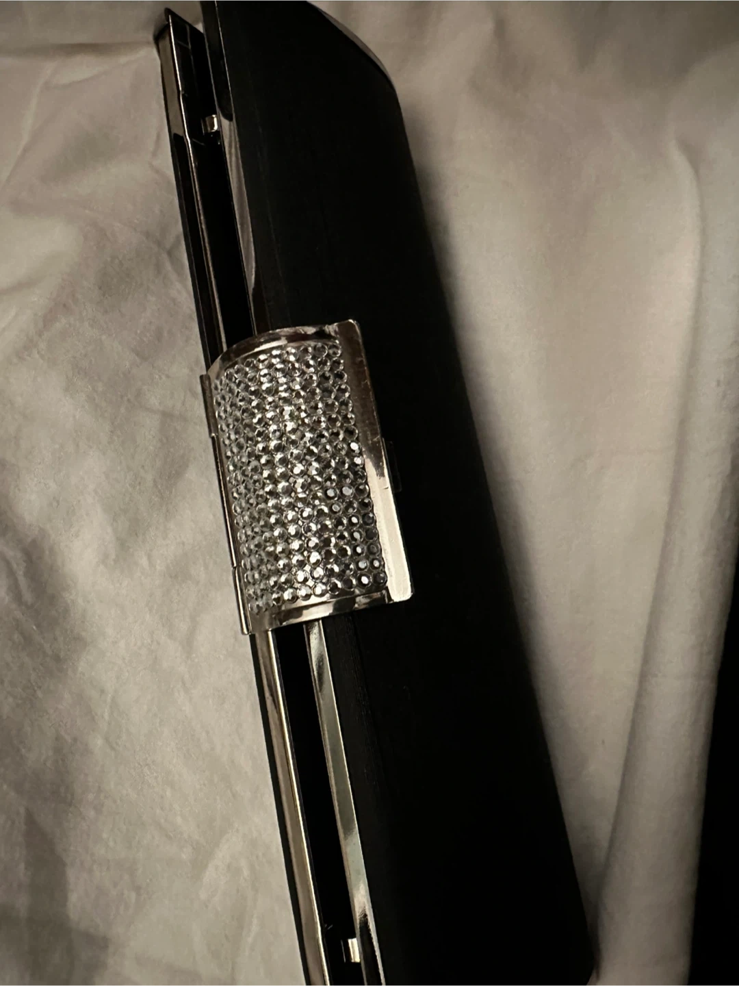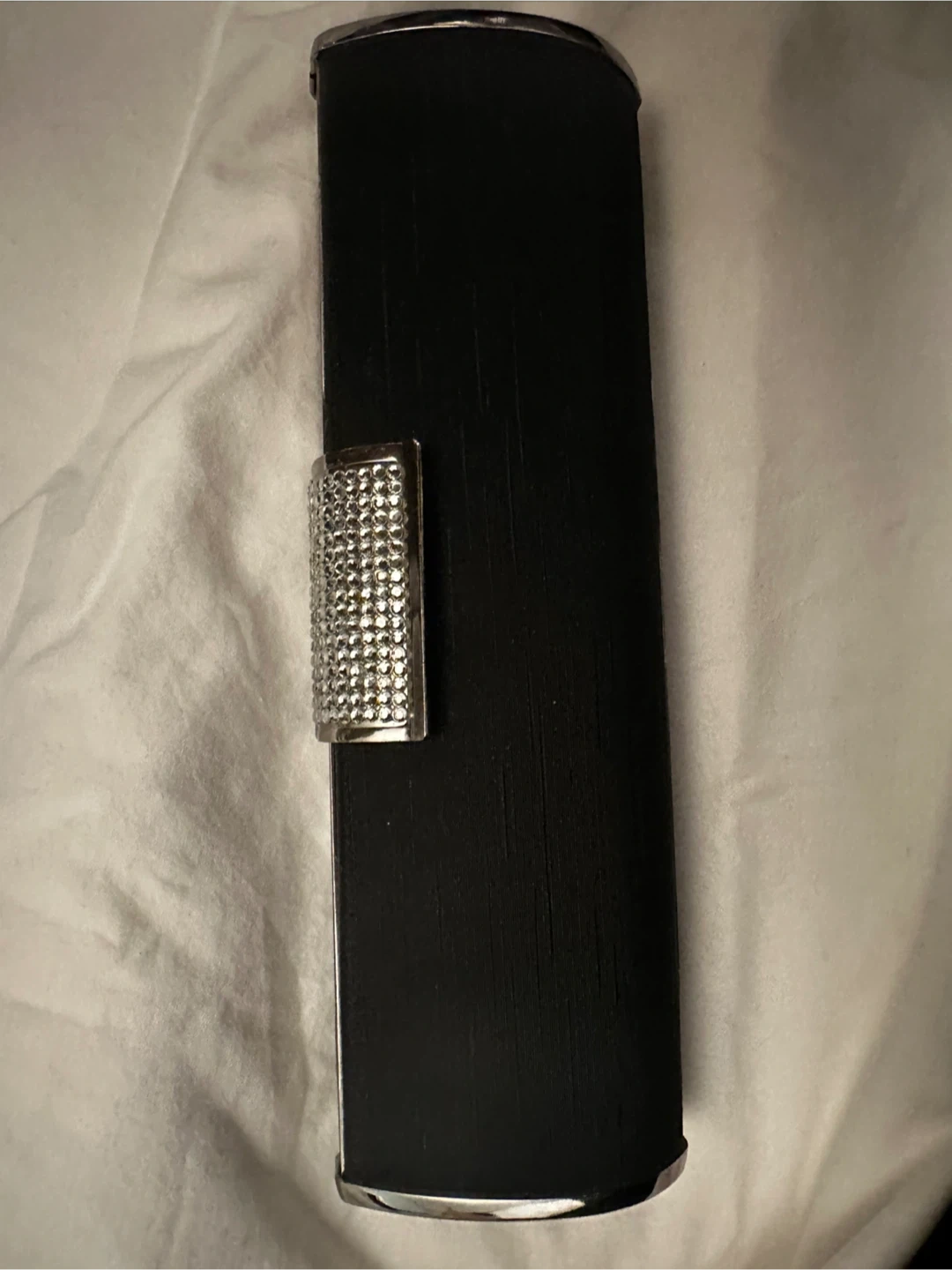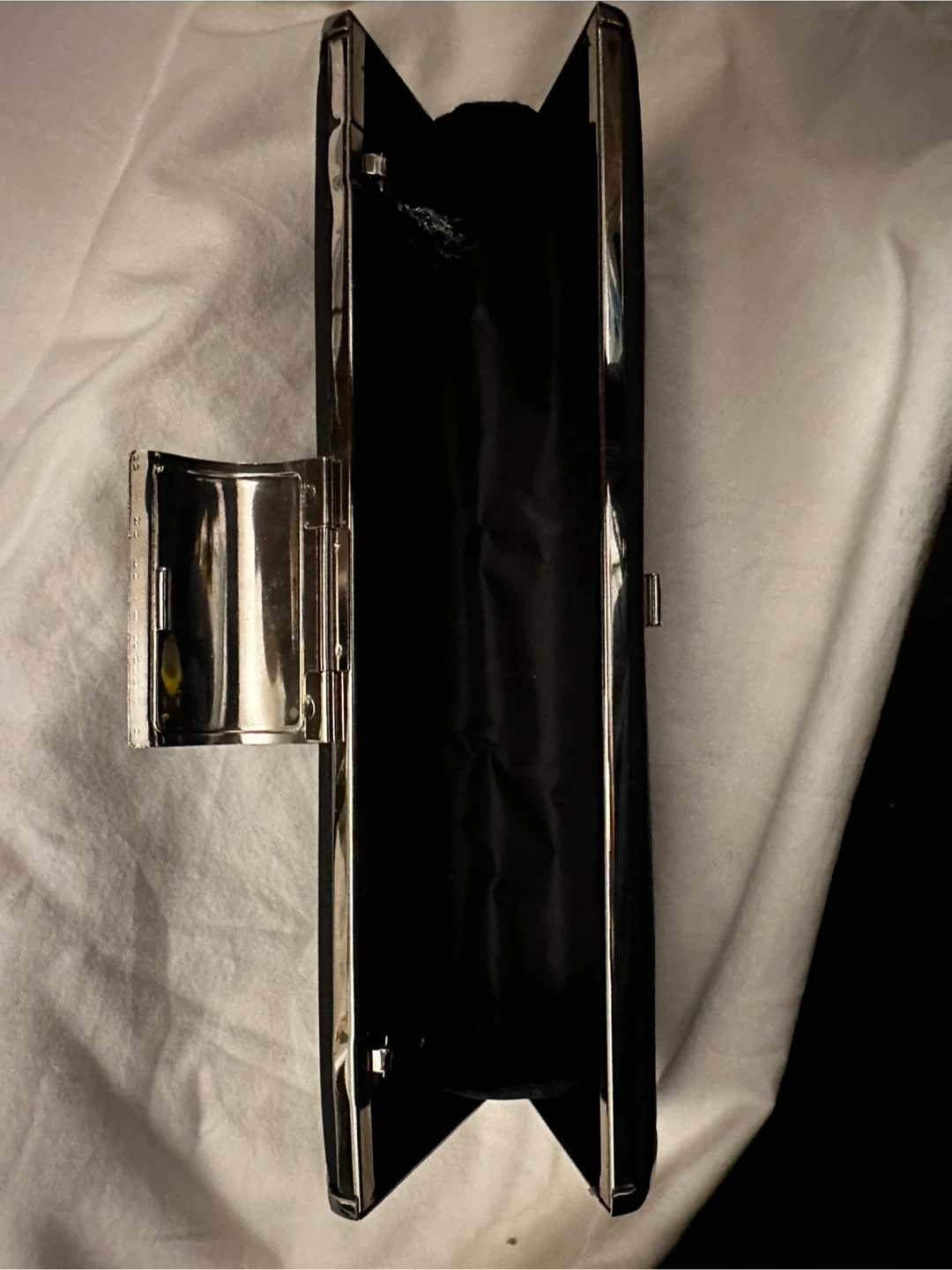 10I'm selling a black clutch purse. It has a silver clasp with rhinestones. It's in great condition and perfect for a night out! No chain, but it can be used with one