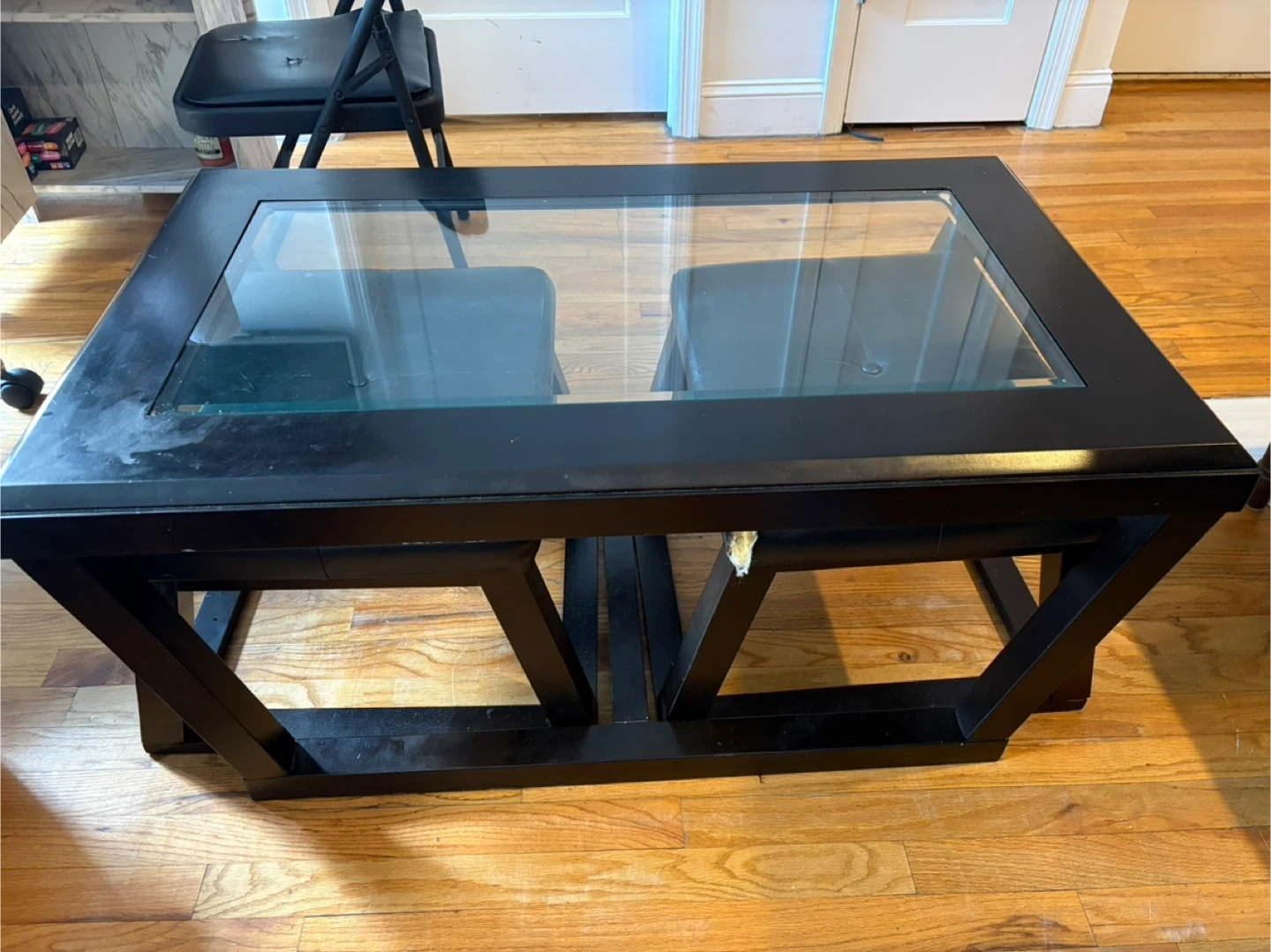 Buy & SellBlack Coffee Table with Glass Top and chairsBlack Coffee Table with Glass Top and chairs$49Selling a black coffee table featuring a glass top. It's sturdy and has a unique design with the supports underneath. Perfect for any living room!ConditionOkay0 chats·0 favorites·20 viewsSELLERMarcoChelsea100 reviewsWHERE TO MEETCheck Location