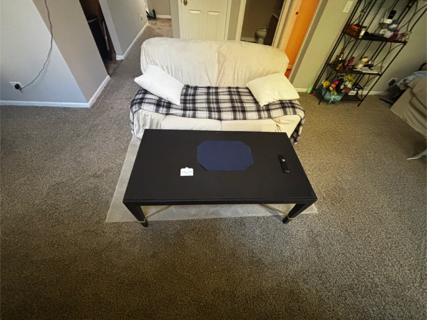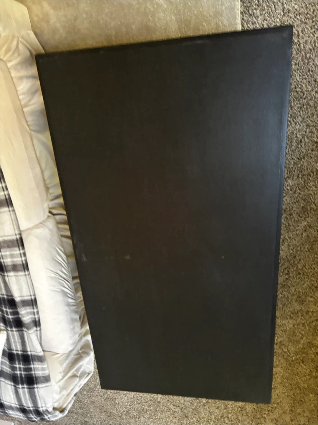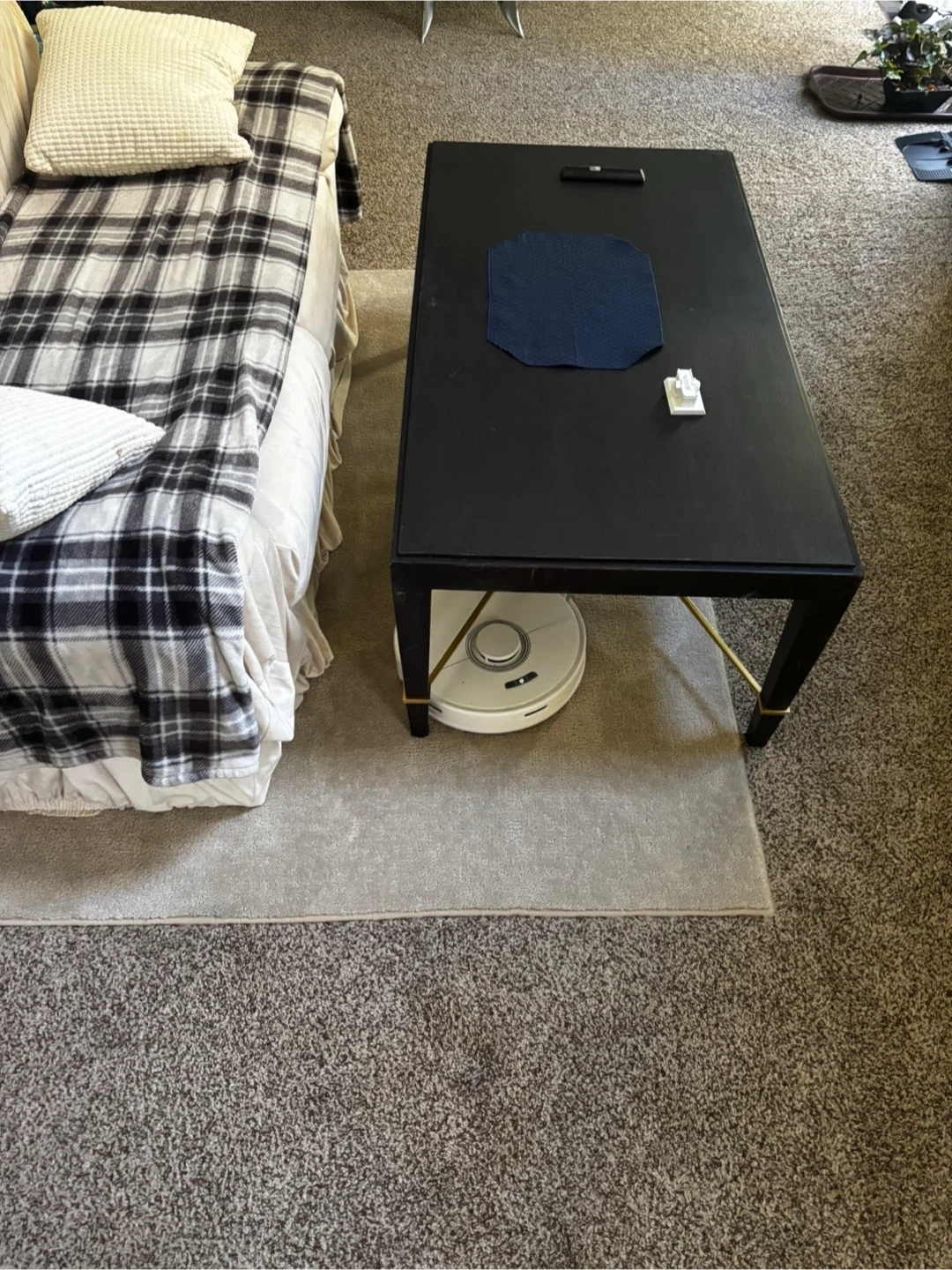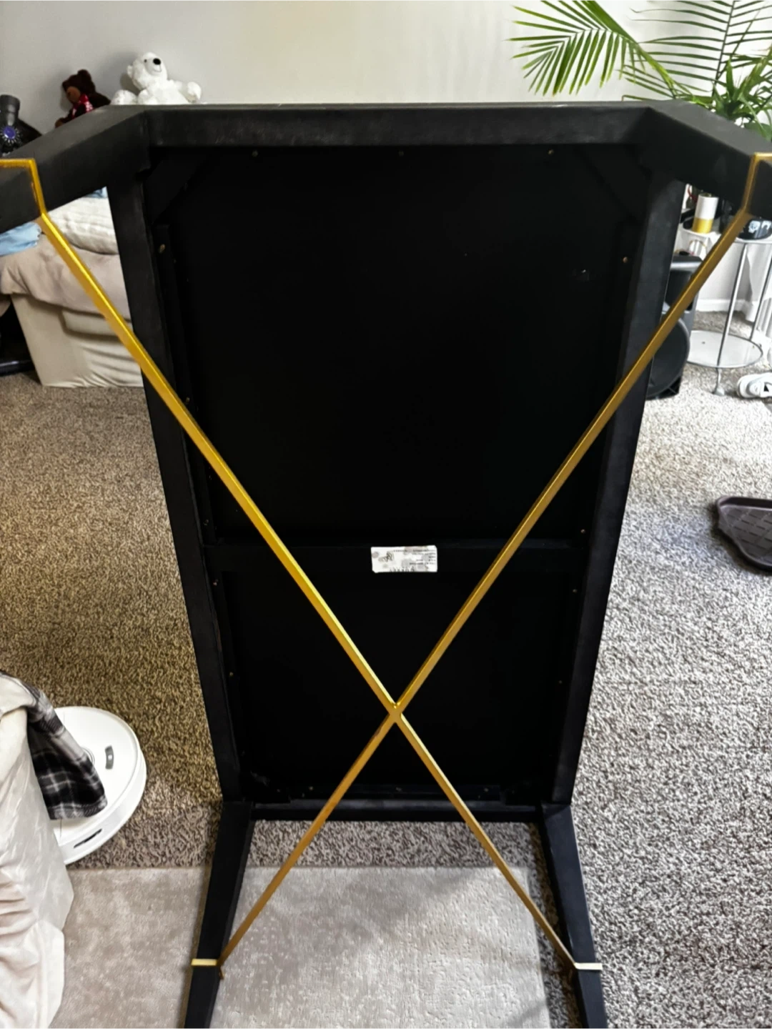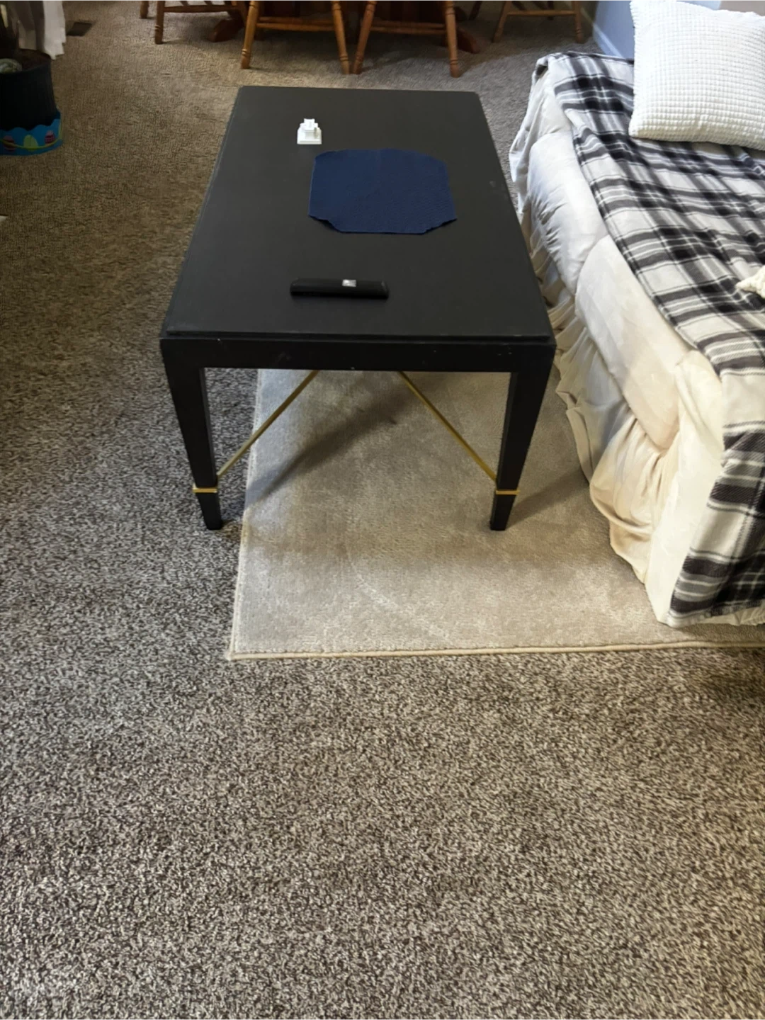 5Selling a black coffee table. The table has a rectangular shape with gold accents on the legs. It's a simple yet stylish piece that can complement various living room setups