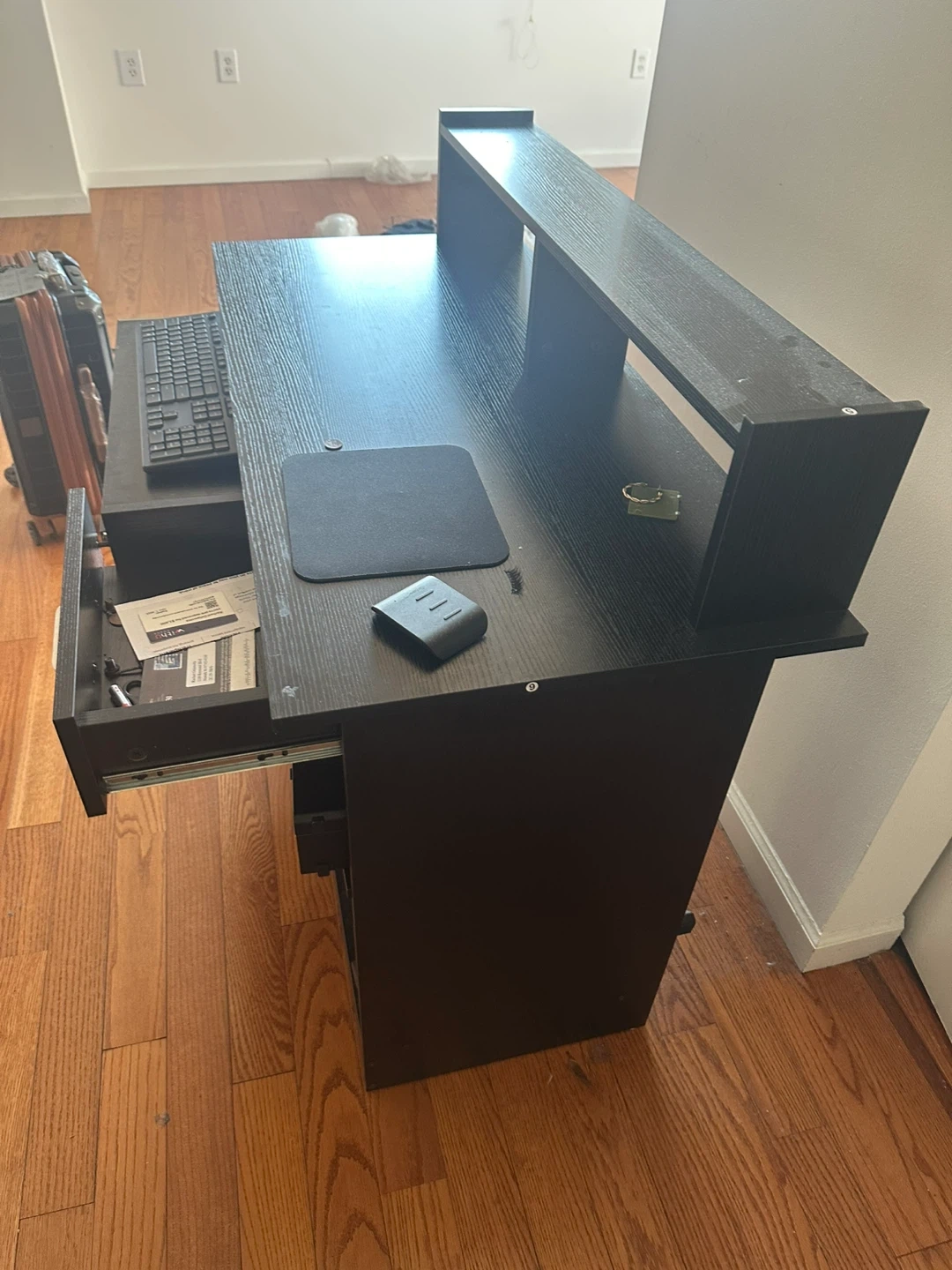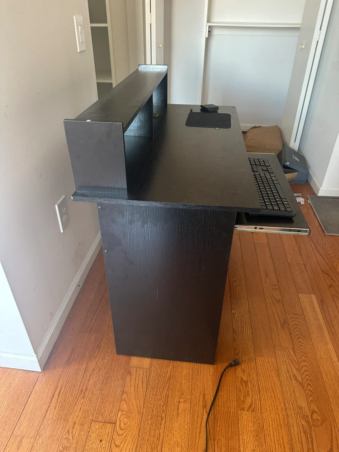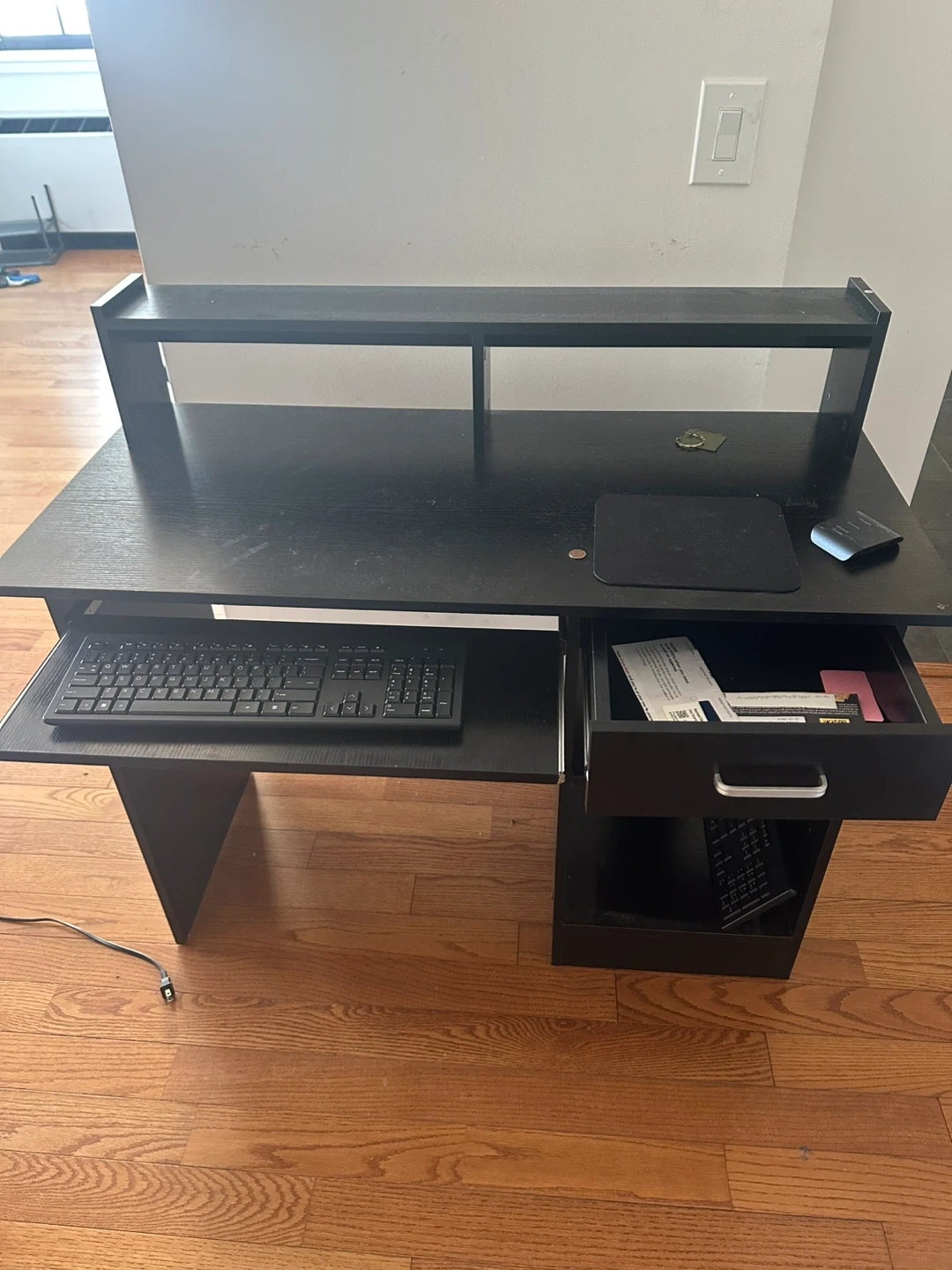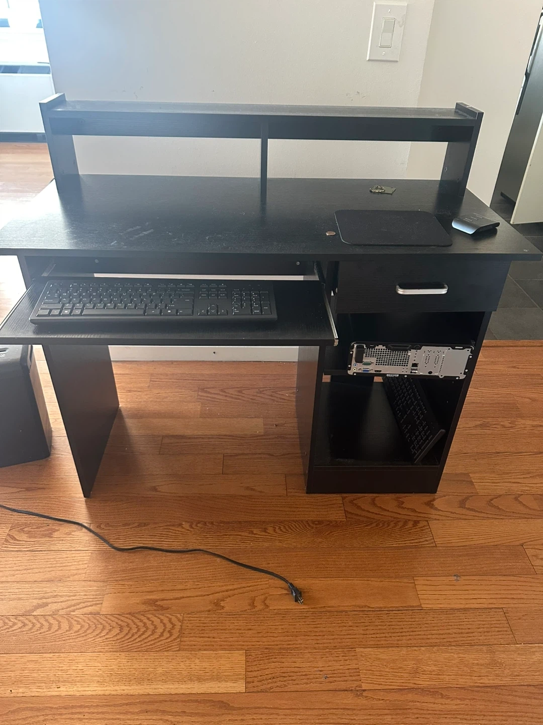 80Selling a black computer desk in good condition! It features a convenient pull-out keyboard tray and a shelf above for extra storage or display. Perfect for a home office or gaming setup!
