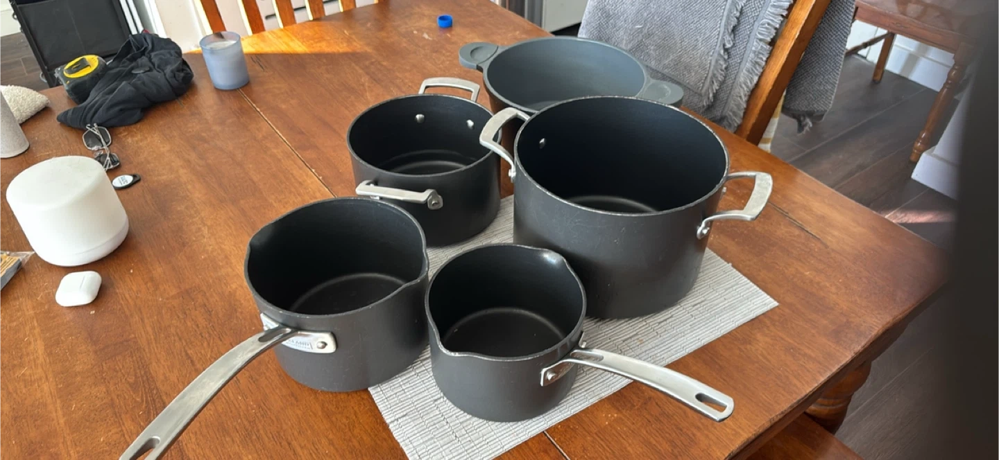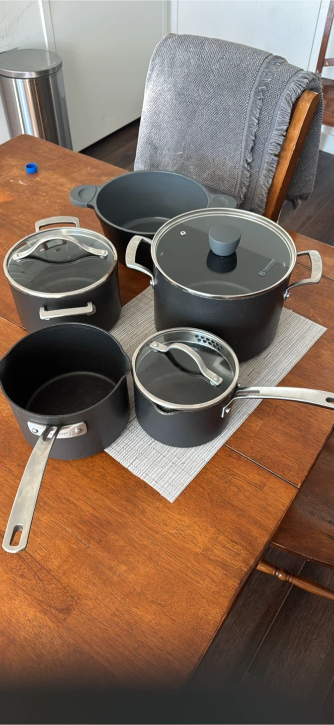 Selling cookware set in black! It includes 5 pots and pans. Great for anyone looking to upgrade their kitchen essentials. They are in good condition and ready for a new home