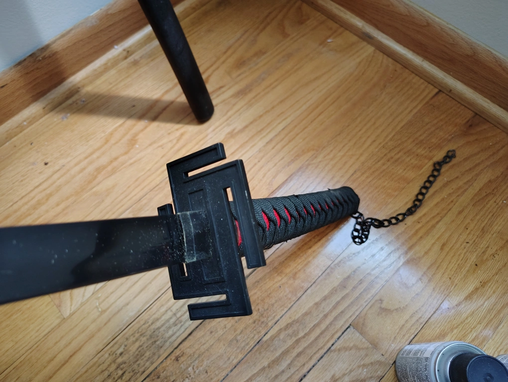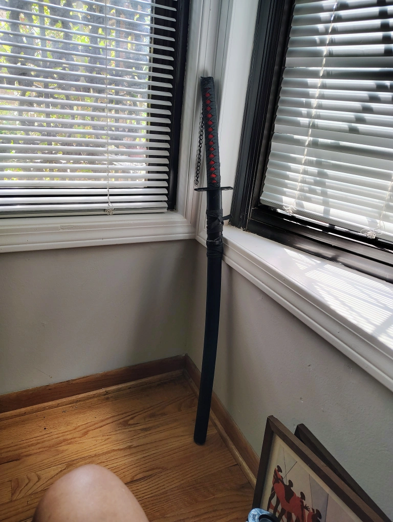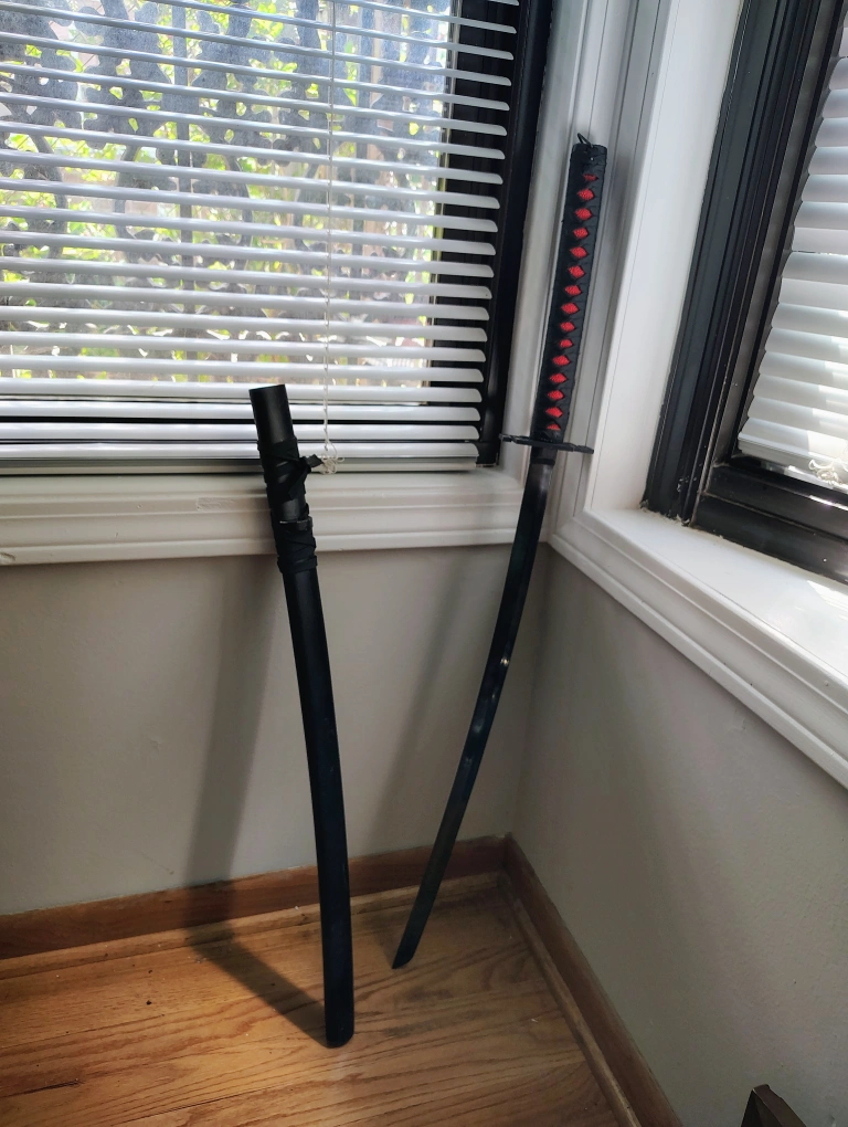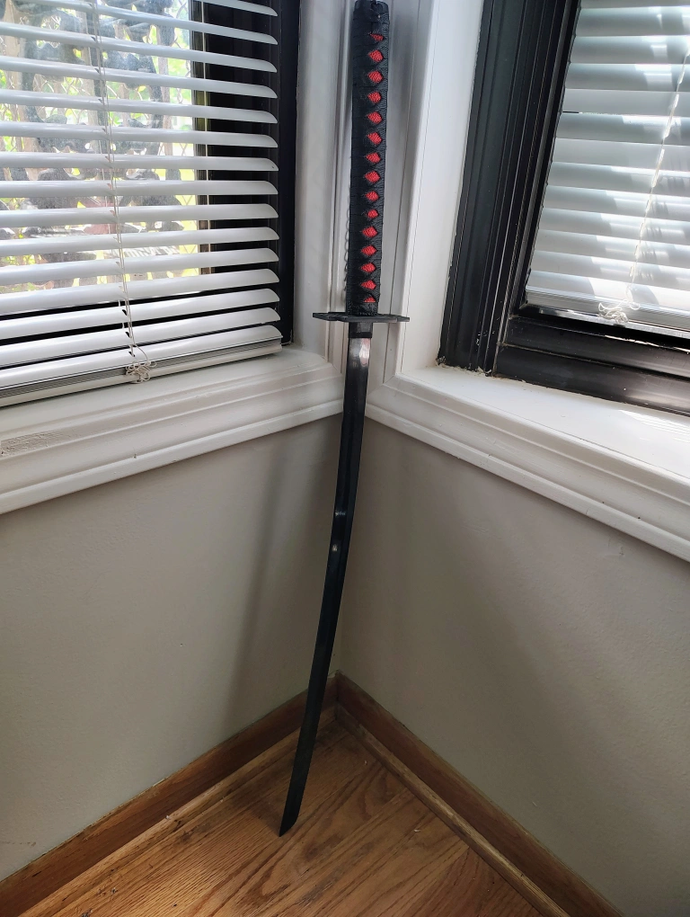 Here's a black decorative katana sword. It has a red and black handle. It comes with a black sheath. Great for cosplay! Bleach Anime