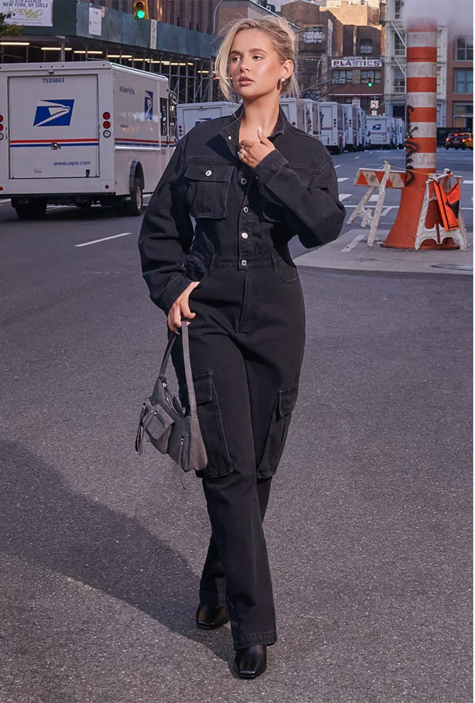 A stylish black denim jumpsuit. Perfect for a casual yet put-together look! The jumpsuit features pockets and a button-up front.