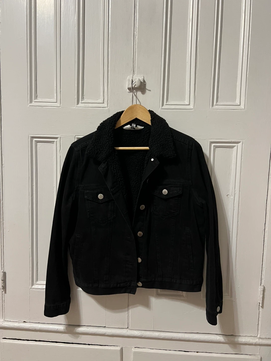 564This is a black denim jacket with a cozy full sherpa lining. It's perfect for adding a bit of warmth and style to your outfit. The jacket features a classic denim design with a soft sherpa collar and lining, making it a great layering piece for cooler weather. 4 pockets. Perfect for layering in the colder months classic chic style. Looks more black in real life than it does in the photos.