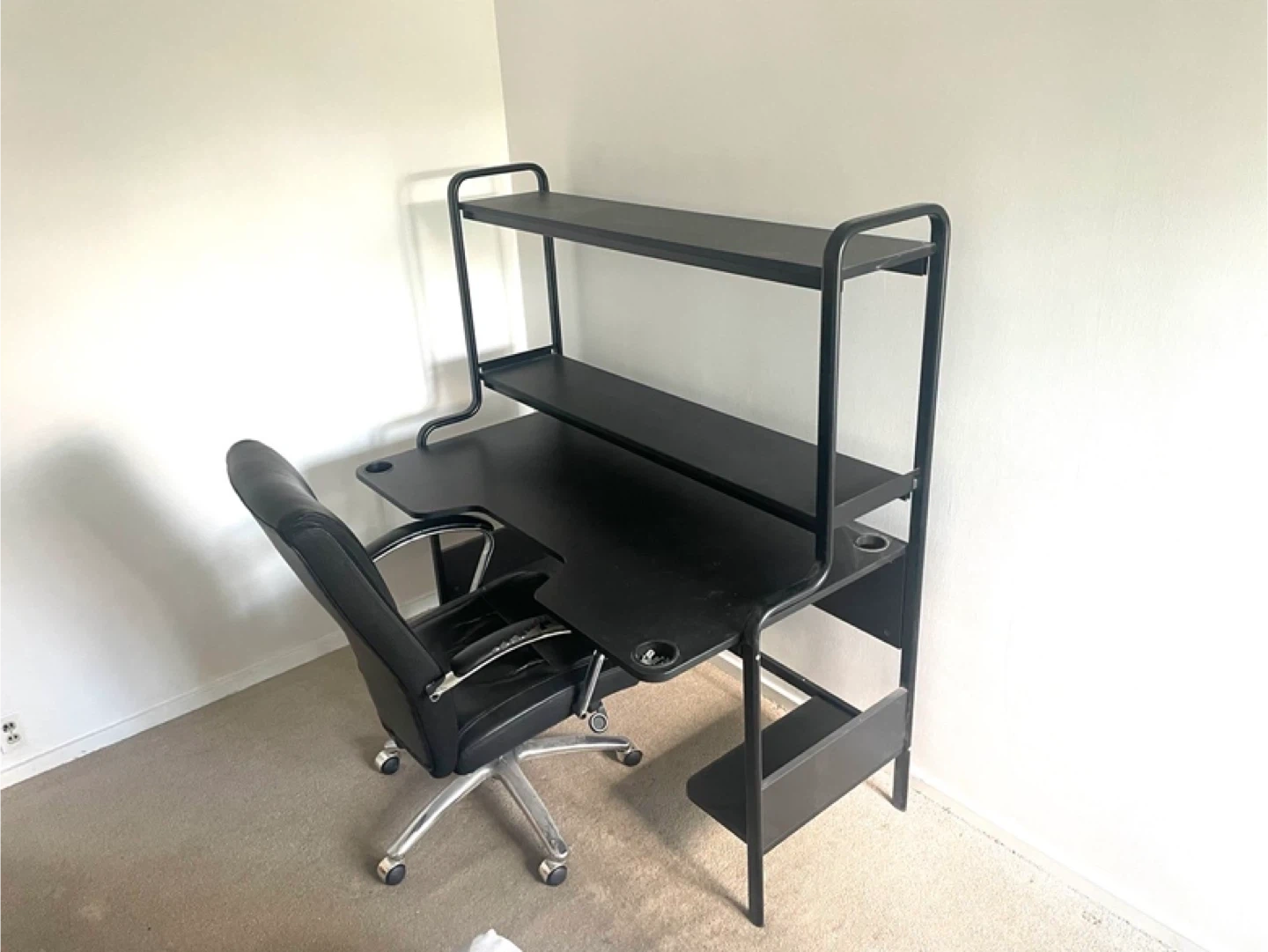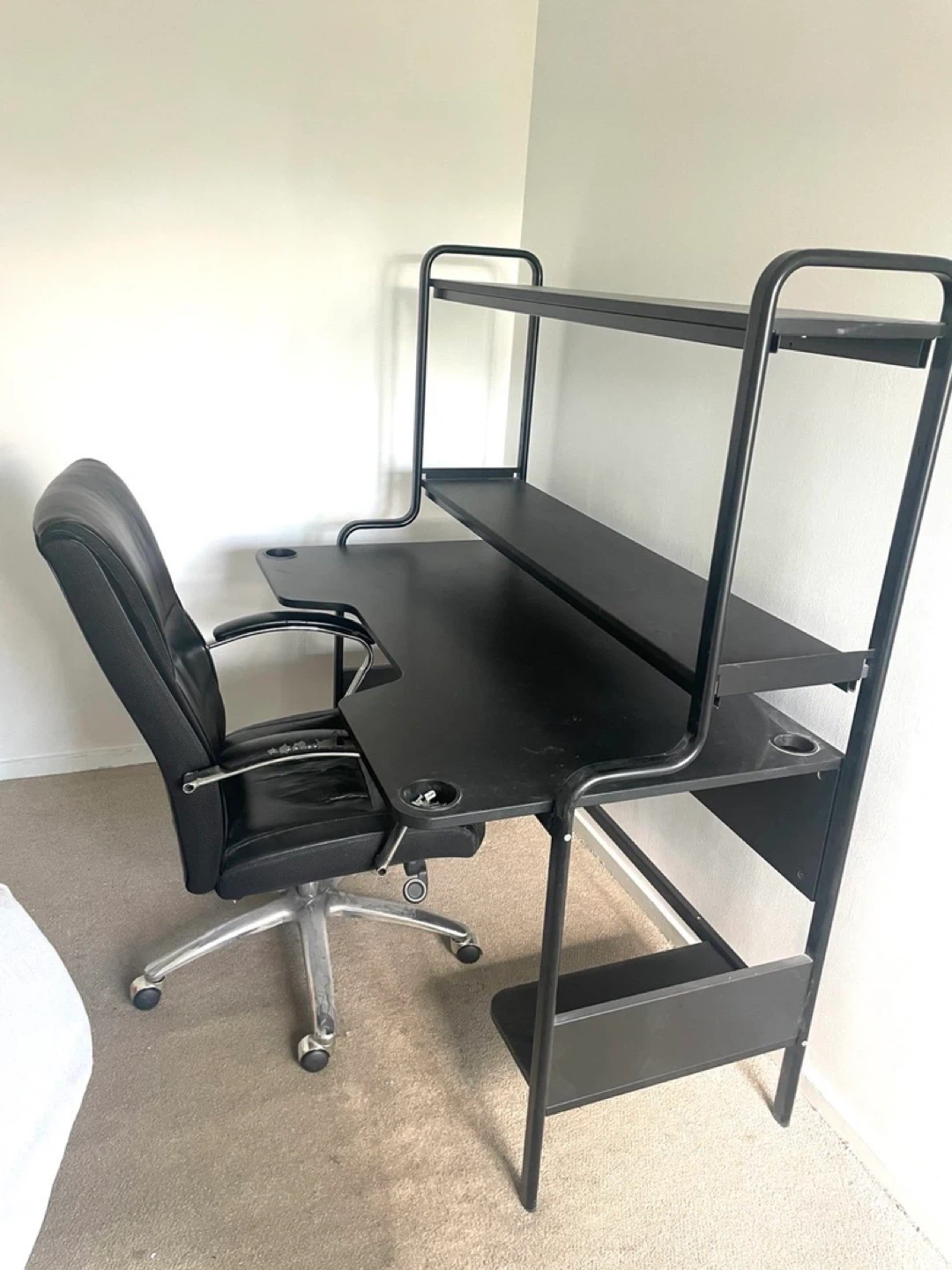 Selling a black desk with built-in shelves and a comfortable black office chair. The desk has a unique design with multiple shelves for storage and organization. The chair is in good condition and provides great support for long hours of work or study. Perfect for a home office or student setup!
