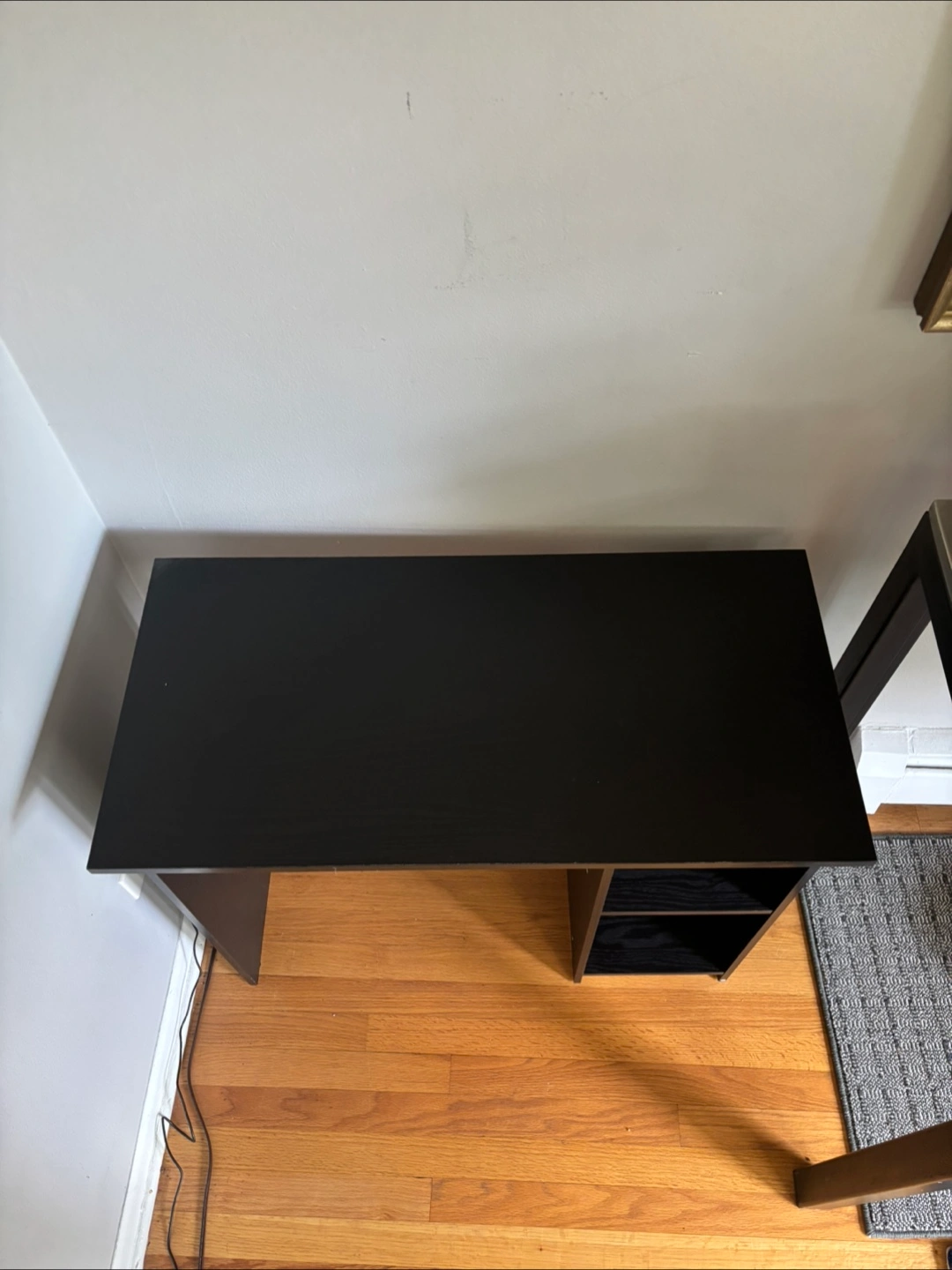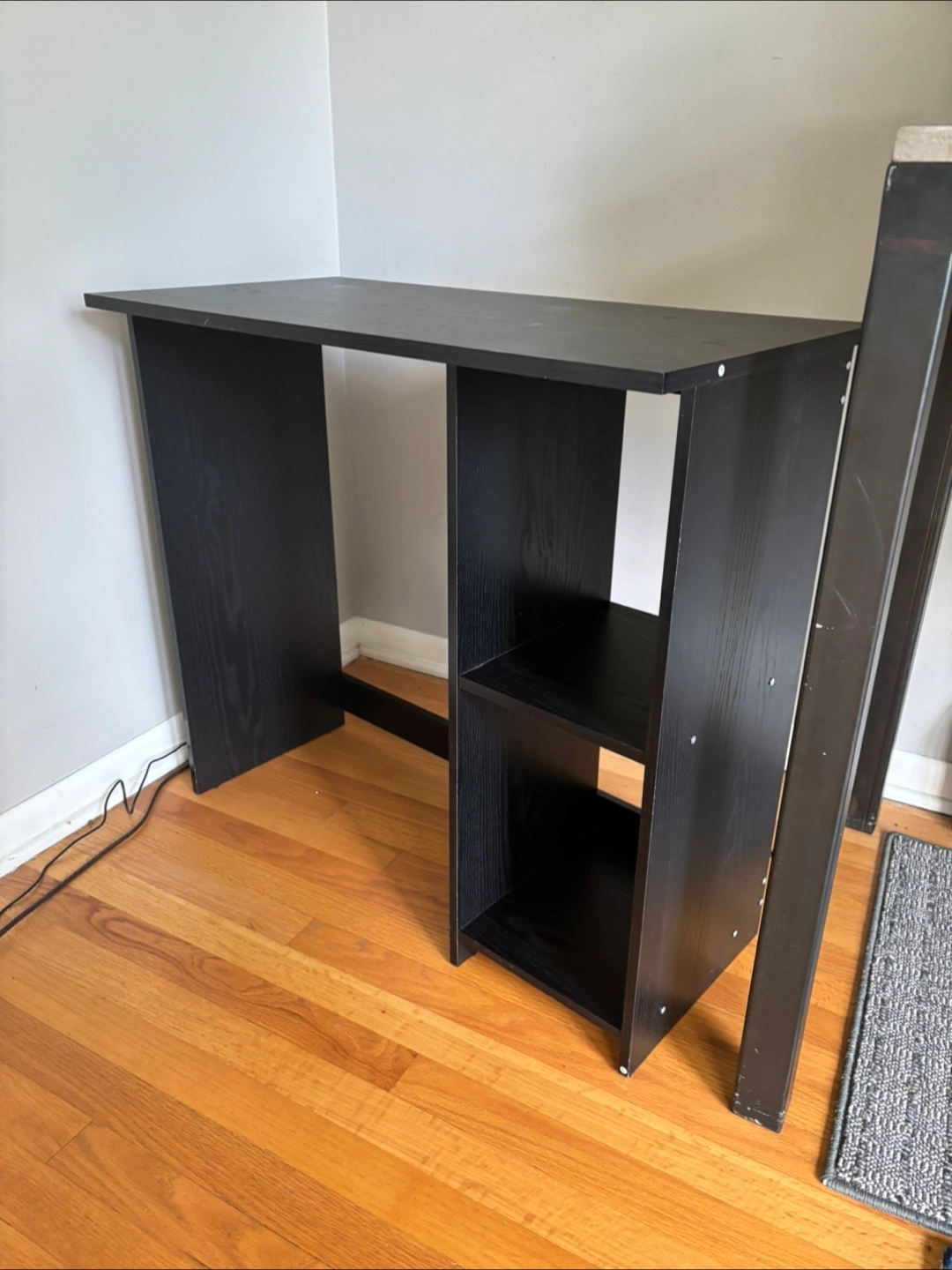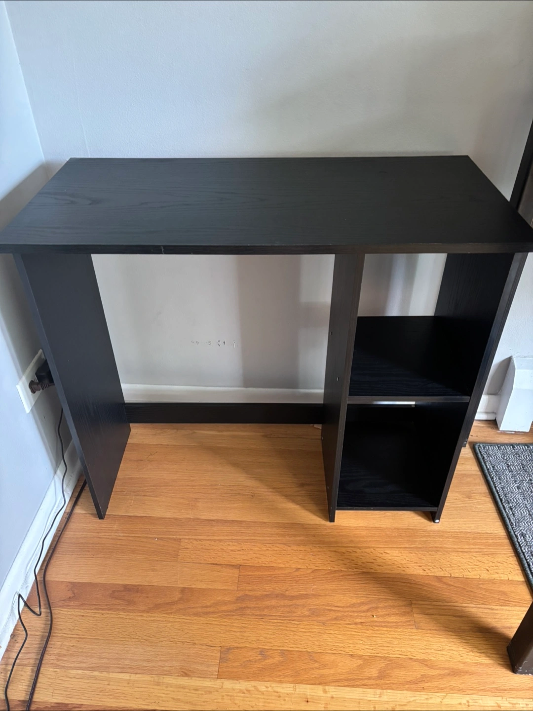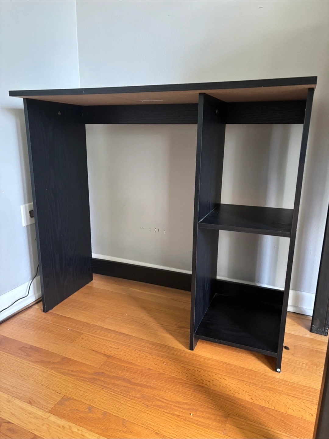 Selling a black desk that features built-in shelves! It's in good condition and perfect for a small workspace or student. The desk offers a simple and functional design, great for keeping your essentials organized and within reach. It is a sturdy desk.