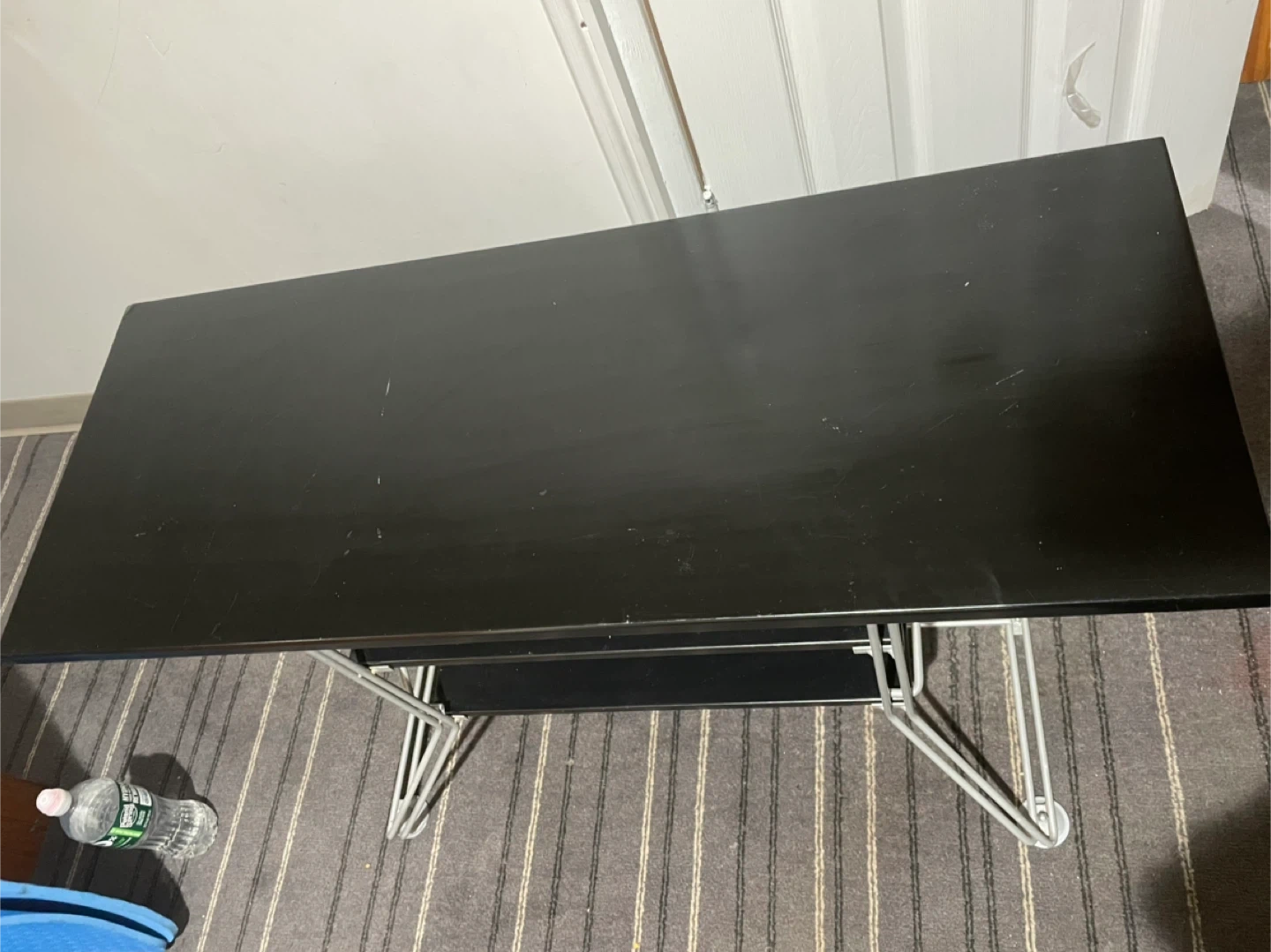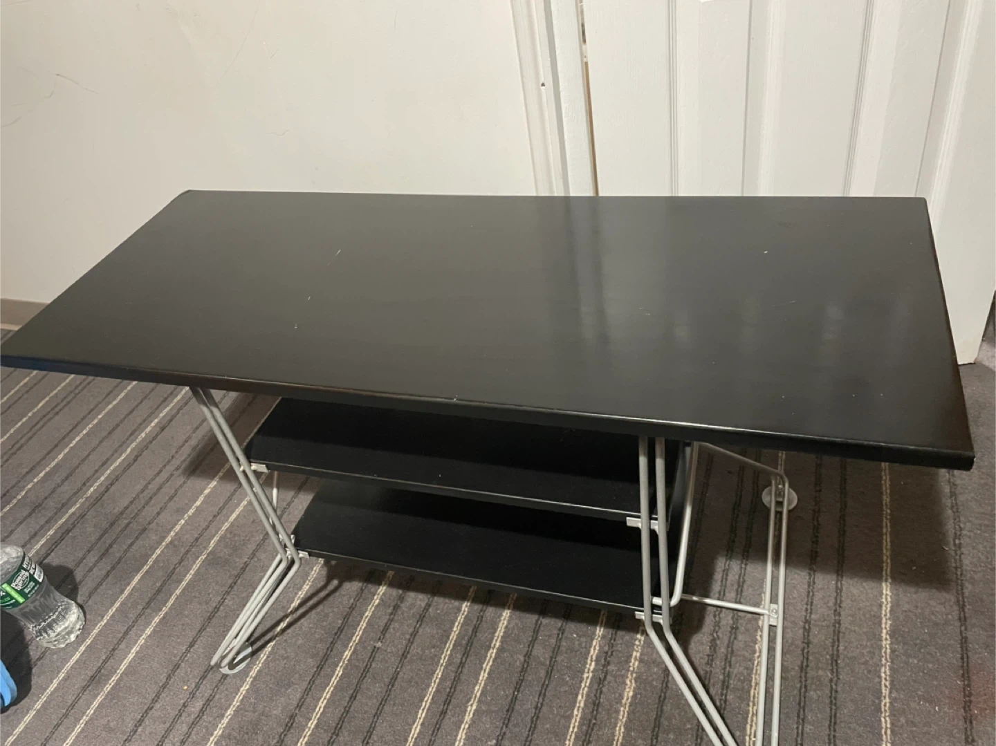 143Selling a simple black desk that's perfect for a small workspace or study area! It features two shelves underneath for extra storage, making it easy to keep your space organized. The desk has a clean, minimalist design that will fit well with any decor. It's in great condition and ready for a new home!