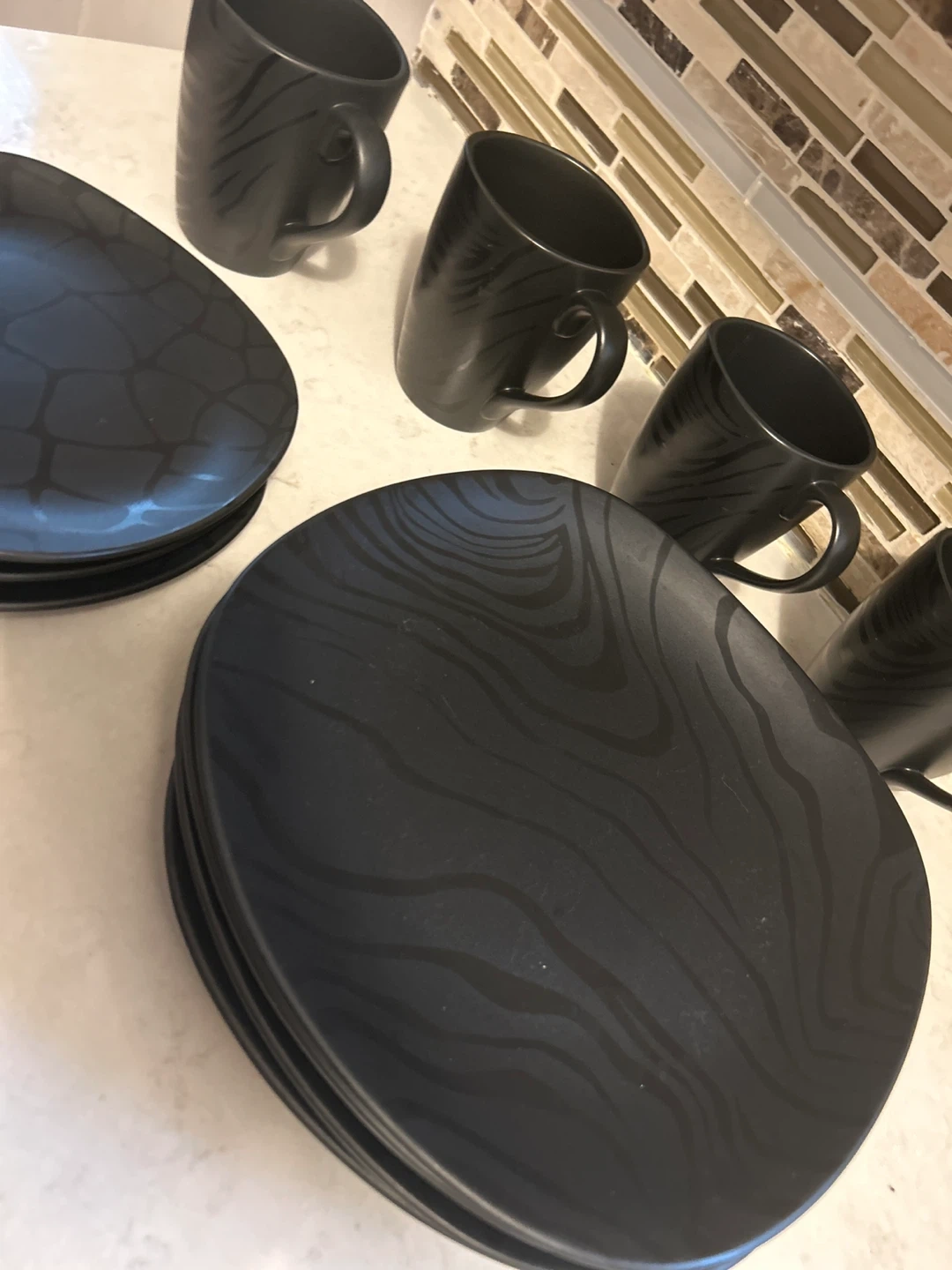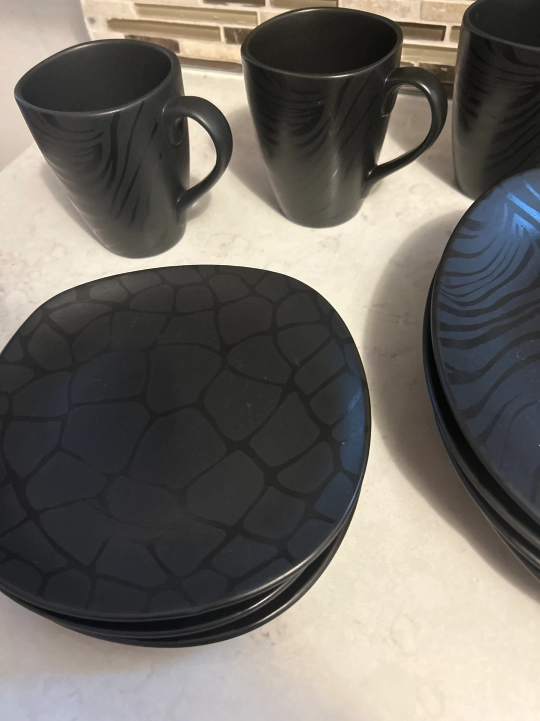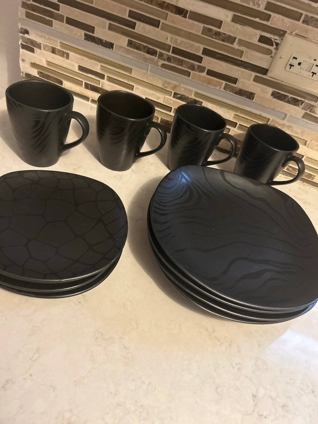 15Selling a set of black dinnerware! Includes four plates and four mugs. Great for everyday use or special occasions. They feature a unique design on each piece.