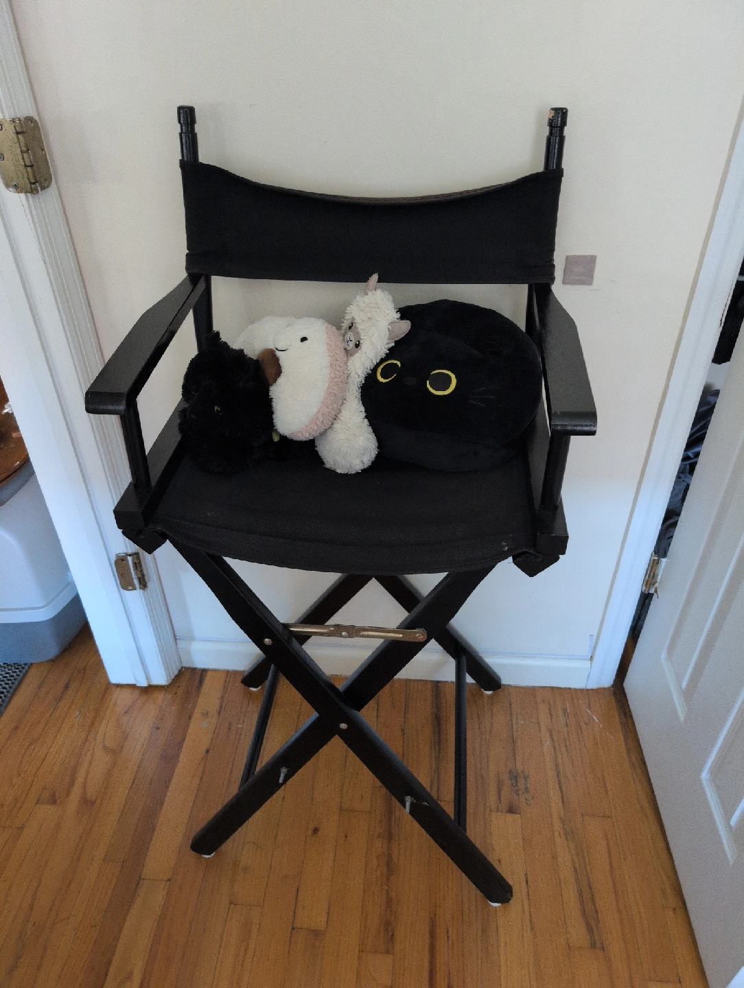 Selling a black director's chair! It's in good condition and perfect for adding a touch of style to any room. The chair is sturdy and comfortable, great for relaxing or working. It's a folding chair too, so it's easy to store when not in use