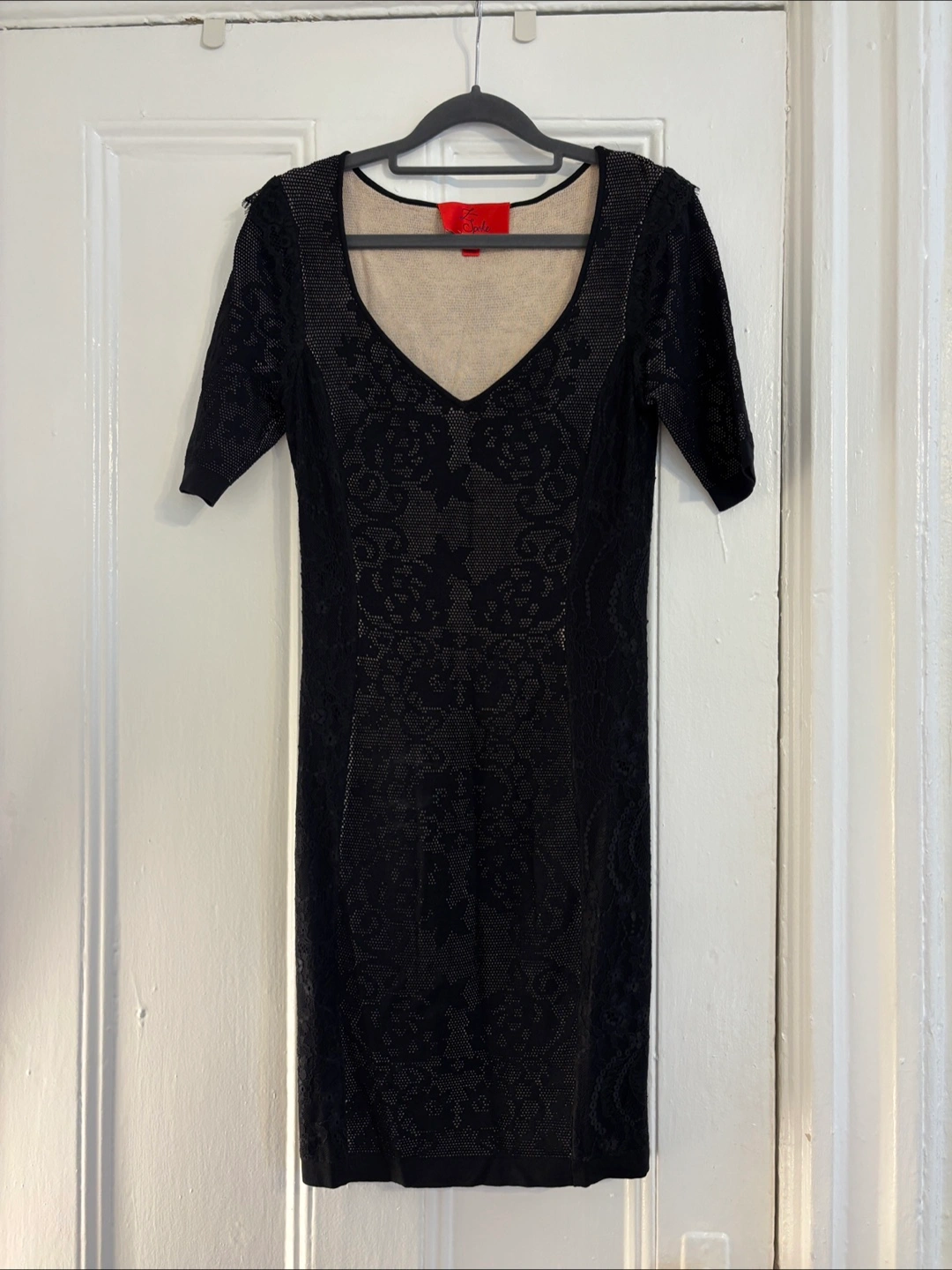 Z Spoke By Zac Posen black dress. Size is marked as small (feels like XS but it's stretchy), has a unique lace pattern, and is in great condition.