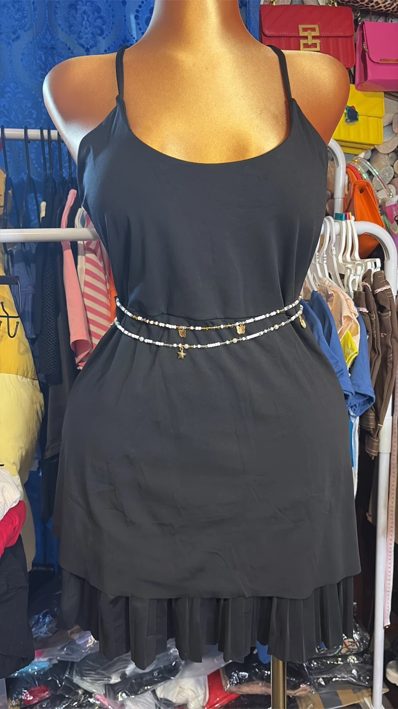 Selling a cute black dress with a unique pleated hem. It's a simple yet stylish piece that can be dressed up or down. Perfect for any occasion!
