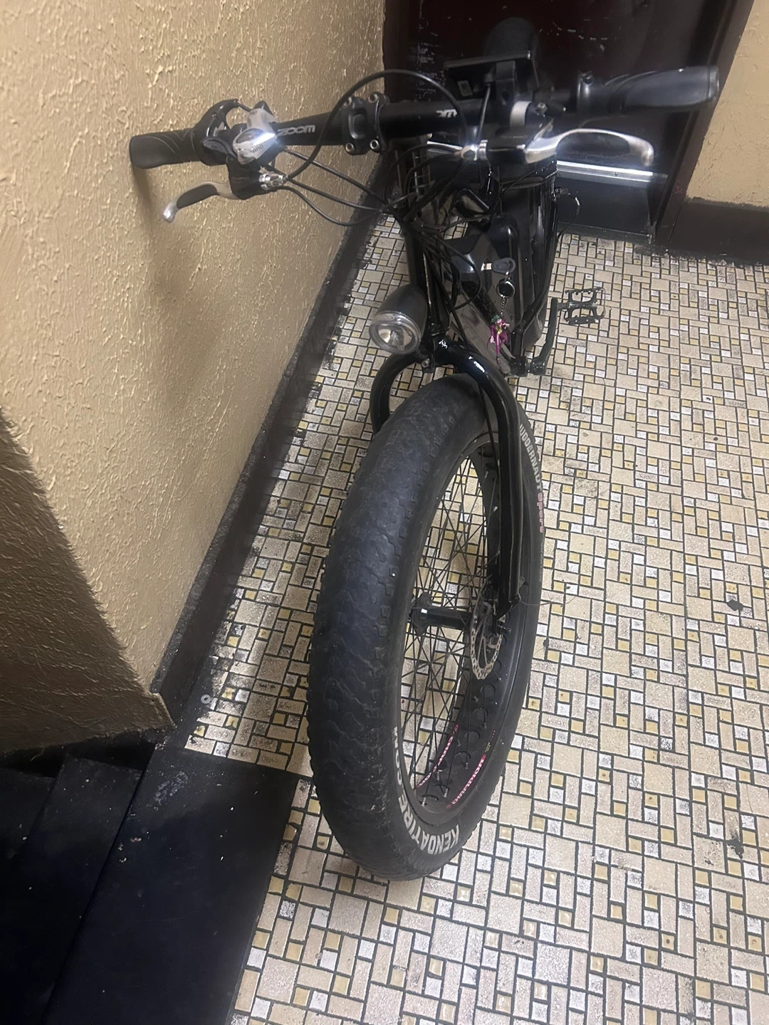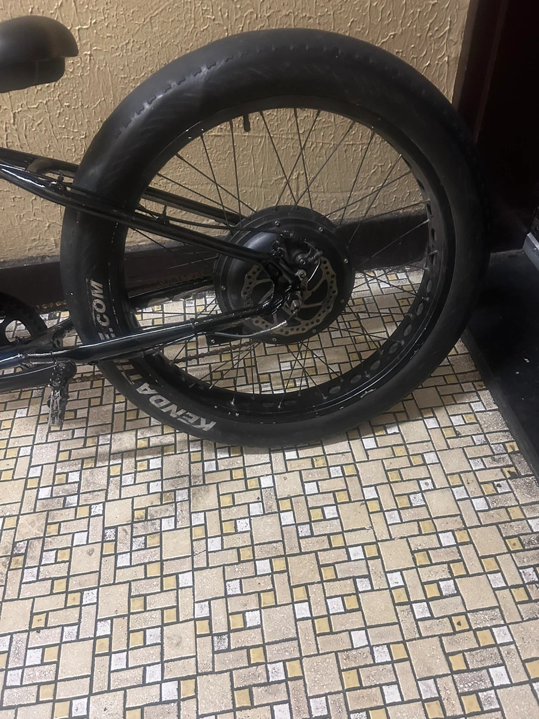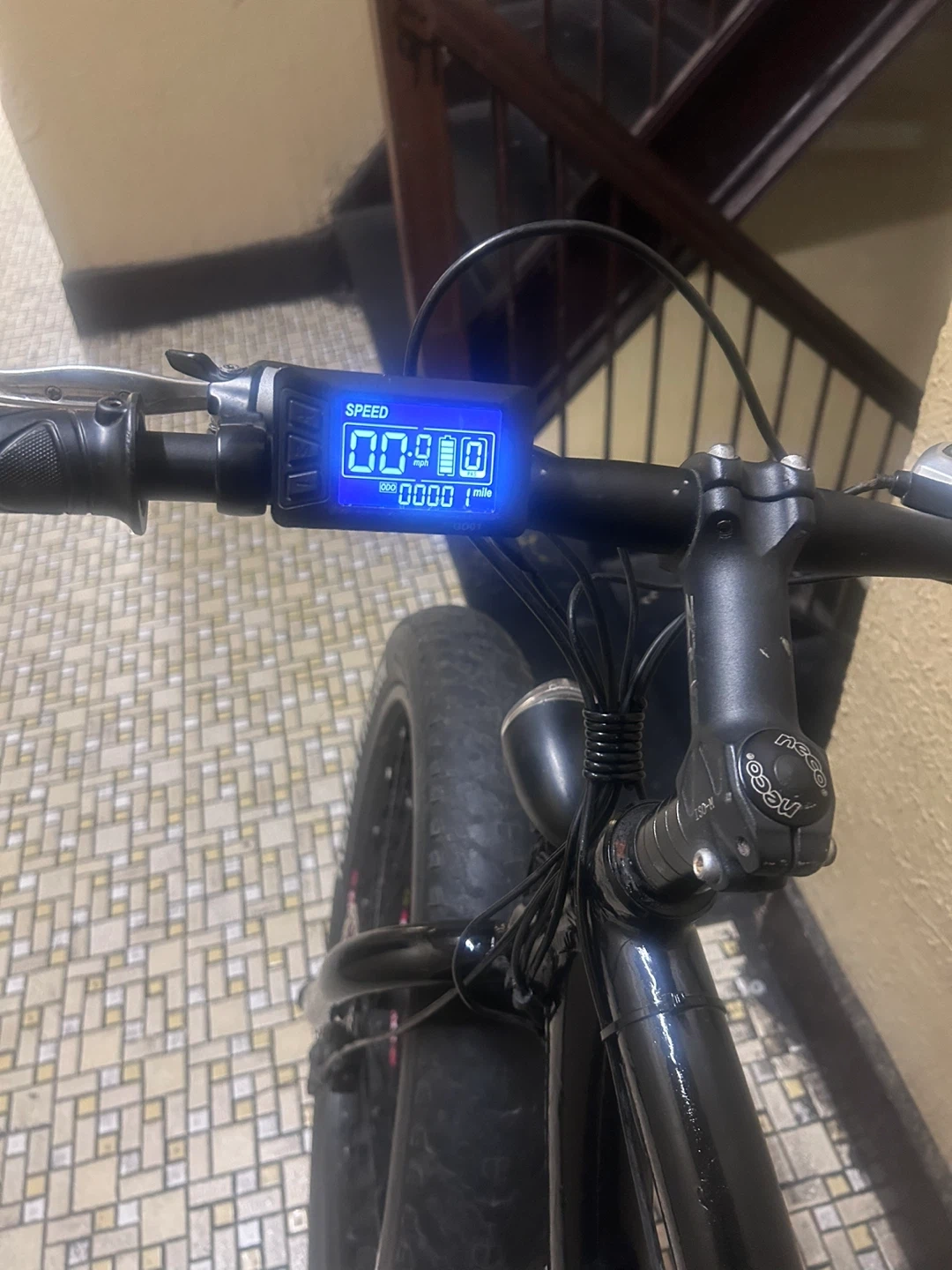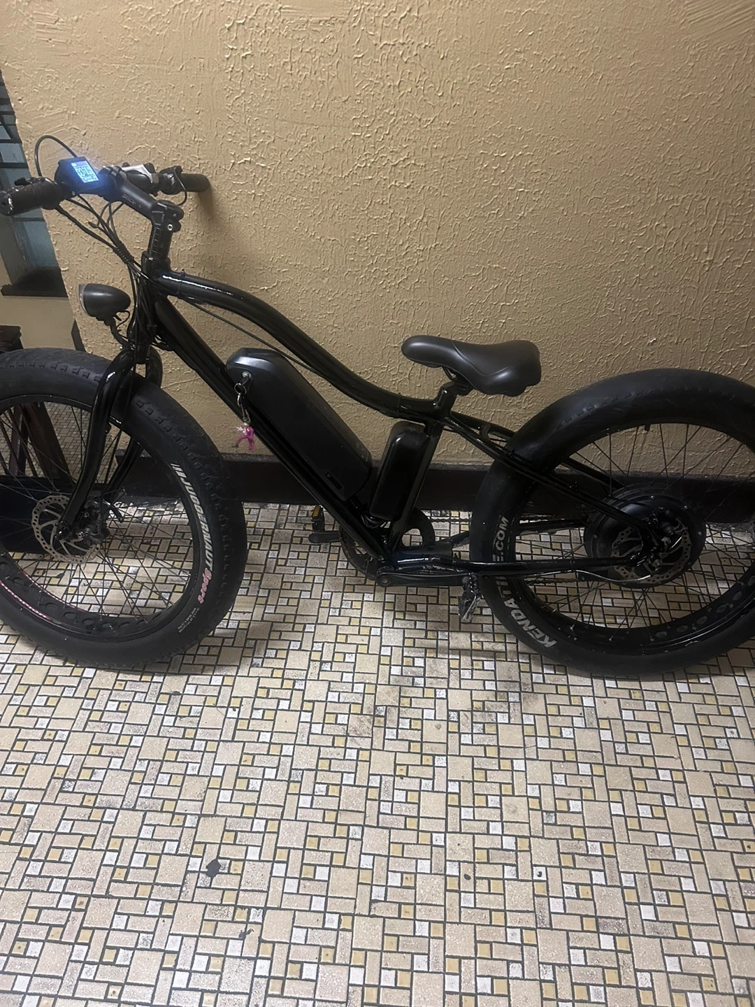 65Selling a black electric bike with fat tires! It features a digital display showing speed and battery level. The tires are Kenda brand. Great for cruising around town or hitting some trails