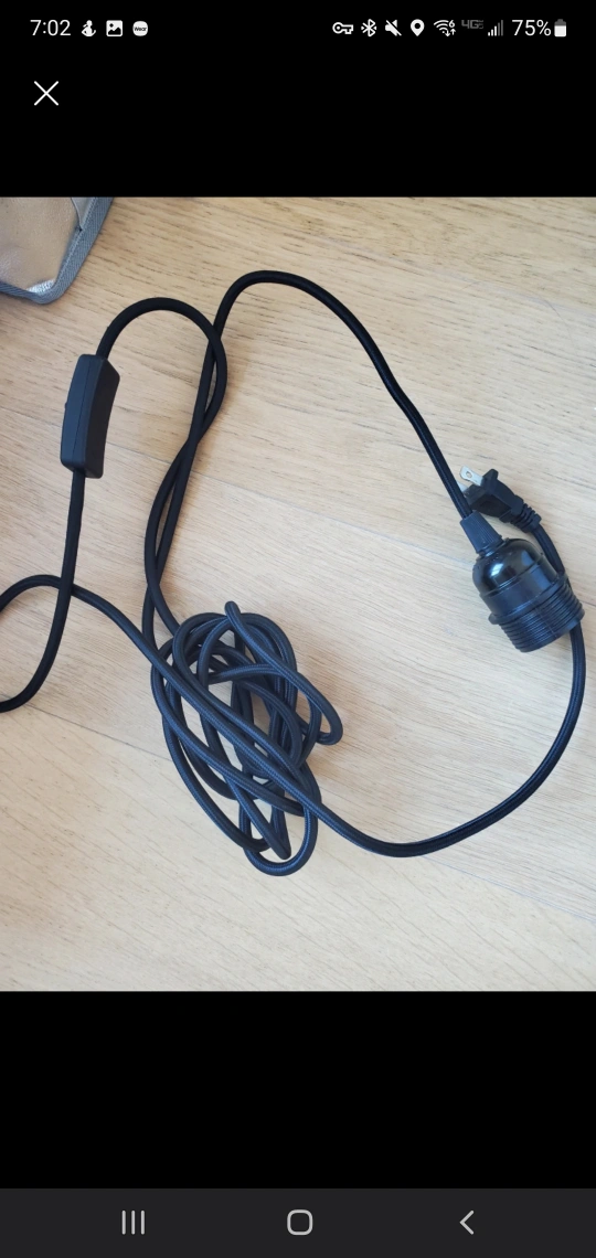 118Black electrical cord with a switch and plug. The cord has a black braided cloth covering. Includes a black light socket.