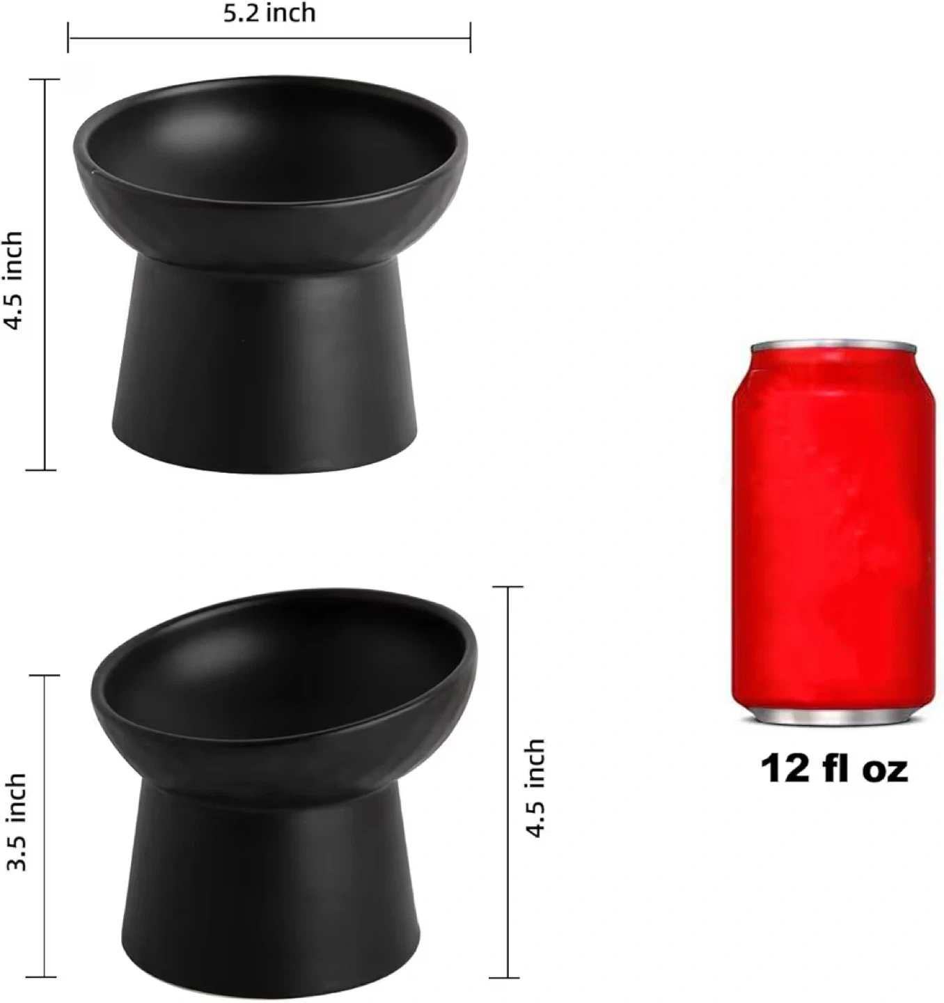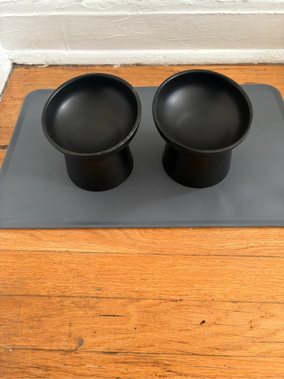 114Set of two black ceramic cat bowls with tilted design. Dishwasher and microwave safe. Originally bought from Amazon for $27. In good condition with natural wear and tear on the edges from washing them.