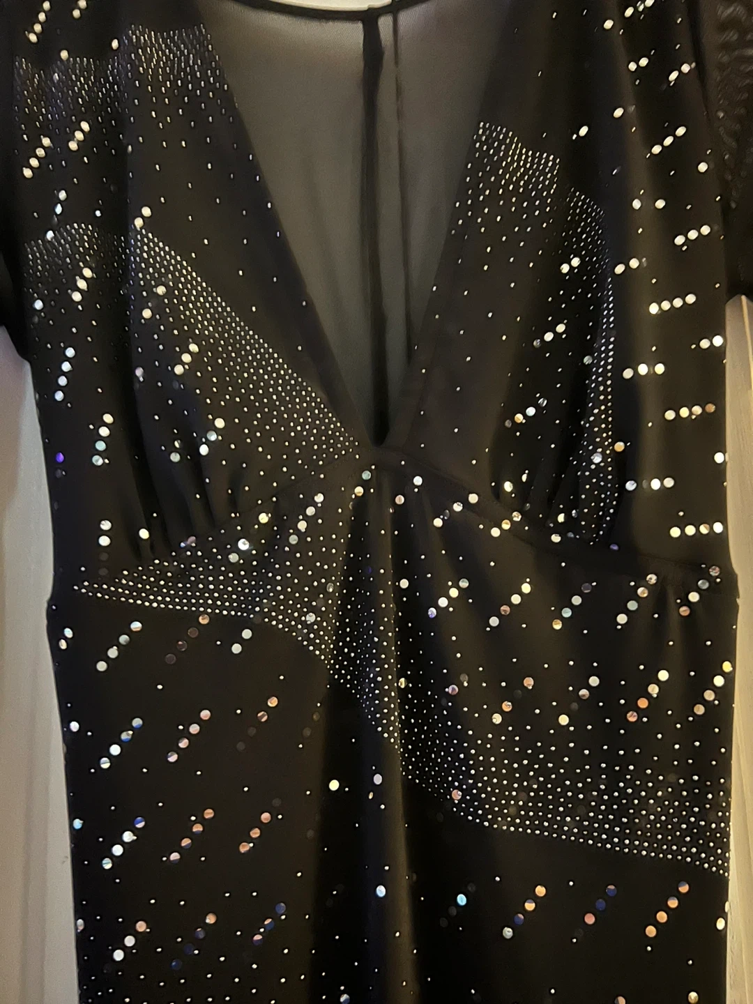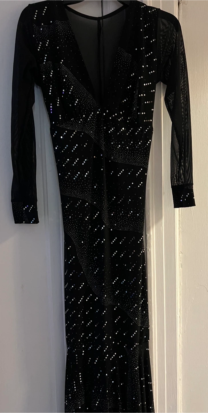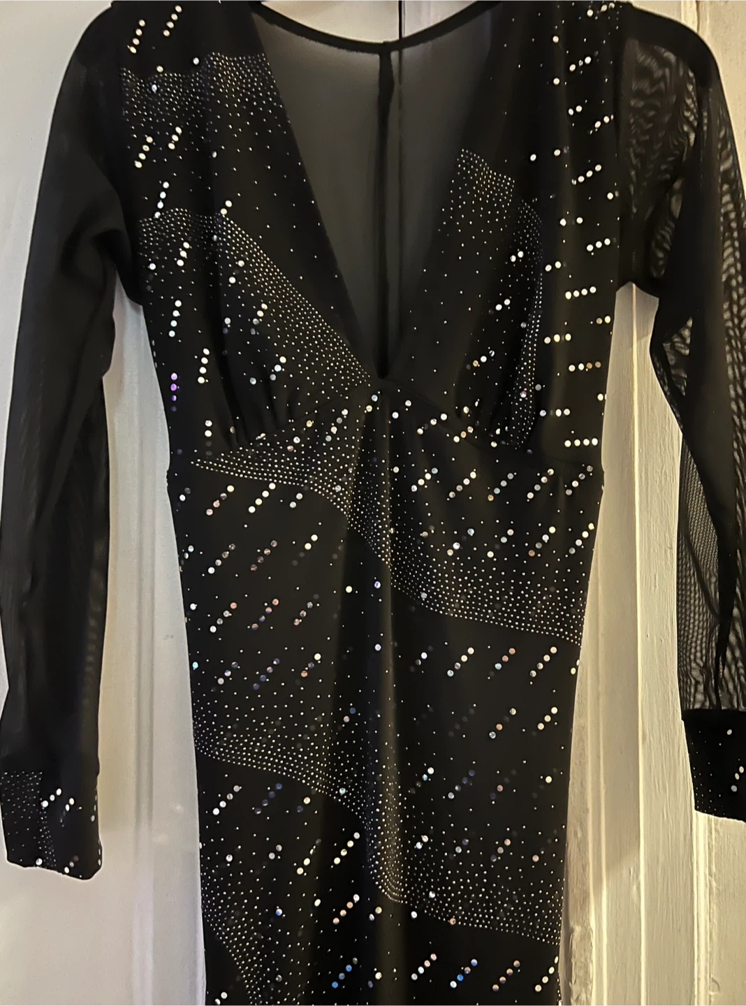 I'm selling a black embellished dress. It has a V-neckline and long mesh sleeves. The back is sheer and has a small train.
