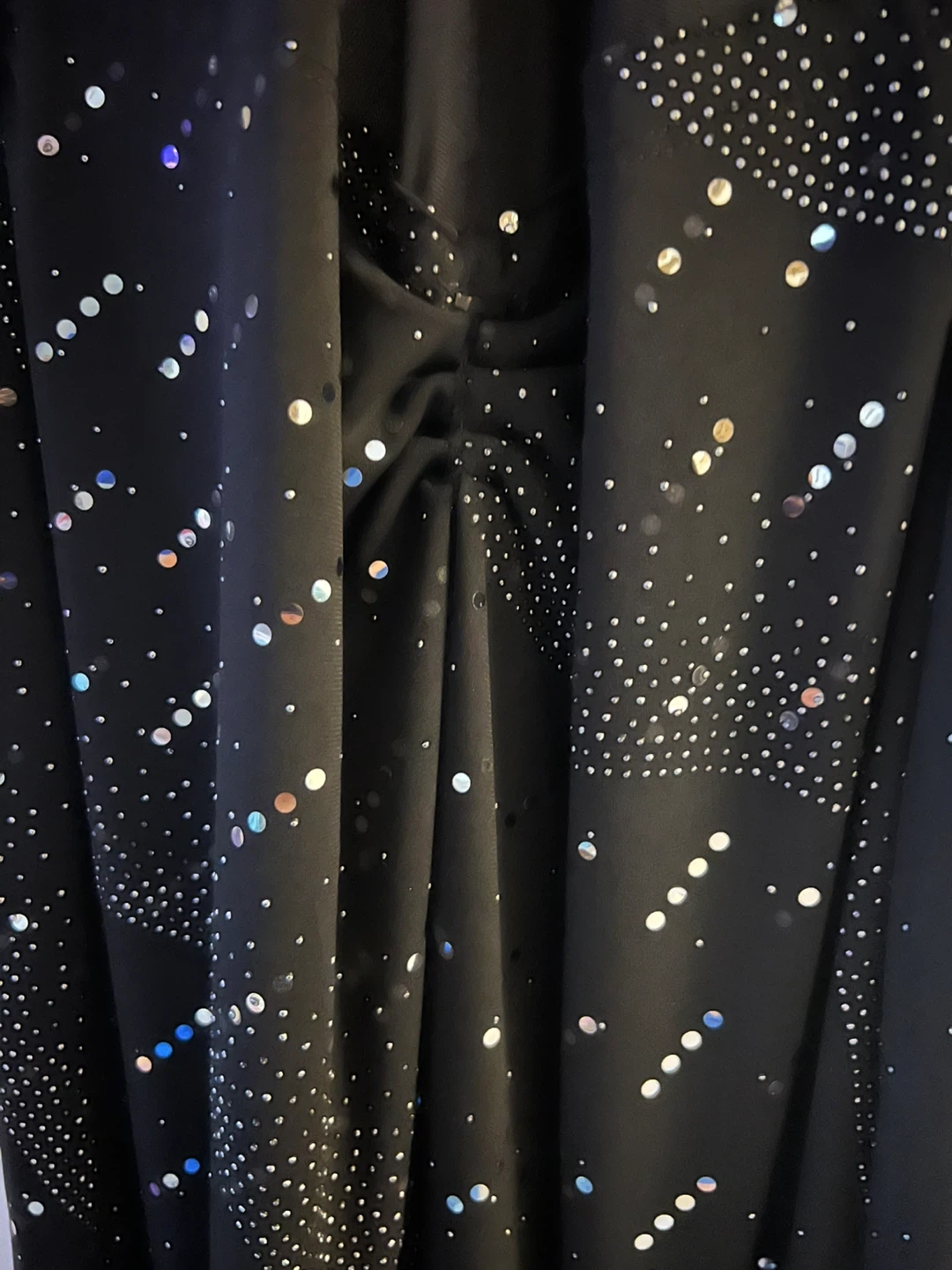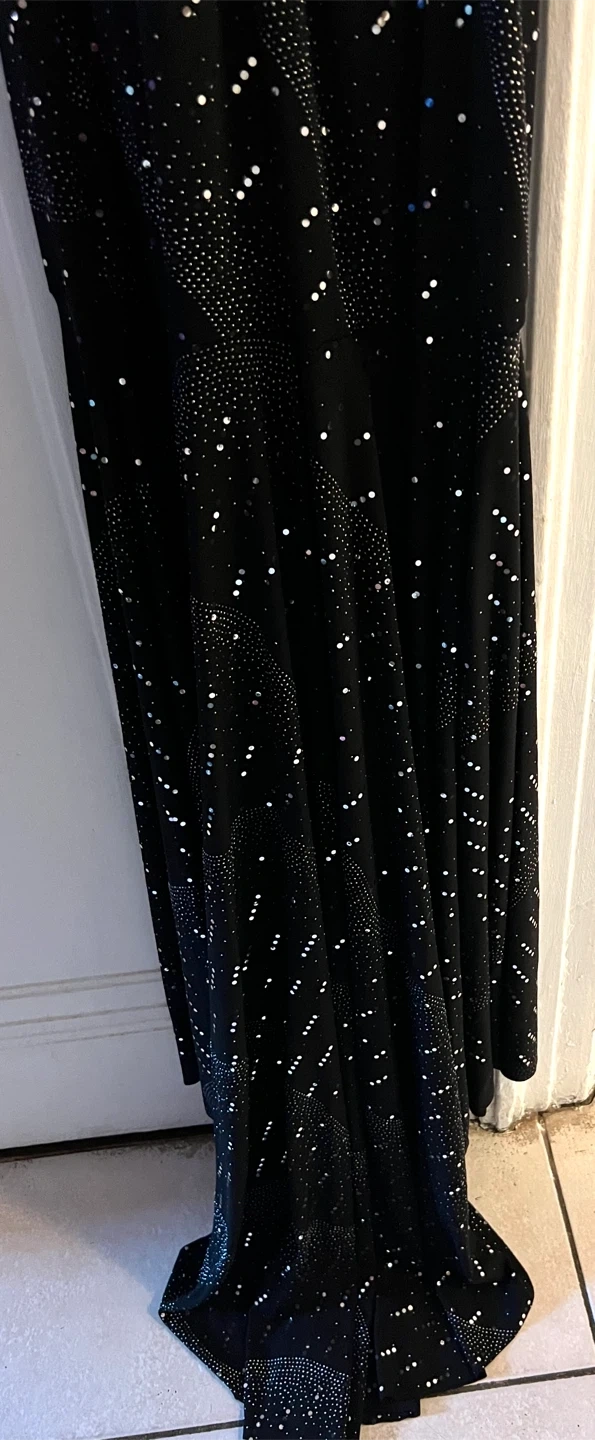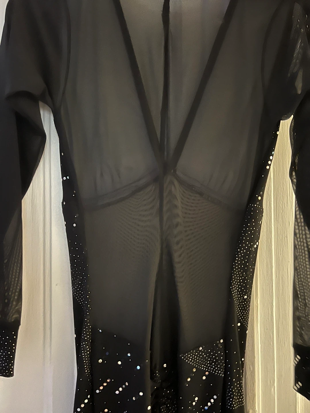 I'm selling a black embellished dress. It has a V-neckline and long mesh sleeves. The back is sheer and has a small train.