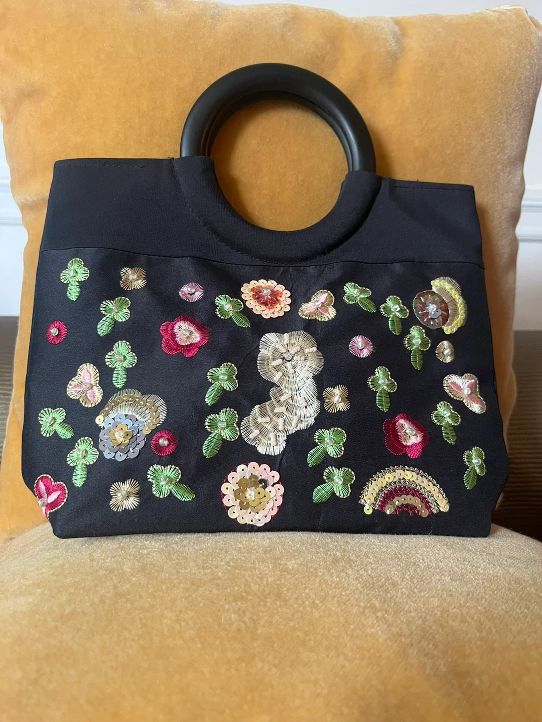 This is a charming black handmade handbag with colorful floral embroidery and a unique wooden handle. It's new and perfect for adding a touch of eclectic elegance to any outfit!
