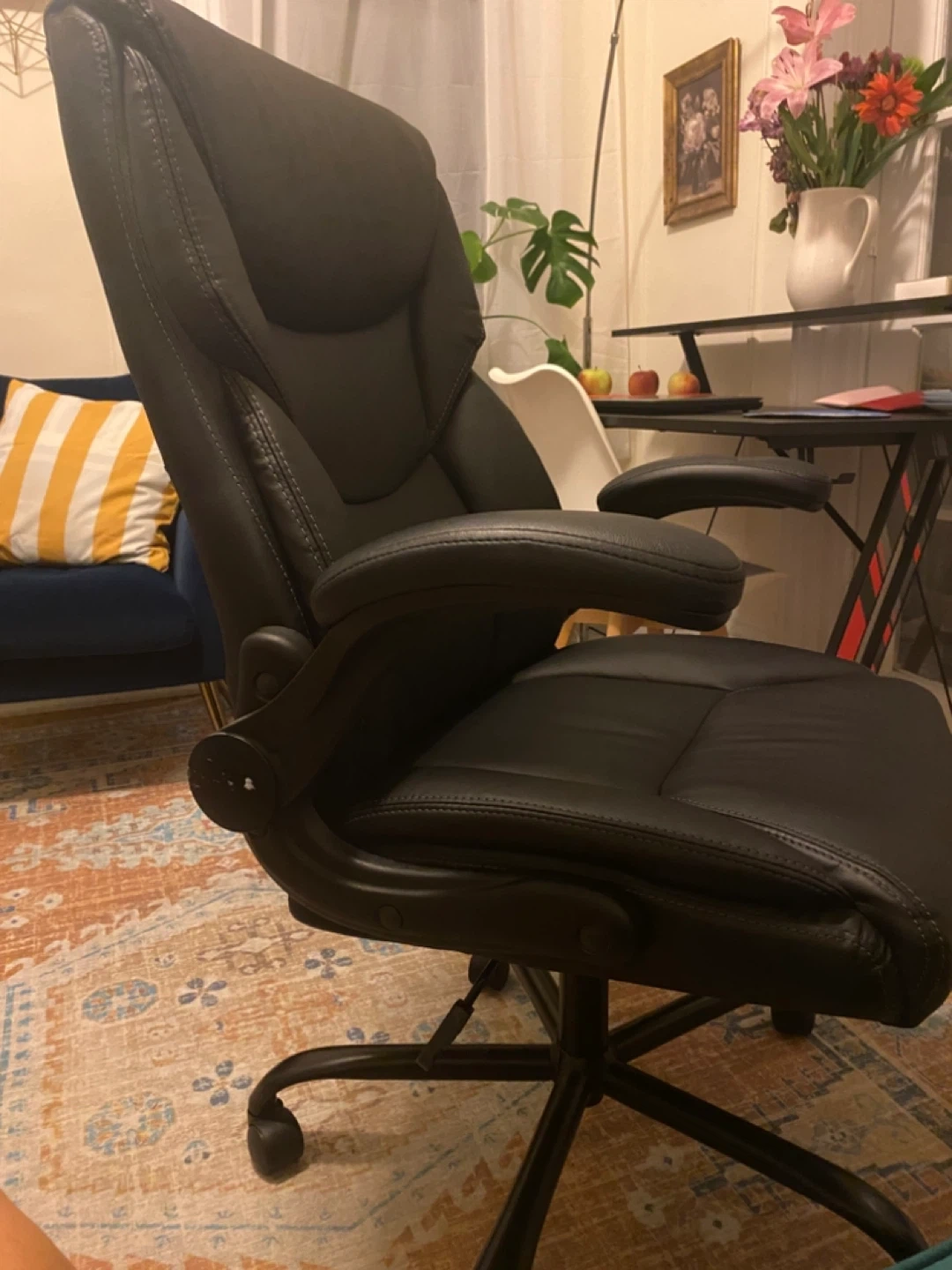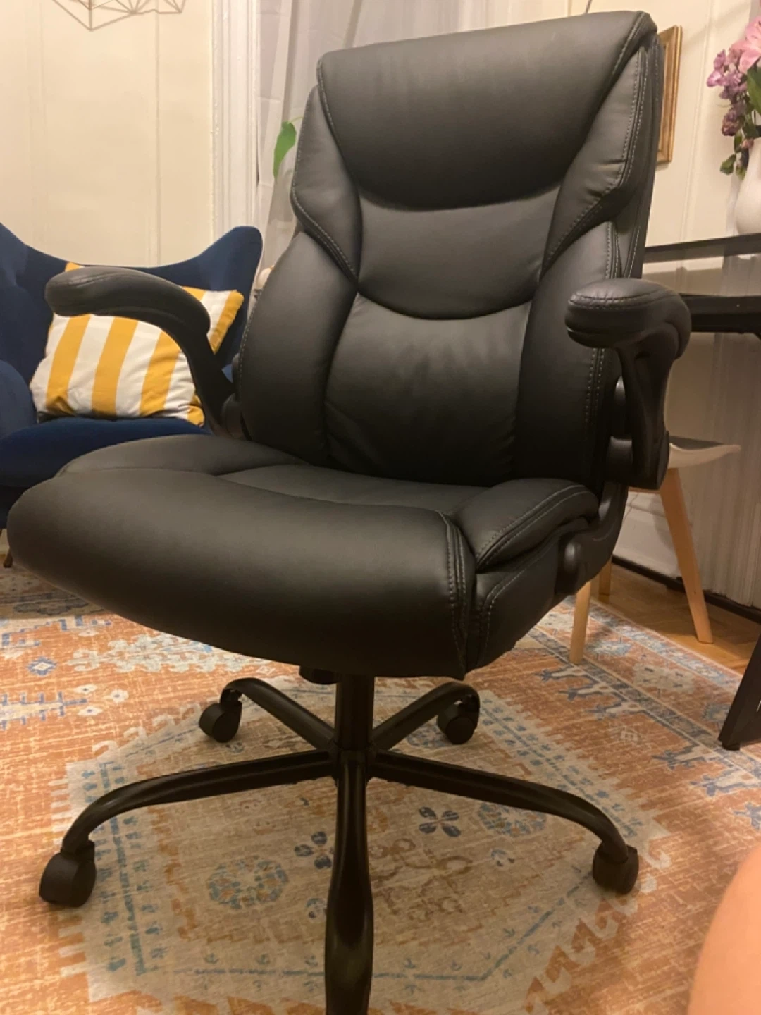 Here's a comfortable black executive office chair! It's in great condition and ready to use in your home office or workspace. The chair features a high back design and padded armrests for added support. It also has a swivel base and smooth-rolling casters for easy movement around your desk