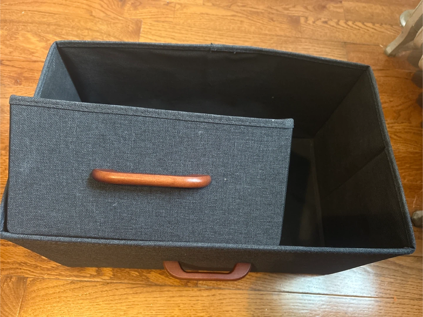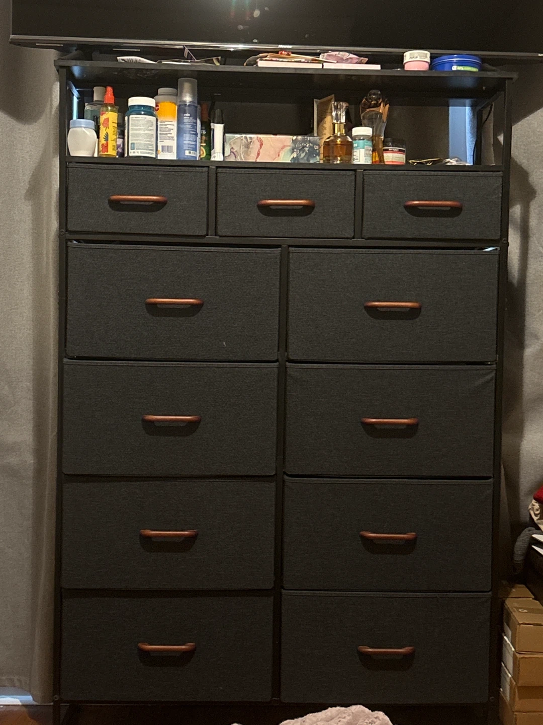 Here's a black fabric dresser with 12 drawers. It's in good condition and offers plenty of storage space. The dresser has a sturdy frame and the drawers are easy to slide in and out. Perfect for organizing your clothes or other items!