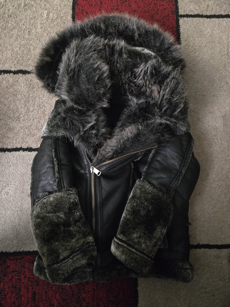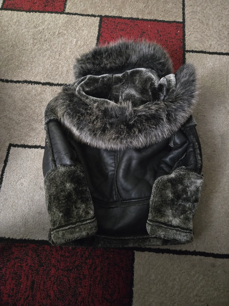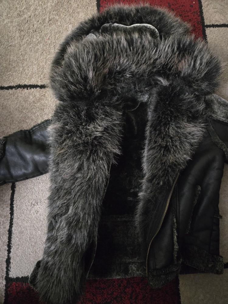 62Stylish black jacket with faux leather and fur trim. It's in great condition and ready for a new home! Perfect for adding a touch of edgy warmth to your wardrobe size 12