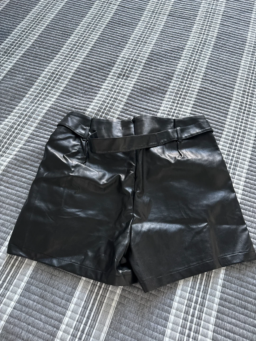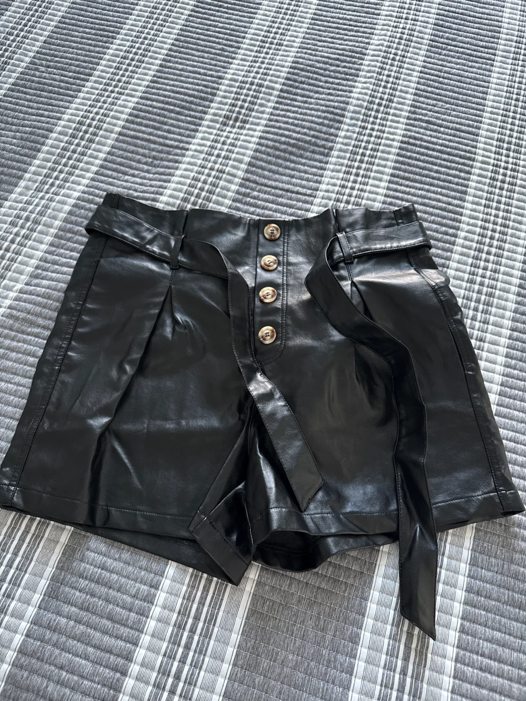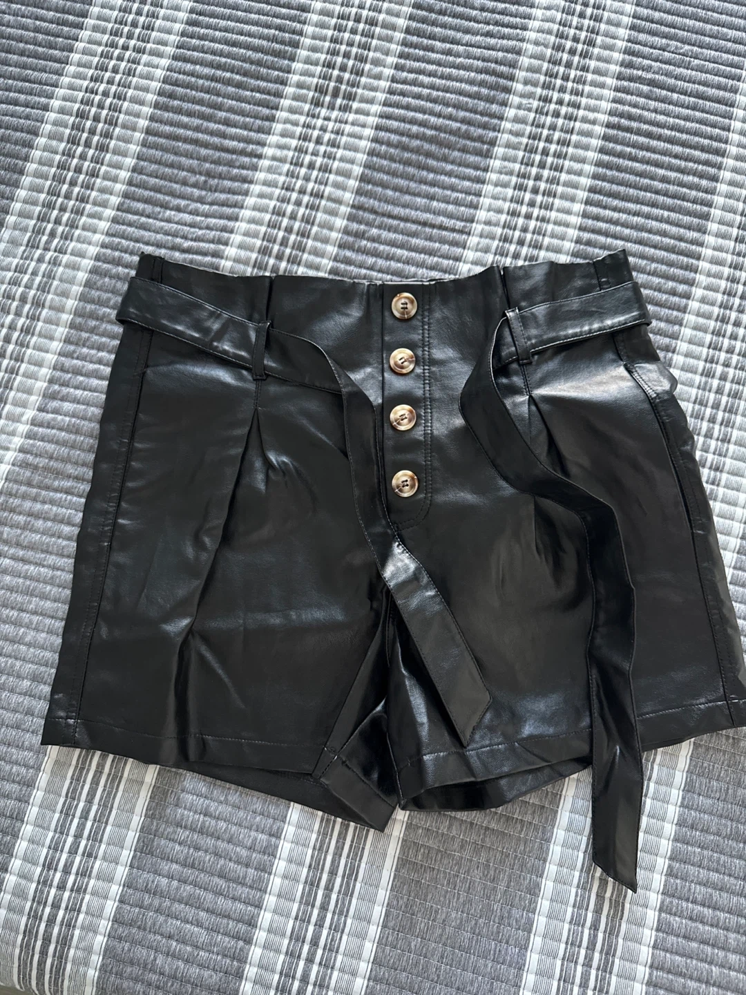 These are a pair of black faux leather shorts. They feature a belted high waist and button detail. They are in great condition!