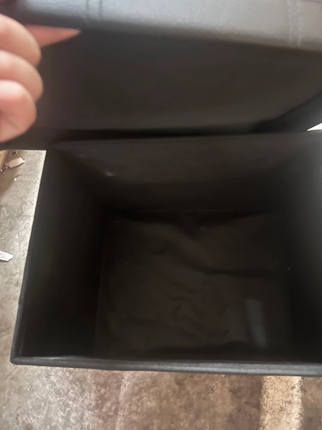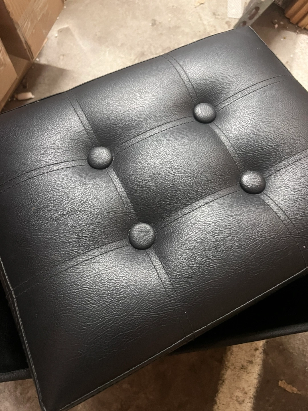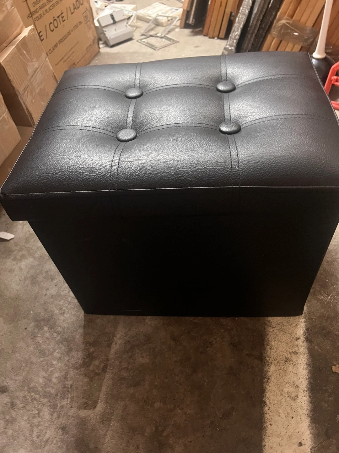 I'm selling a black faux leather storage ottoman. It's in great condition and perfect for adding extra seating and storage to any room. The top is tufted with button accents, and the interior is spacious for storing blankets, pillows, or other items. It's a stylish and functional piece!