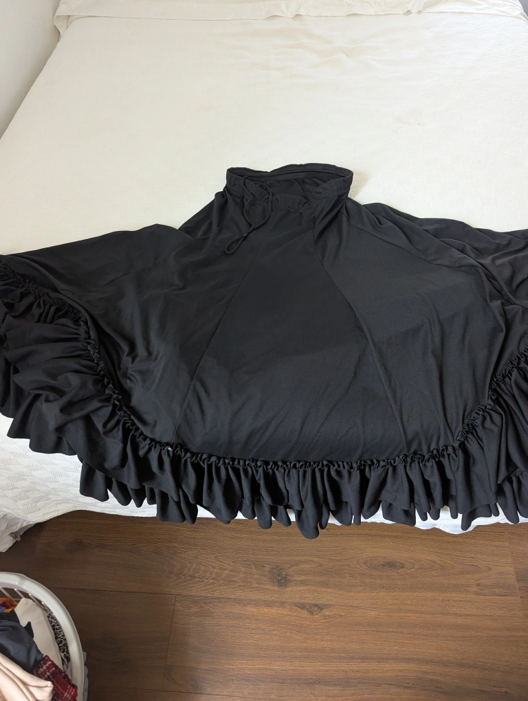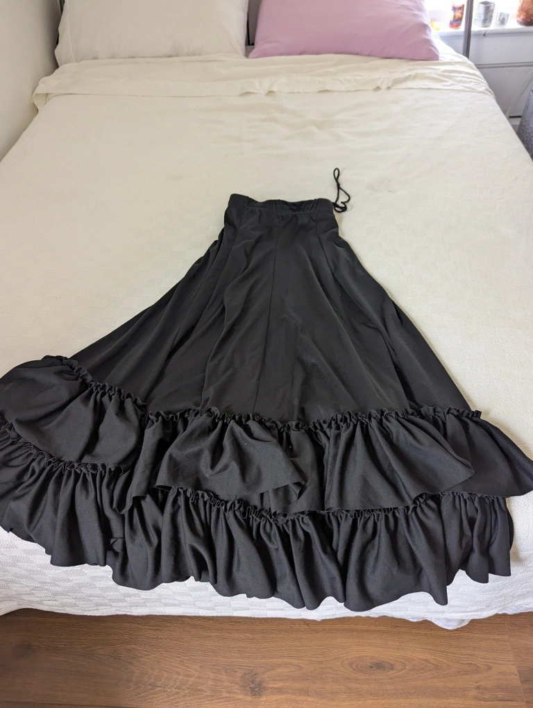 Selling a black Flamenco skirt. size adult large, but it's a drawstring. I'm usually a small and it fits fine. waist measures about 26 in, but is stretchy. length is about 35 inches. it's in great condition and ready for a new home! used very little, a long time ago. The skirt has a drawstring waist.