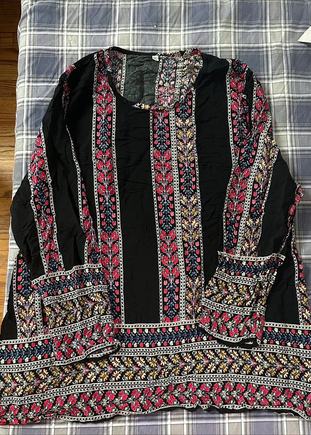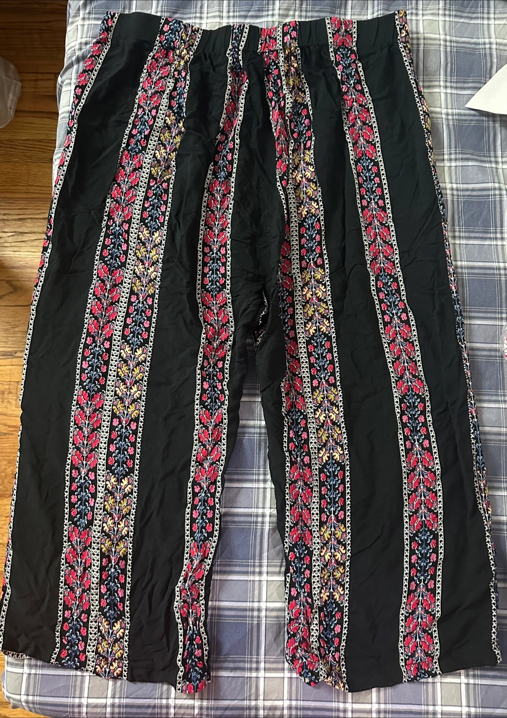 Selling a beautiful black top and pants set with a vibrant floral print. The set features a unique design and comfortable fit. Perfect for adding a touch of elegance to your wardrobe! The material feels soft and lightweight, making it ideal for everyday wear