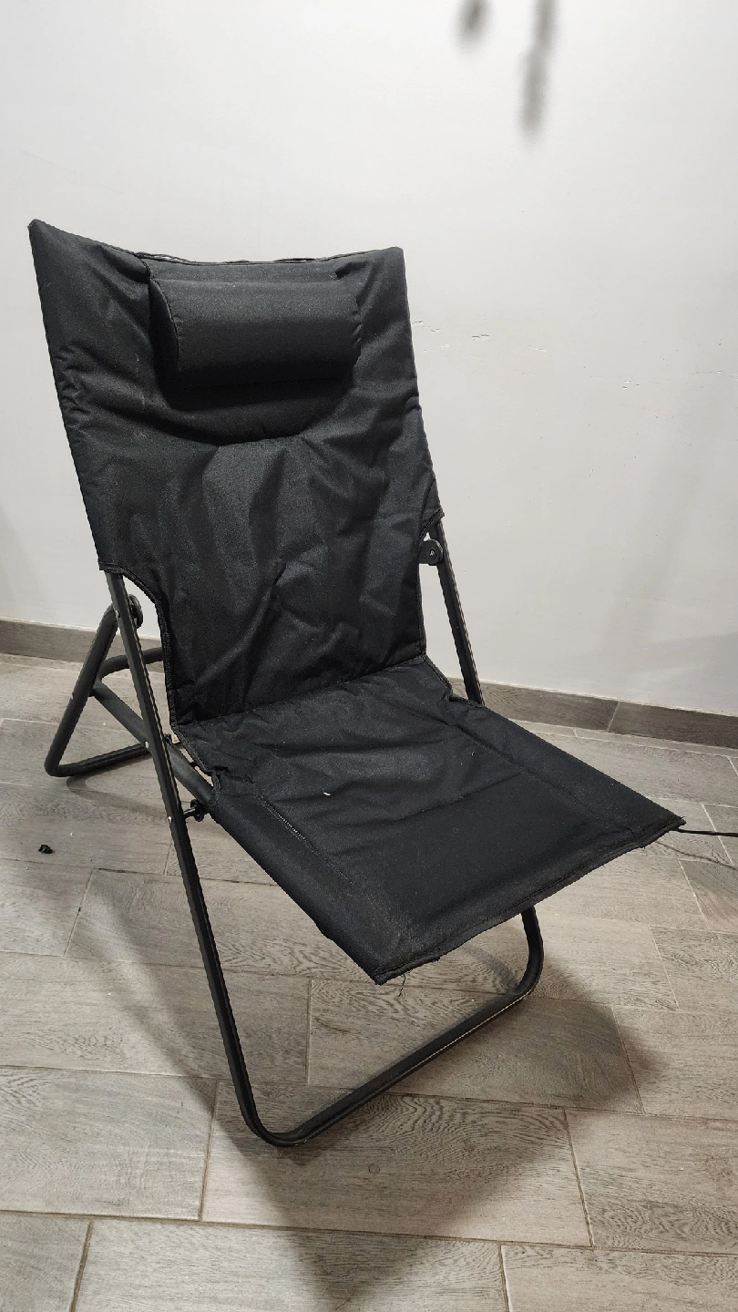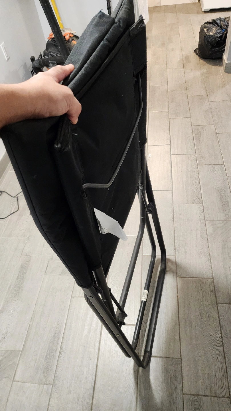 10I'm selling a black folding camping chair. It's lightweight and portable, perfect for outdoor activities. The chair is in good condition and ready for a new home