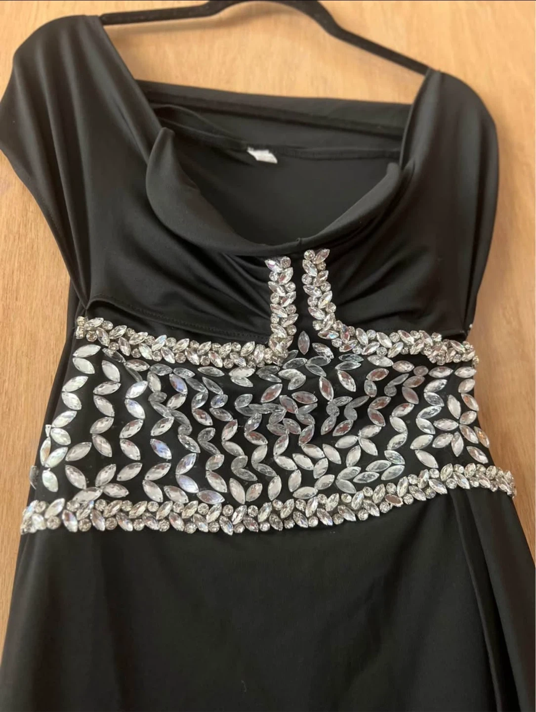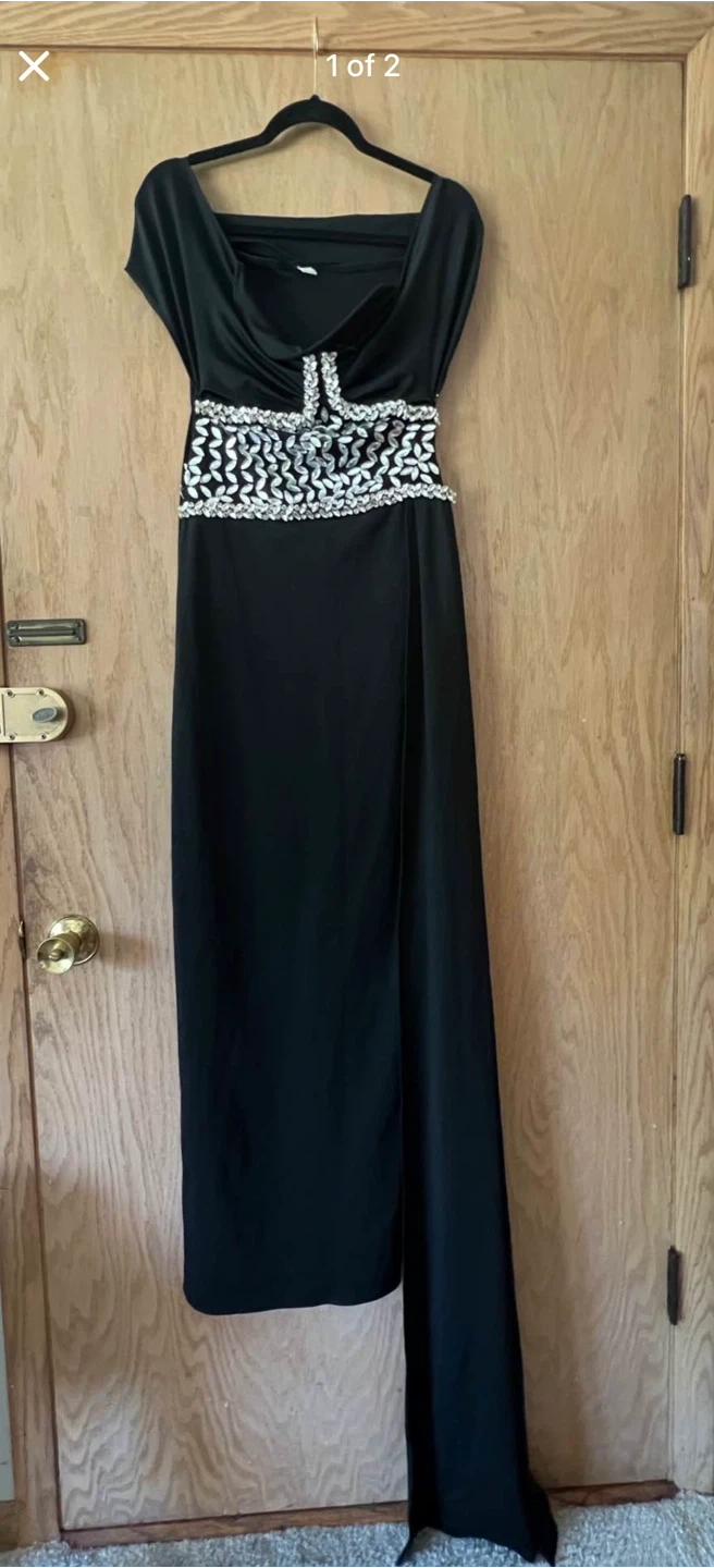 Selling a black formal dress with a silver beaded waistline. It's in great condition and ready for a special occasion! It has a cowl neck and a slit on the side.