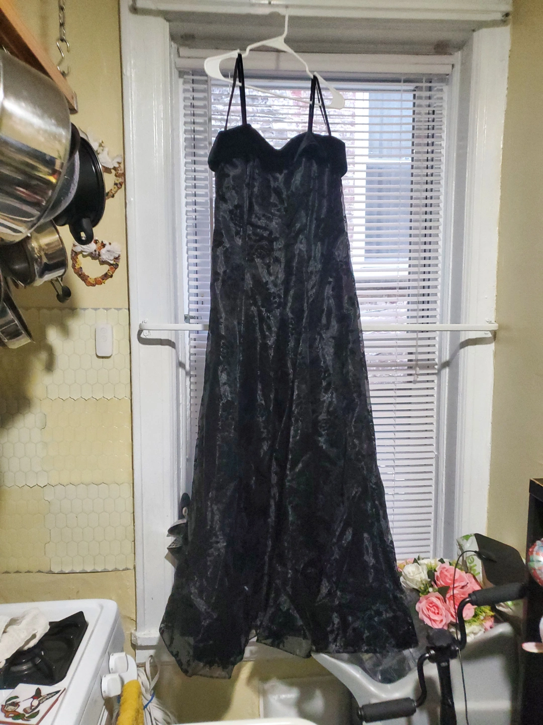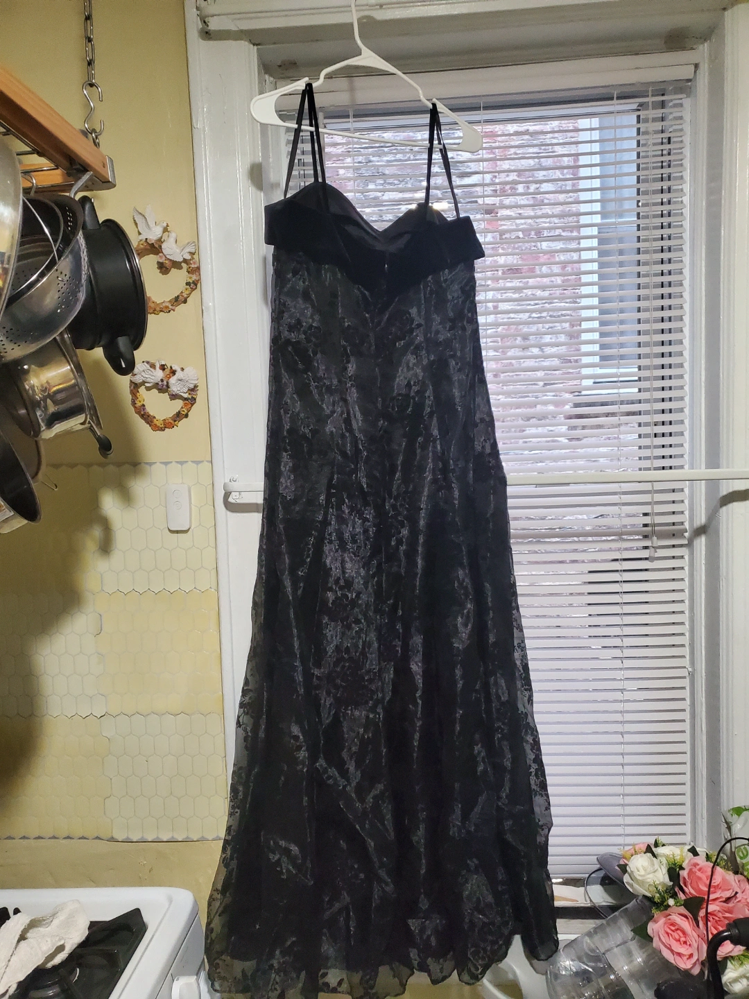 Long black formal dress. Strapless sweetheart neckline. Floral pattern throughout. A-line silhouette. Perfect for prom, wedding, or other formal event. Lace print through the gown!