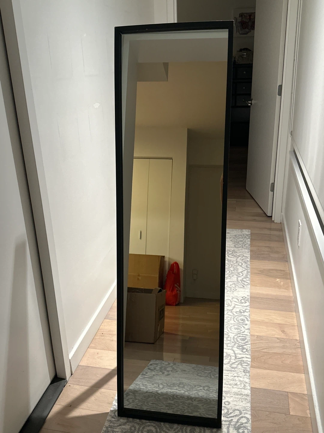 Selling a full-length mirror with a sleek black frame. It's in great condition and ready to brighten up your space! Perfect for bedrooms, dressing rooms, or entryways to give you a full view. Moving sale. Pick up please. Thank You