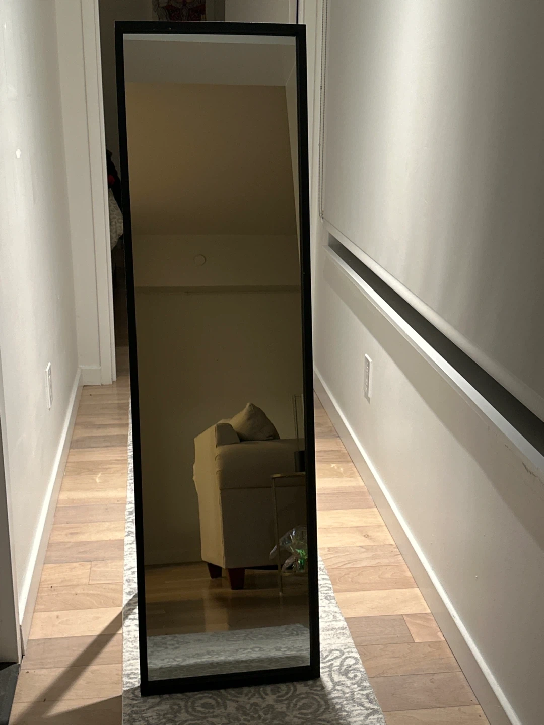 Selling a full-length mirror with a sleek black frame. It's in great condition and ready to brighten up your space! Perfect for bedrooms, dressing rooms, or entryways to give you a full view. Moving sale. Pick up please. Thank You