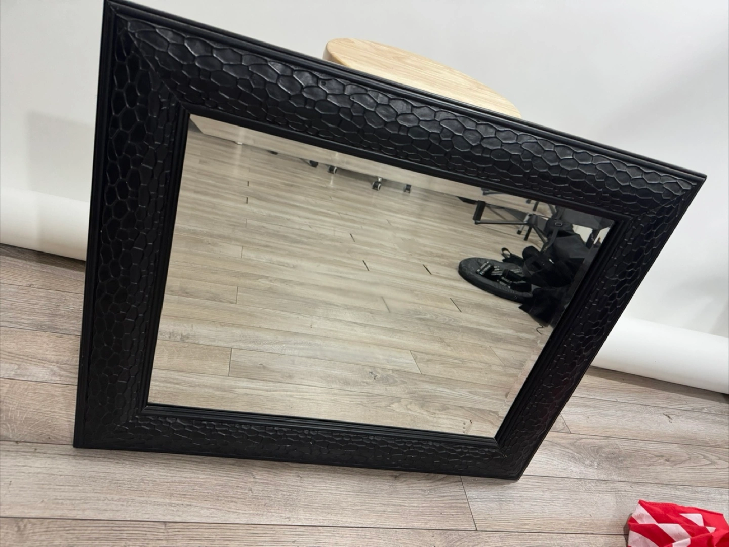 Rectangle mirror. Black frame with textured pattern. Ready to hang. Wall decor. Nice addition to any room.