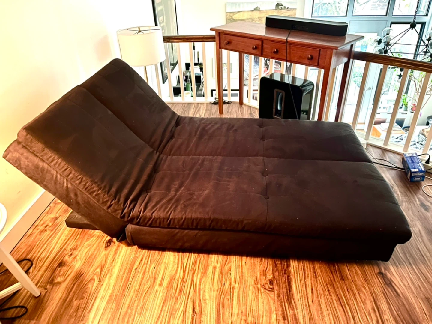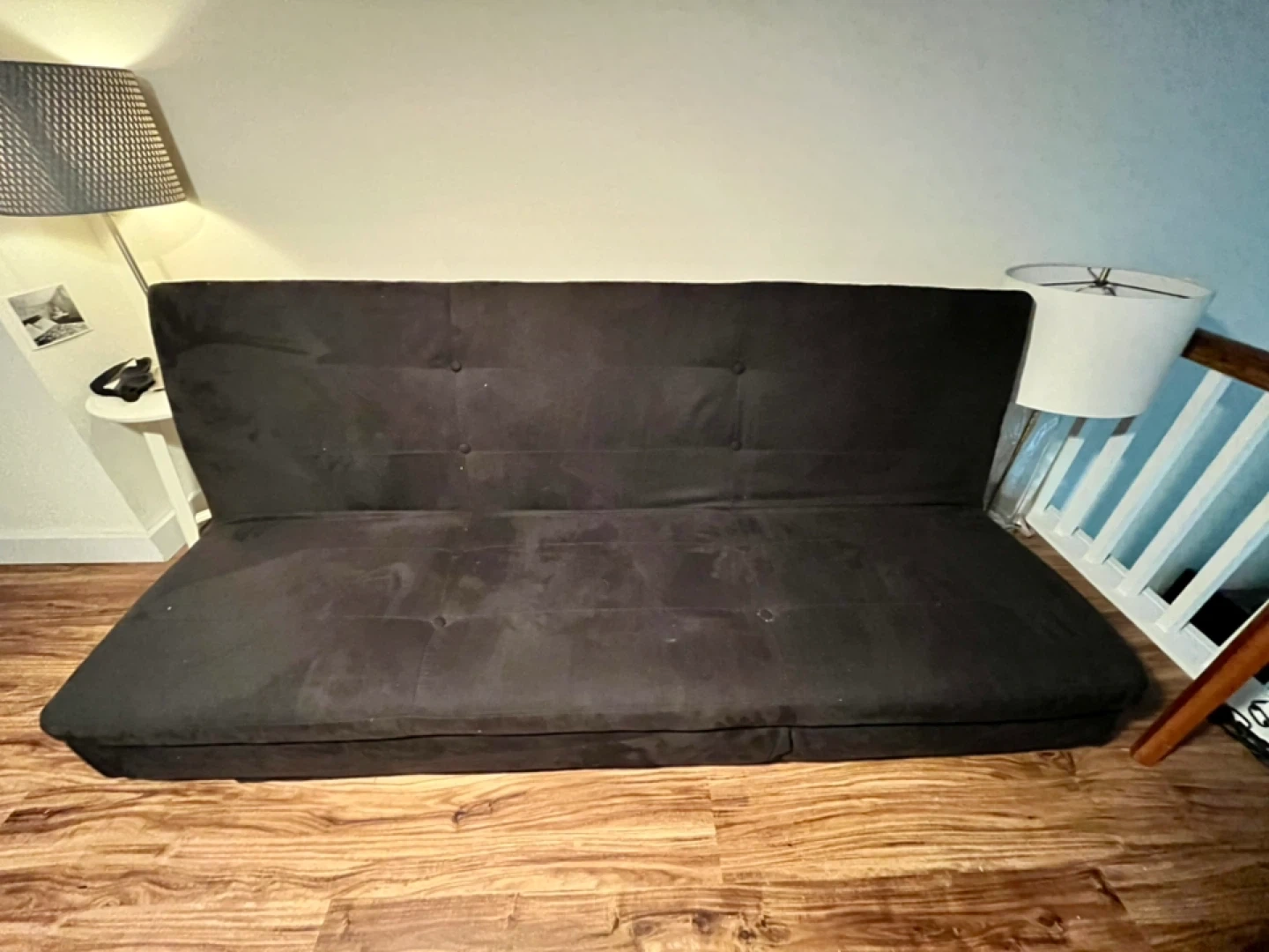 Selling a black futon sofa bed. It's in good condition and ready for a new home! Perfect for small spaces or as an extra bed for guests. It can be used as a sofa or folded up or down into a chair, sofa or flat bed. Pretty lightweight, need 2 people to pick up. It’s currently in our loft space, but we can help lower it down. Our apt is on the first floor so no walk-ups 😄