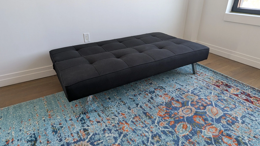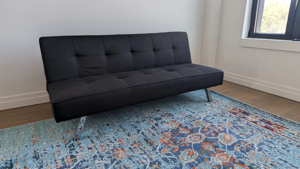 Selling a black futon sofa bed! It's in great condition and perfect for a living room or guest room. The futon easily converts from a sofa to a bed, making it ideal for small spaces. It has a sleek and modern design that will complement any decor Flattened dimensions 66x38"