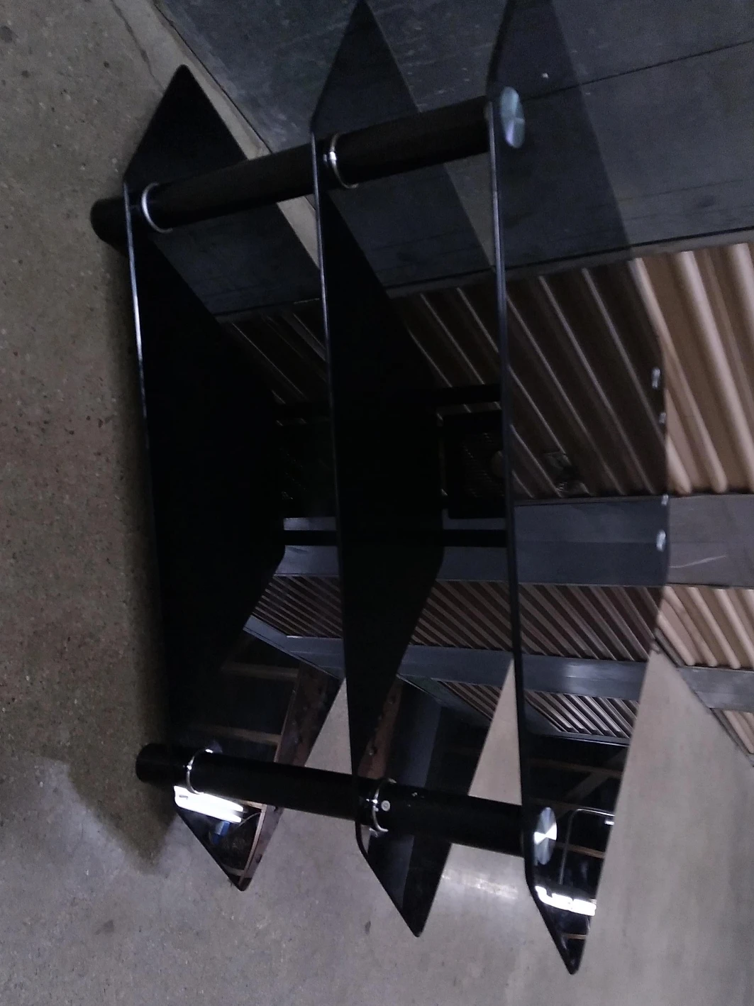 This is a black Glass shelving unit. TV Home Entertainment Unit It looks like it could be used for storage or display. It features a sleek, modern design with clean lines. It's in good condition and ready for a new home