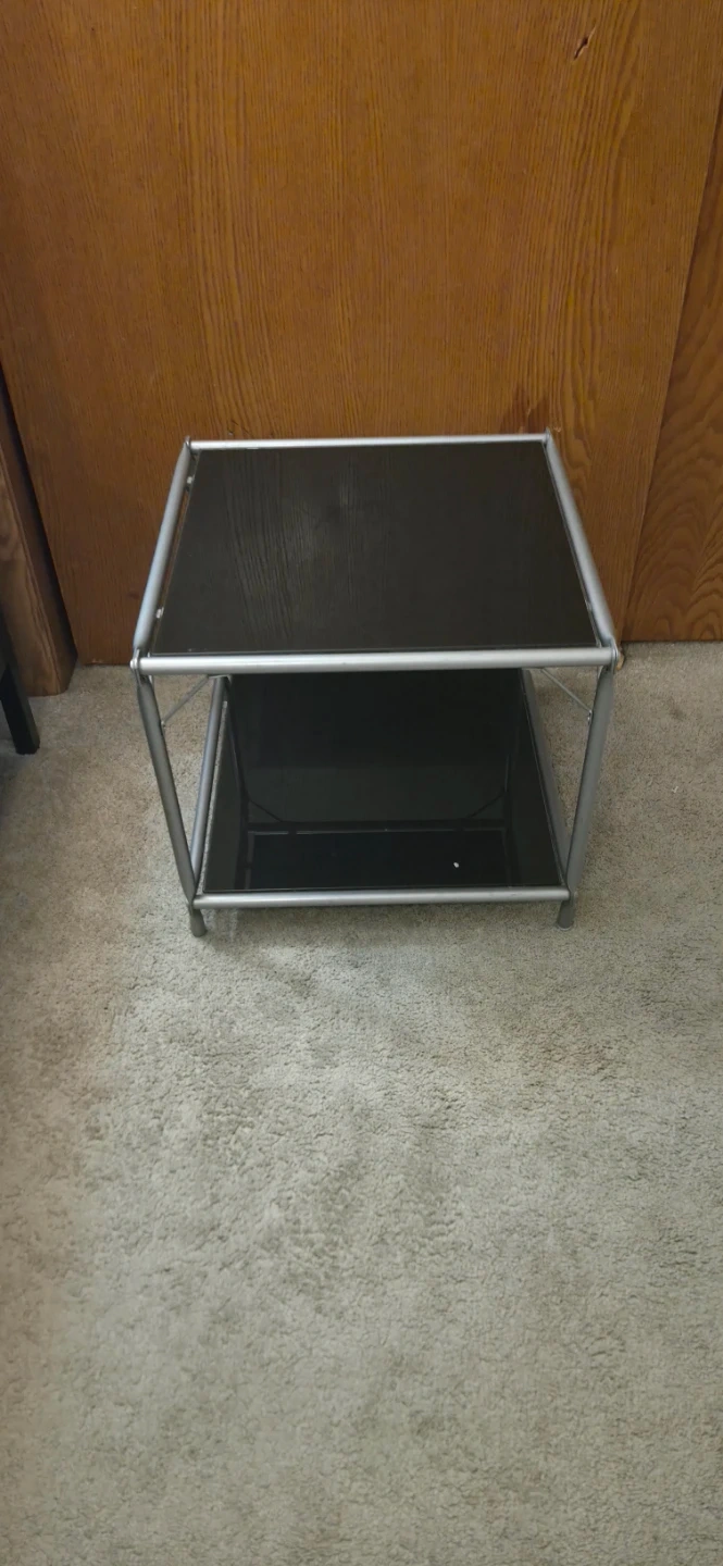 60Here's a side table with a black glass top. It has a sleek and simple design that could fit into various room settings. The frame appears to be a silver color, adding a touch of modern style to the overall look