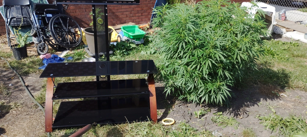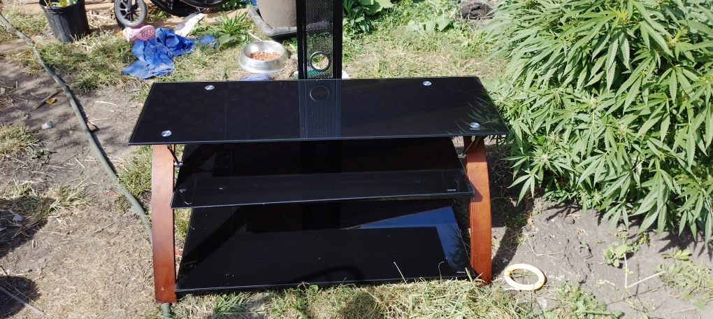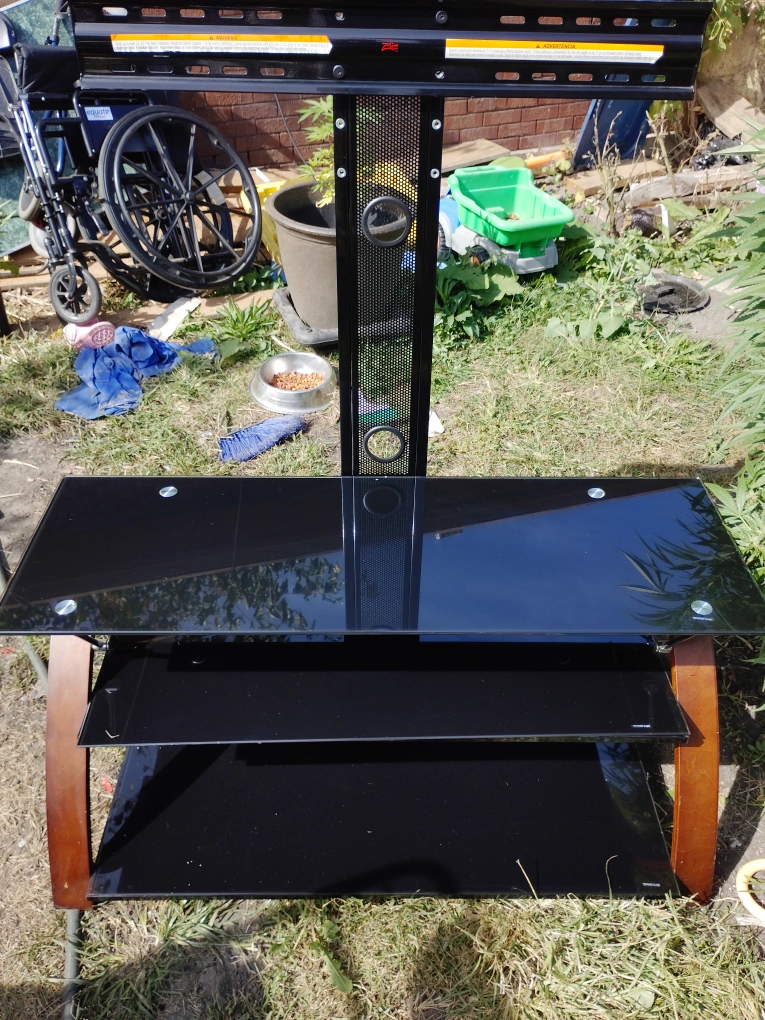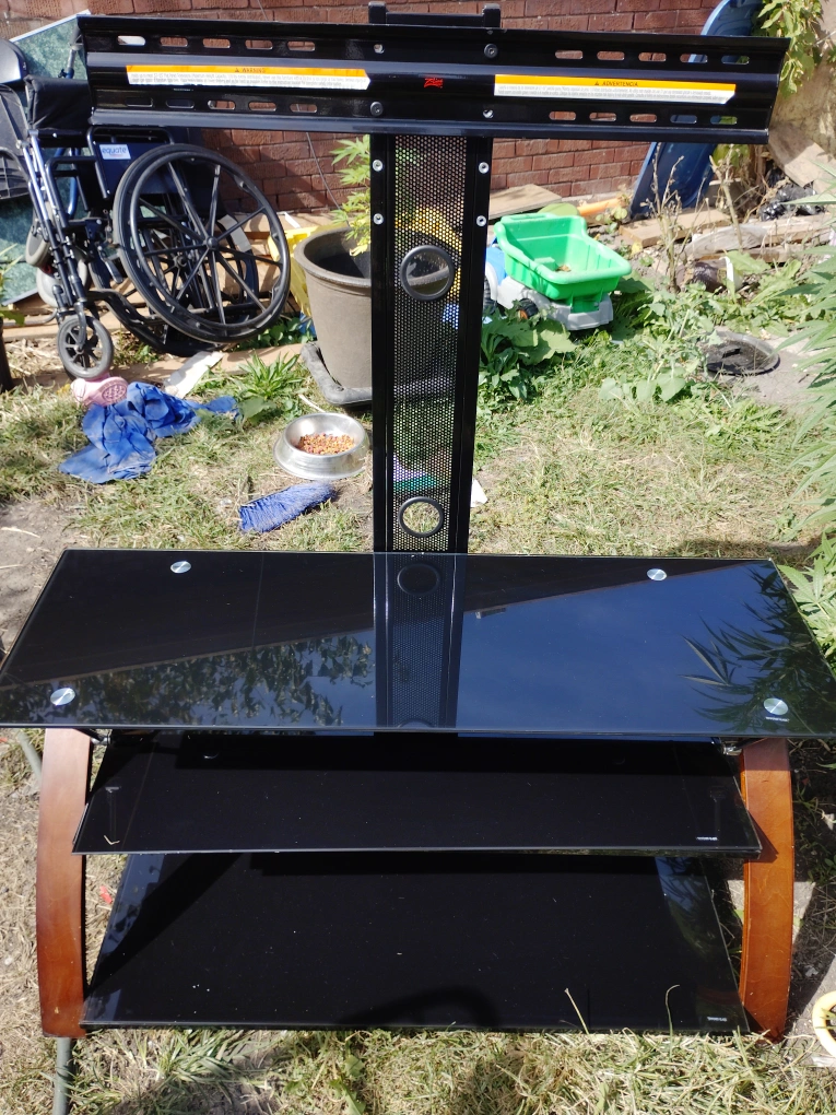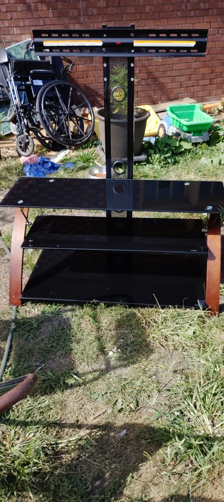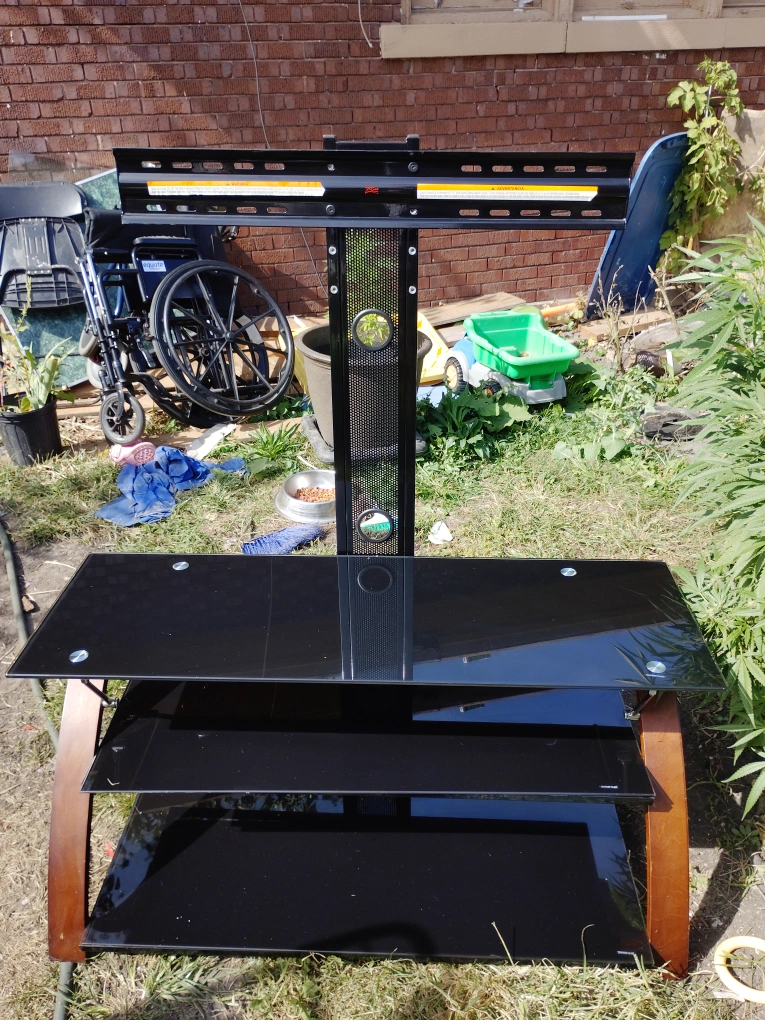 Selling a black glass TV stand. It has a sleek design with black glass shelves and a dark wood frame. It also has a mount for the TV!