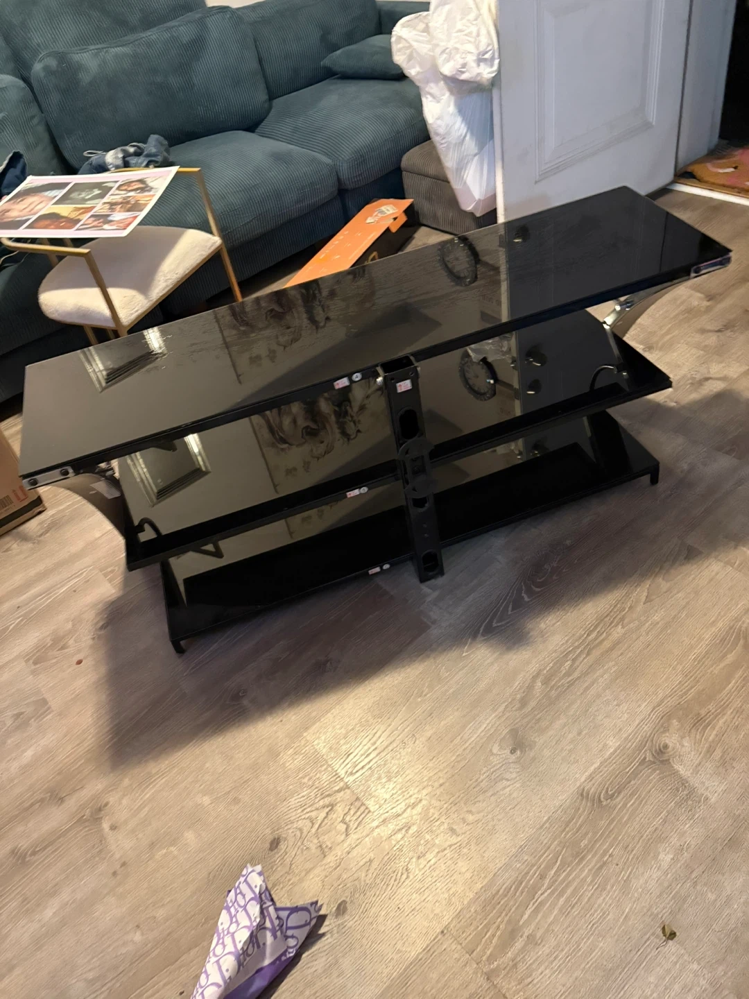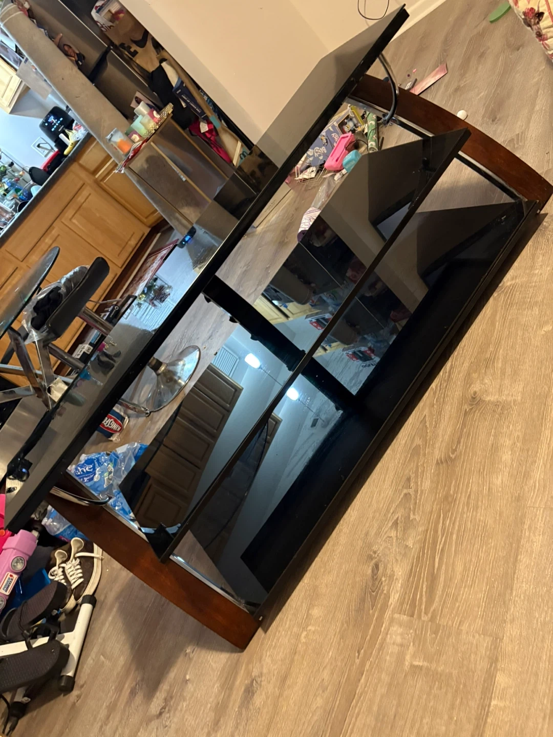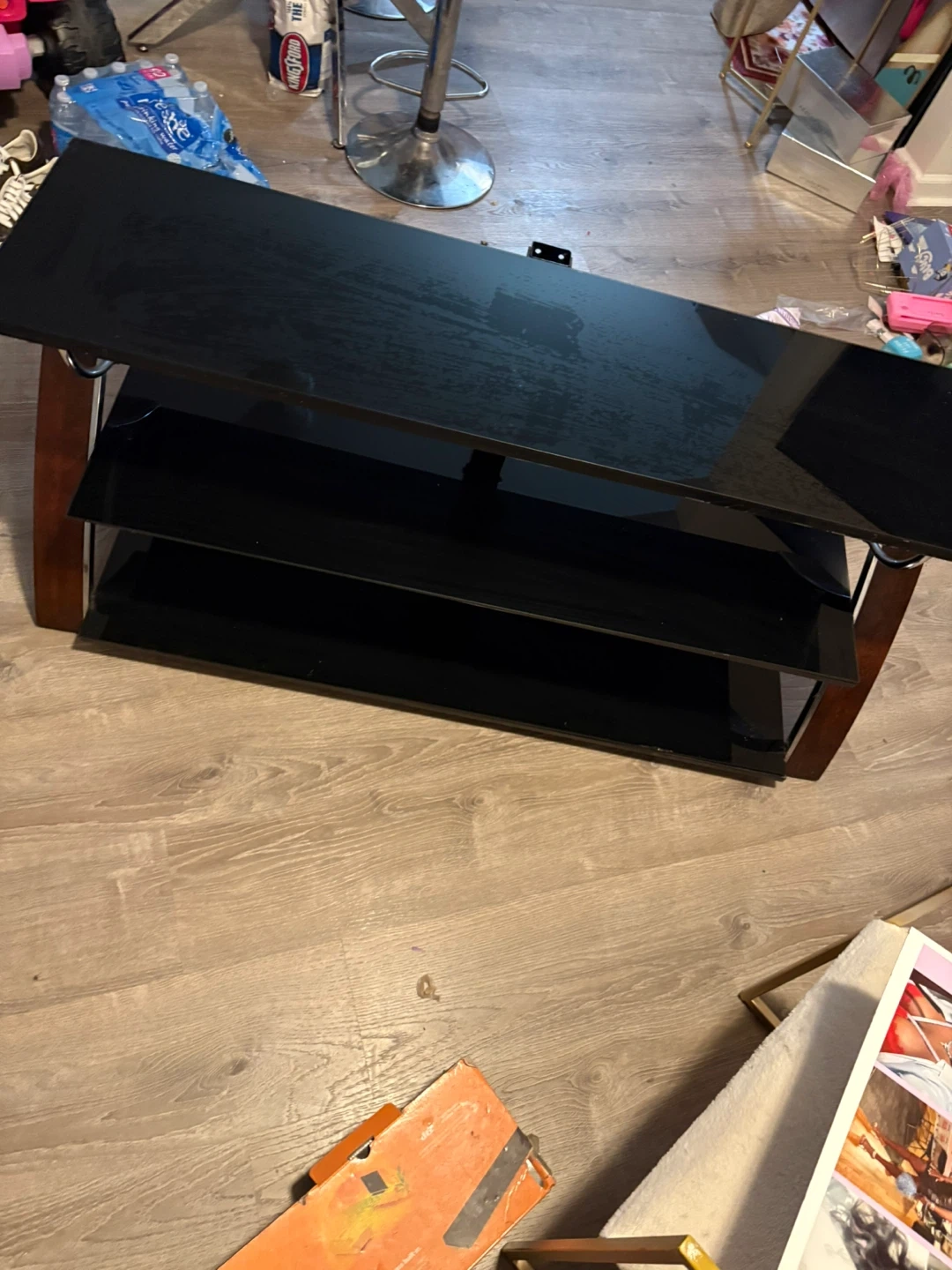 10Selling a sleek black glass TV stand with wood accents! It features multiple shelves for your media devices and a modern look. It's in good condition and ready to upgrade your living room setup