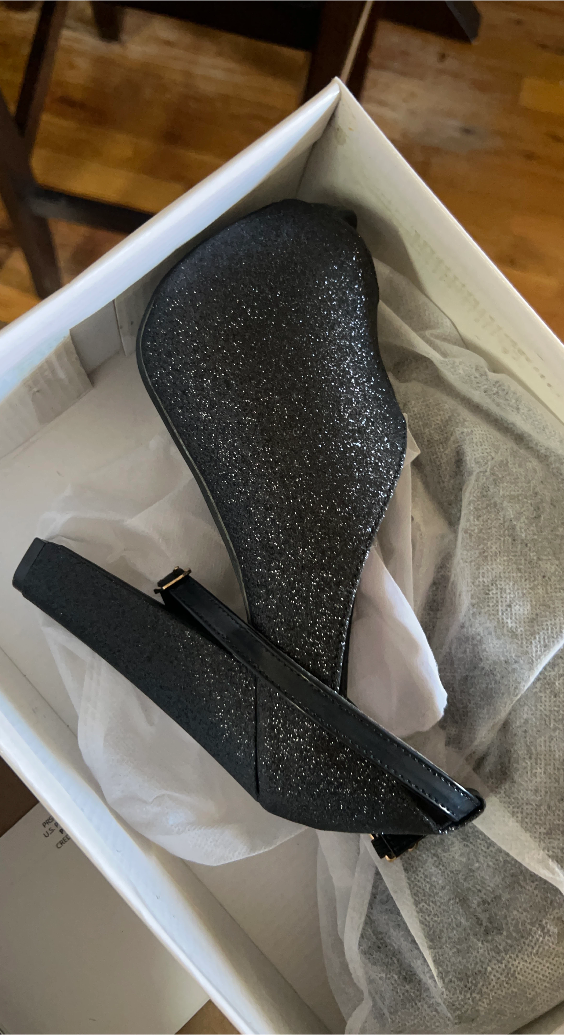 72These black glitter heels are a fun addition to any outfit! They're a size 8 and come with their original box. Perfect for a night out or a special occasion