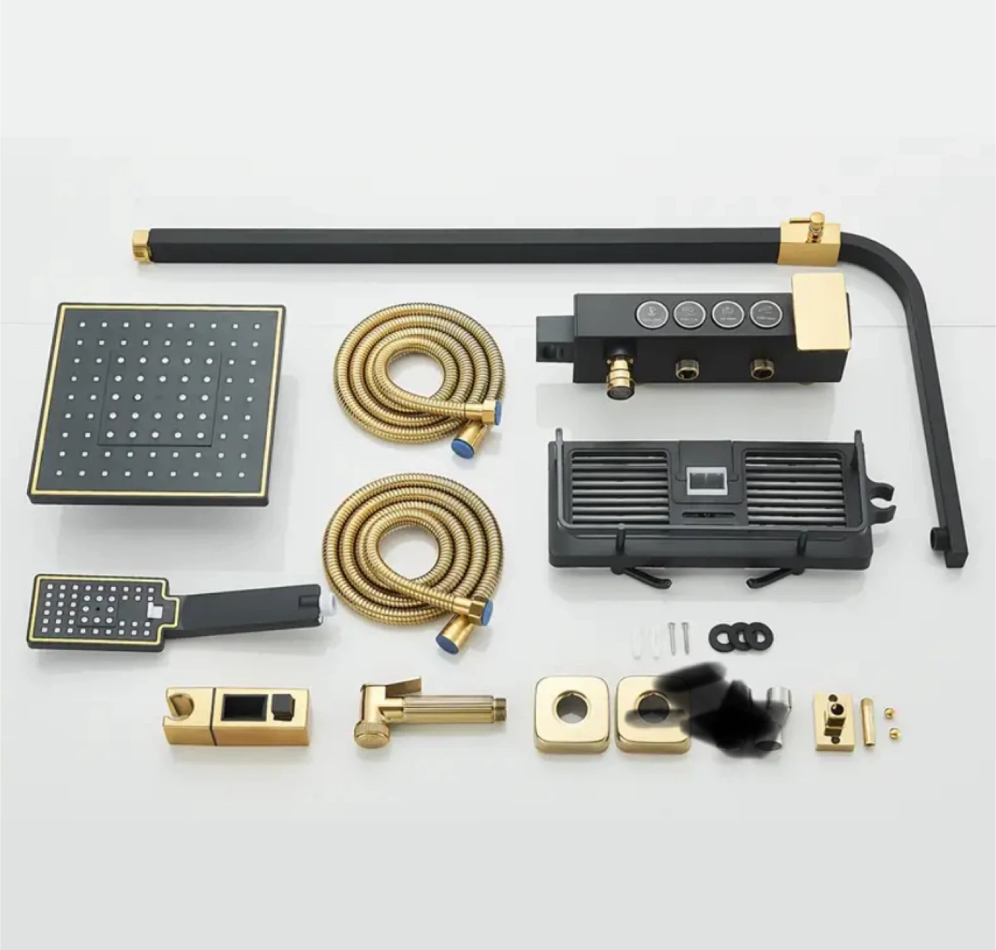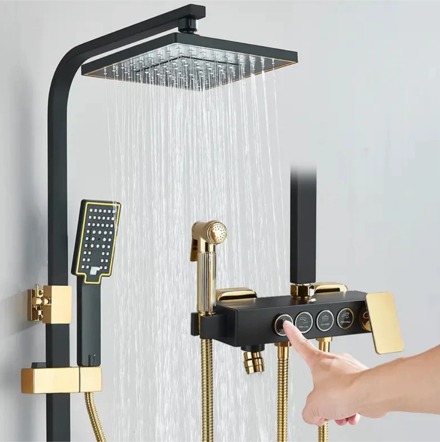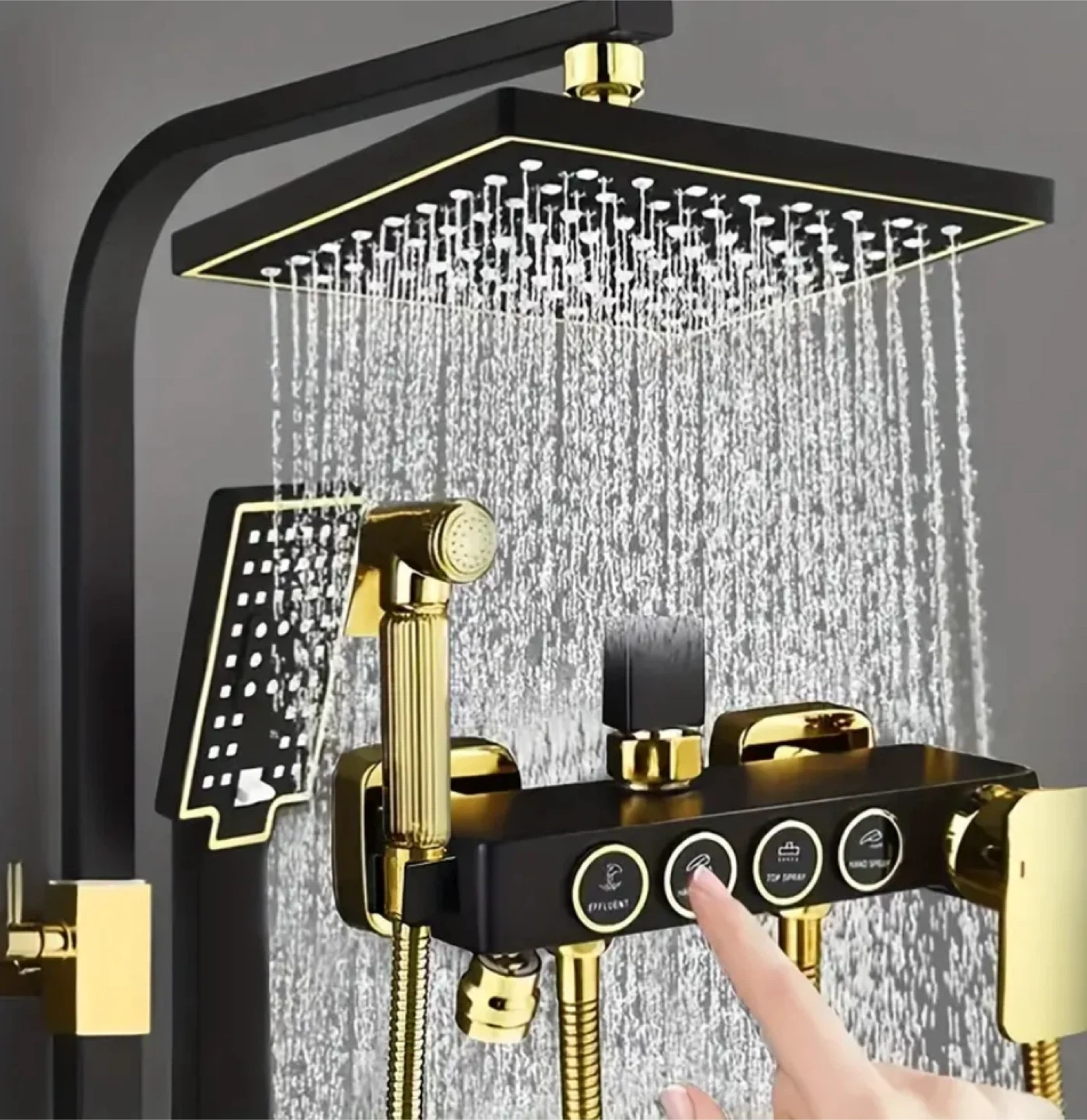 Selling a stylish black and gold shower panel system! It includes the overhead rainfall shower, handheld shower, and bidet sprayer. This system adds a touch of modern luxury to any bathroom