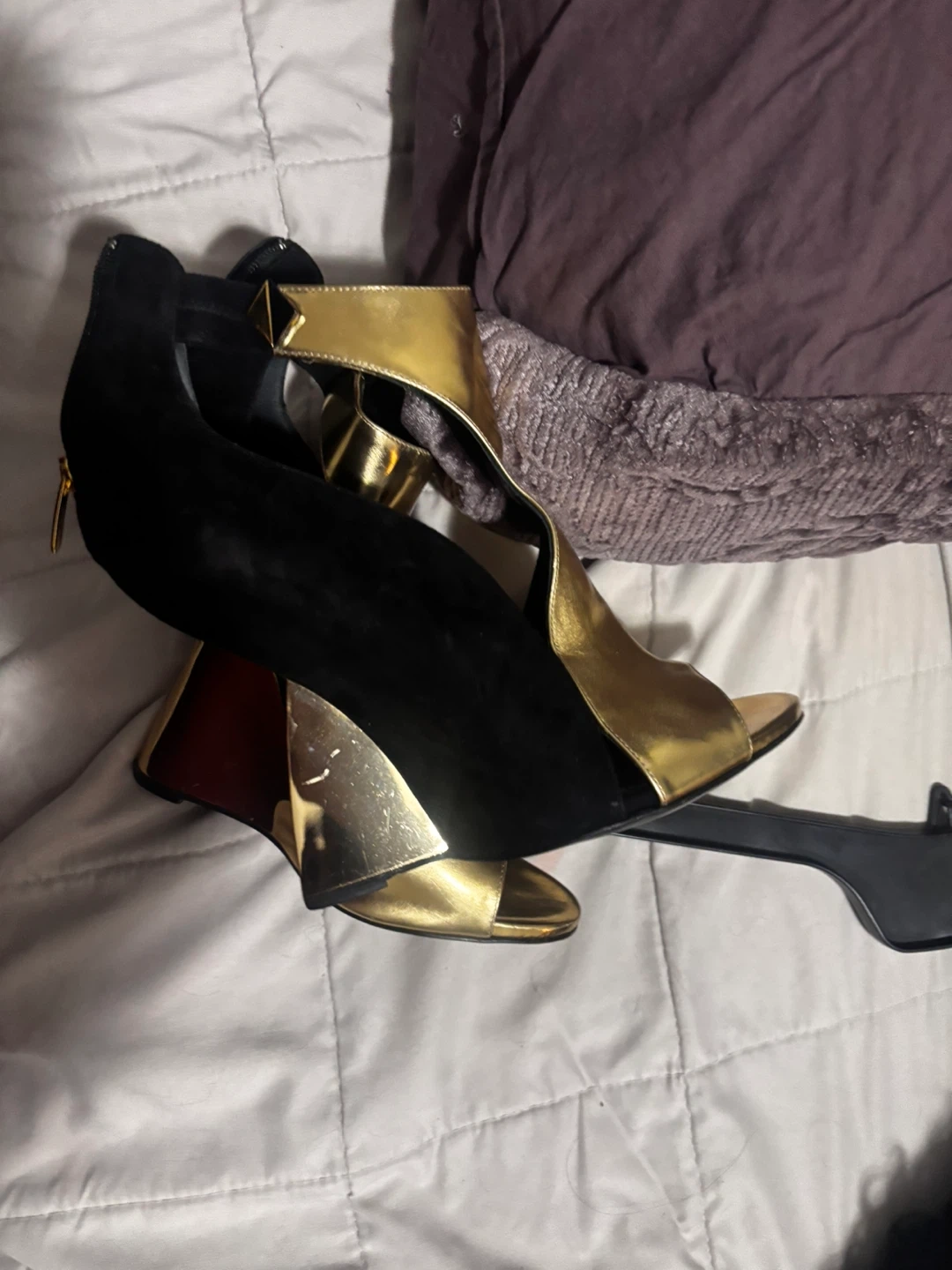 70Stylish black and gold wedge heel shoes! They're in great condition and ready for a new home