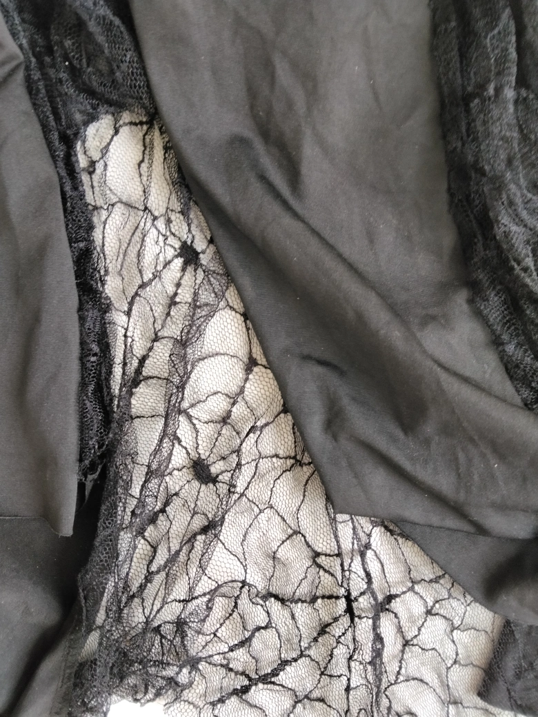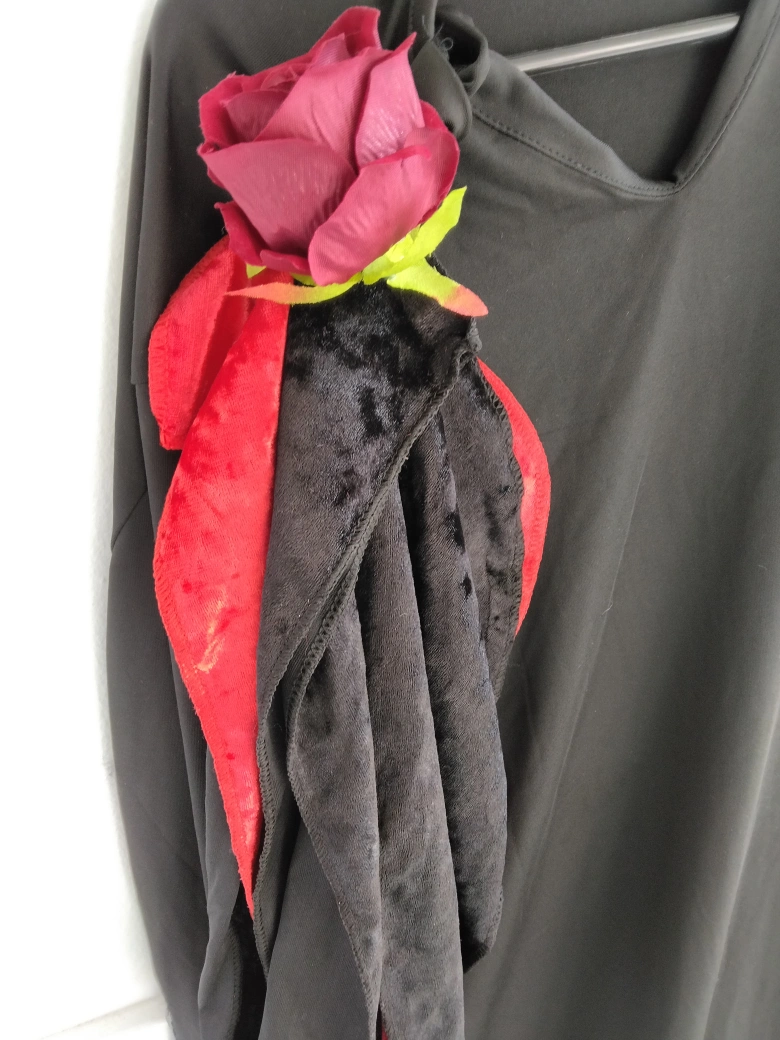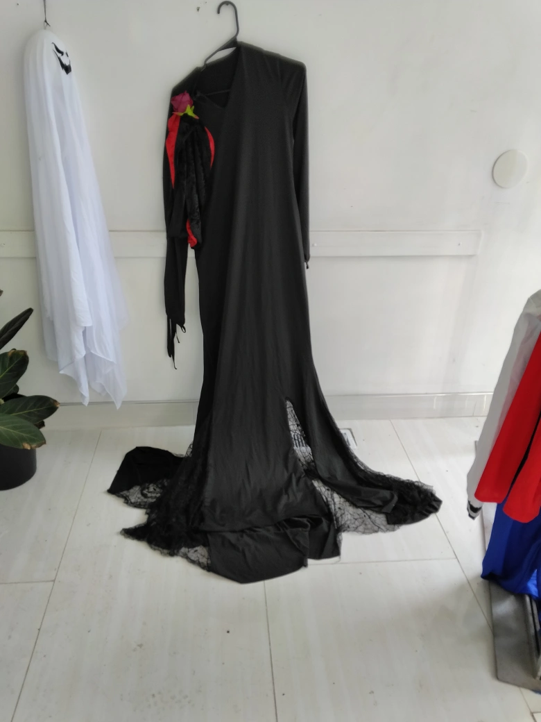 Selling a black Halloween costume dress. New condition and features a rose detail on the shoulder and lace accents near the bottom. Perfect for Halloween! May fit XLarge - 2xL
