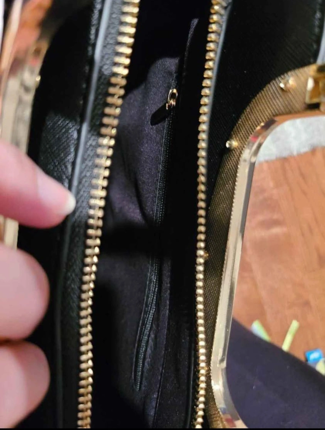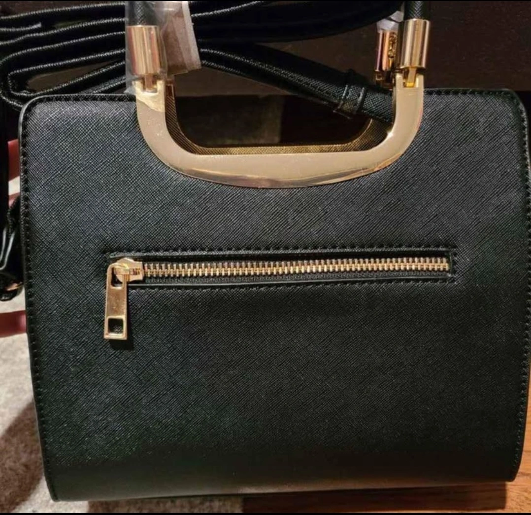Small black handbag. Gold-tone hardware. Top handle and removable shoulder strap. Zipper closure. Interior pocket. Protective plastic still on handle.