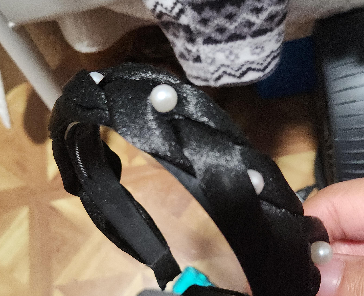 10This is a cute black headband, adorned with small pearl accents. It's in great condition and ready to add a touch of elegance to your hairstyle!