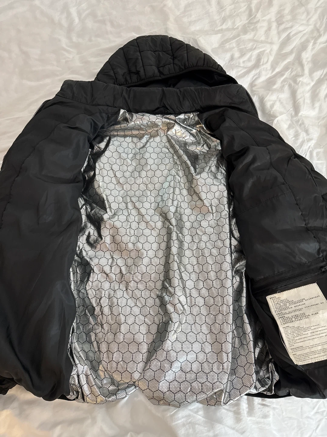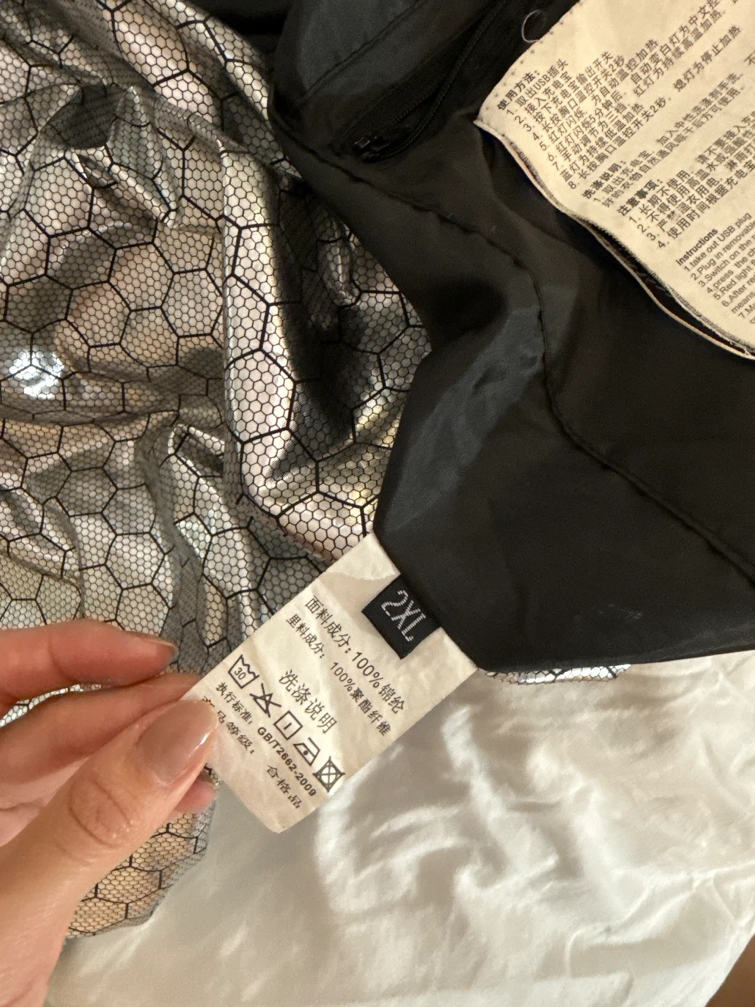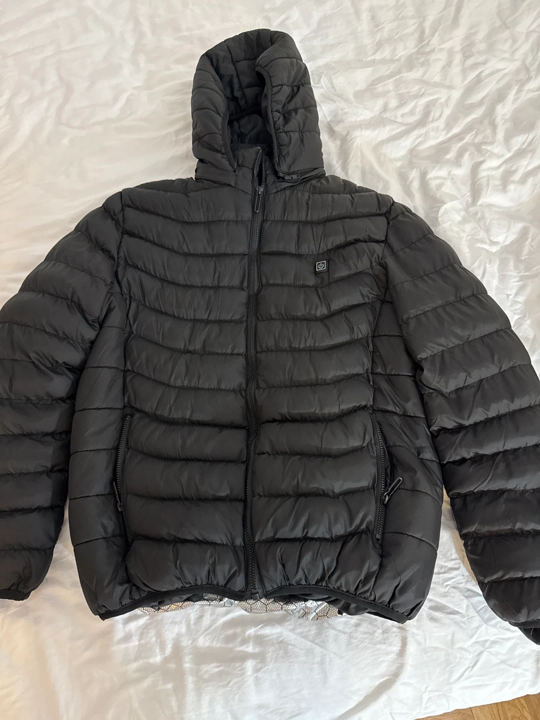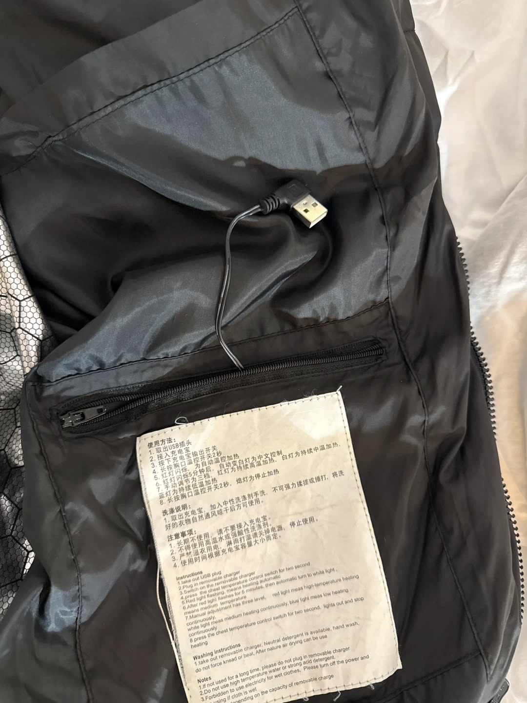 10Selling a black heated puffer jacket in size 2XL. It features a USB plug for charging to get warmer and has a unique silver interior lining. It's made of 100% polyester